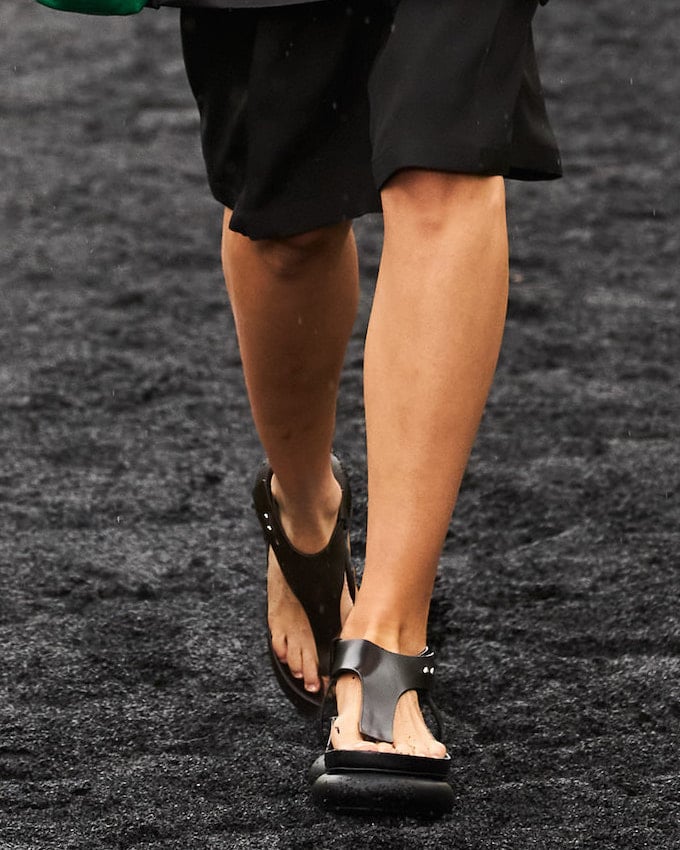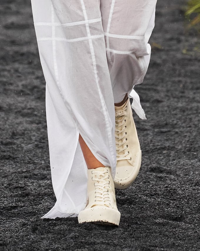 足元は、底がゴムで覆われたバルカナイズドスニーカーがスタイリングのポイントに。キャンバスやレザーのほか、ウェアと共布のテキスタイルの豊富なスタイルでそろう。他にもレザーサンダルやチェルシーブーツ、丸みのあるソールが特徴的なロングブーツなどもお目見え。