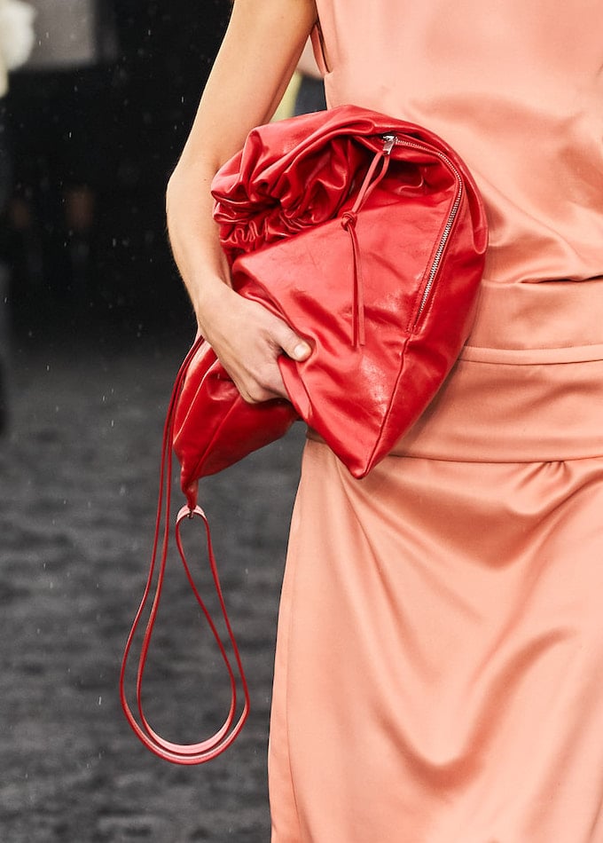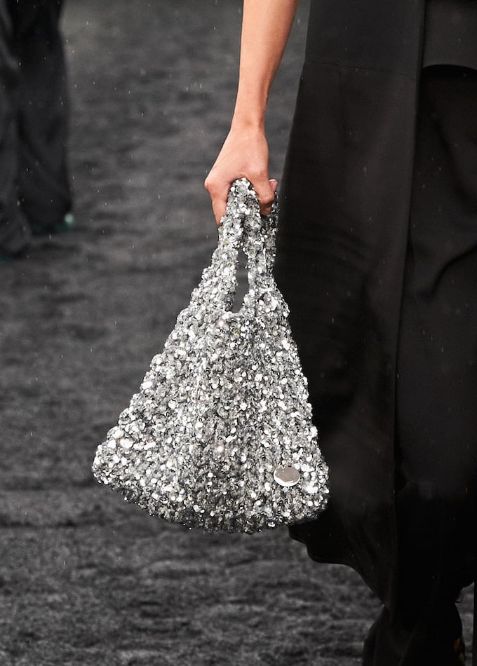 バッグはカラフルで、新作が豊作。ゴールドやシルバーのチェーンをハンドルに用いたハンドバッグや、レザーのドローストリングバッグは、レッドやイエロー、グリーン、パープル、ブラックなど多色で展開する。またスパンコールがついた糸で編み込んだショッピングバッグや、フェザーをあしらったクラッチバッグ、カリフォルニアの夕空を表現したようなグラデーションの色が映えるバッグなども目を引いた。