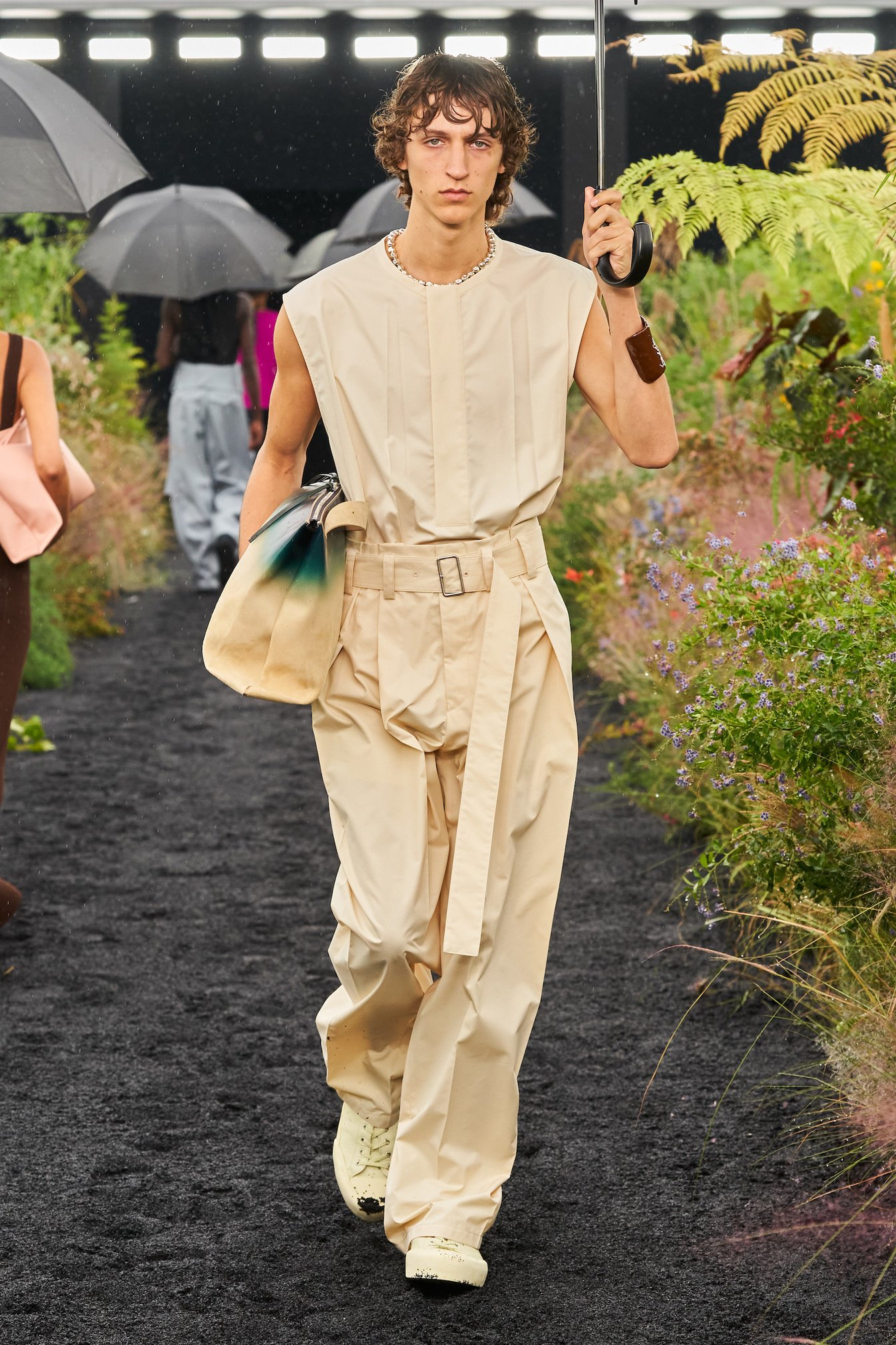 ショーの序盤はジャケットとワイドシルエットのパンツのセットアップが続く。アイボリー、スモーキーグリーン、イエロー、ピンクなど、華やかながら落ち着いたカラーパレットがポイントだ。メンズもウィメンズと同様に、ジャケットのセットアップや、ノースリーブのトップやドレスを提案している。ブランドらしく、一見ミニマルだがパンツの裾にビジューを装飾したり、トップスには華やかにスパンコールを施していたりと、ジル サンダー流のハリウッド・グラマーが表現されている。
