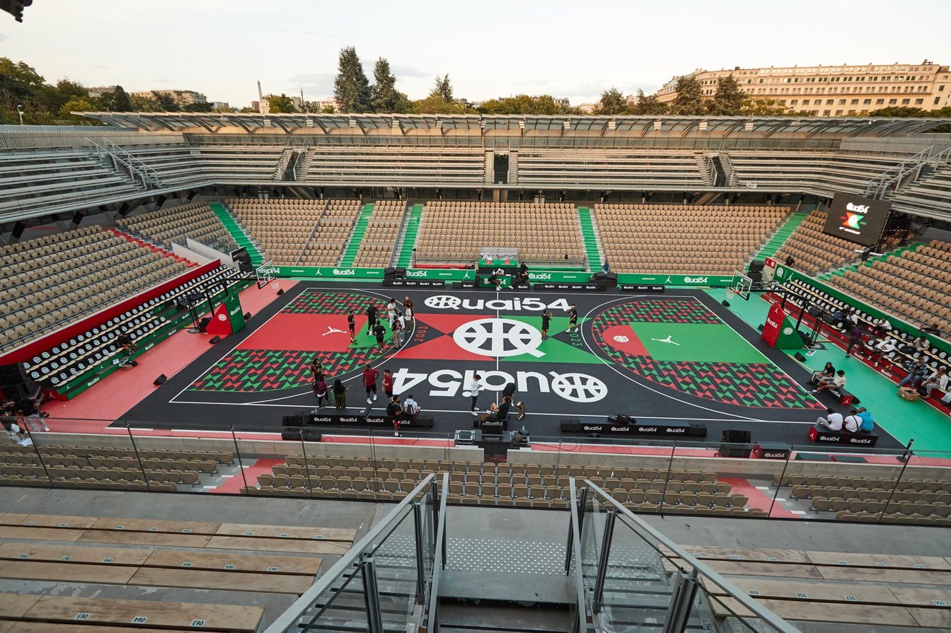収容人数は約5000人。全仏オープンを象徴するクレイコート(赤土)が特徴ですが、今回は上からQuai 54のシートを敷いてバスケコートを作り上げていました。