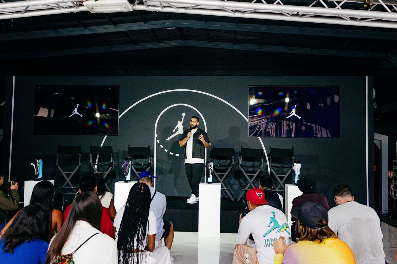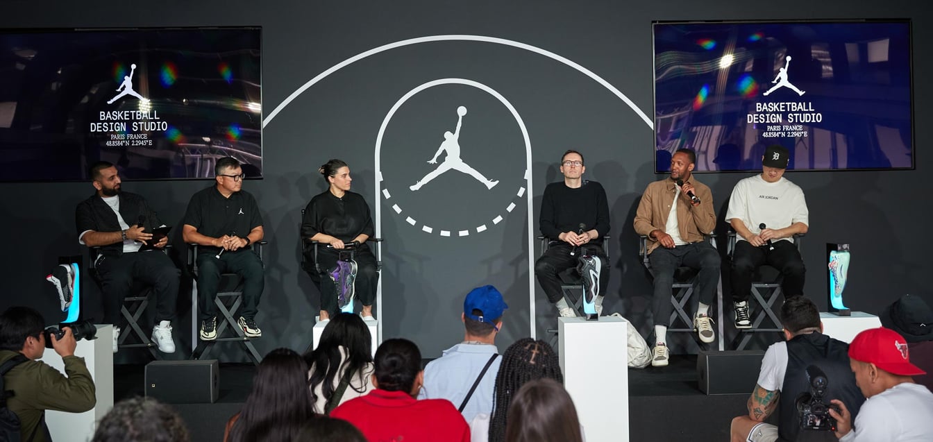 用意されていたステージでは、素材やカラー担当をはじめジョーダン ブランドのデザインチームが登壇し、トークショーが行われました。ジョーダン ブランドの物作りは、コートの中はもちろんのこと、ファッションや音楽、アート面でも大きな影響力を持つマイケル・ジョーダンをインスピレーション源に、「モーションとエモーション」をキーワードに設定しています。モーションの機能面で優れたプロダクトでありながら、エモーションのアスリートの根底にある精神性を表現して感情面に訴えかける物作りを意識しているそうです。