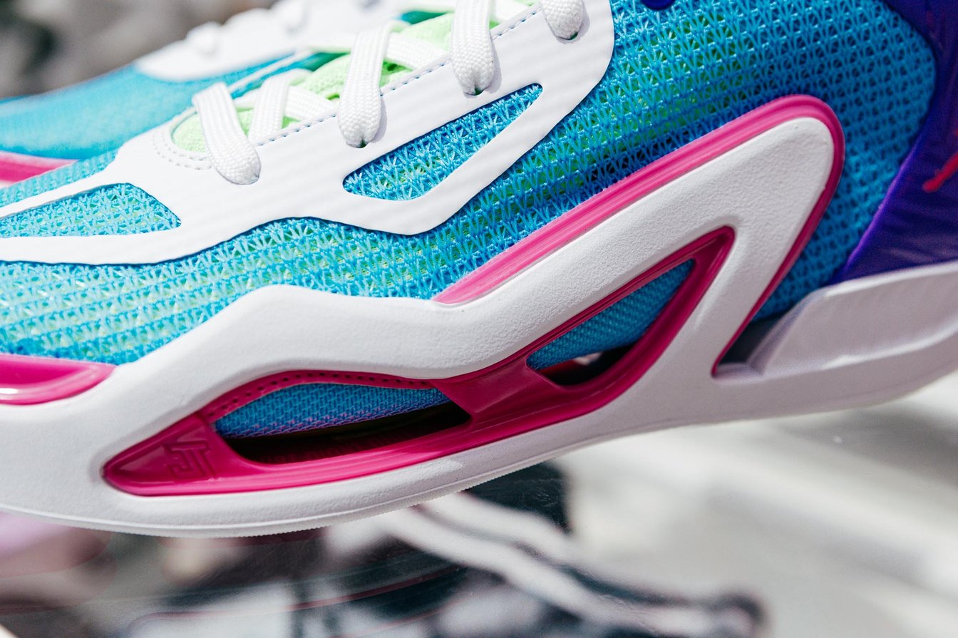 ここからは展示されていたシューズを紹介。まずは昨日着用したエア ジョーダン38。エア ジョーダンシリーズは、長い歴史を持ちながら次世代のプレイヤーたちに向けて最先端のイノベーションを提供するシリーズとしても展開しており、今回はフェイダウェイ・ジャンパーをはじめとするマイケル・ジョーダンを象徴するプレイを研究して、コートでの機動性で相手に差をつけることを強みとしています。ここ数年のエア ジョーダンシリーズでは、空洞があるソールの「エクリプス プレート」が特徴的でしたが、同作はピボットやカット、ディフェンスのための横の動きをスムーズにするため、これまでのプレートを進化させた新技術「Xプレート」を搭載し、薄めのソールで作られました。アッパーはメッシュのような刺繍地で作られており、通気性と軽量性を保ちながら、優れたフィット感に繋がっています。着用すると、ブレのないフィット感を強く感じました。8月18日に販売を開始します。