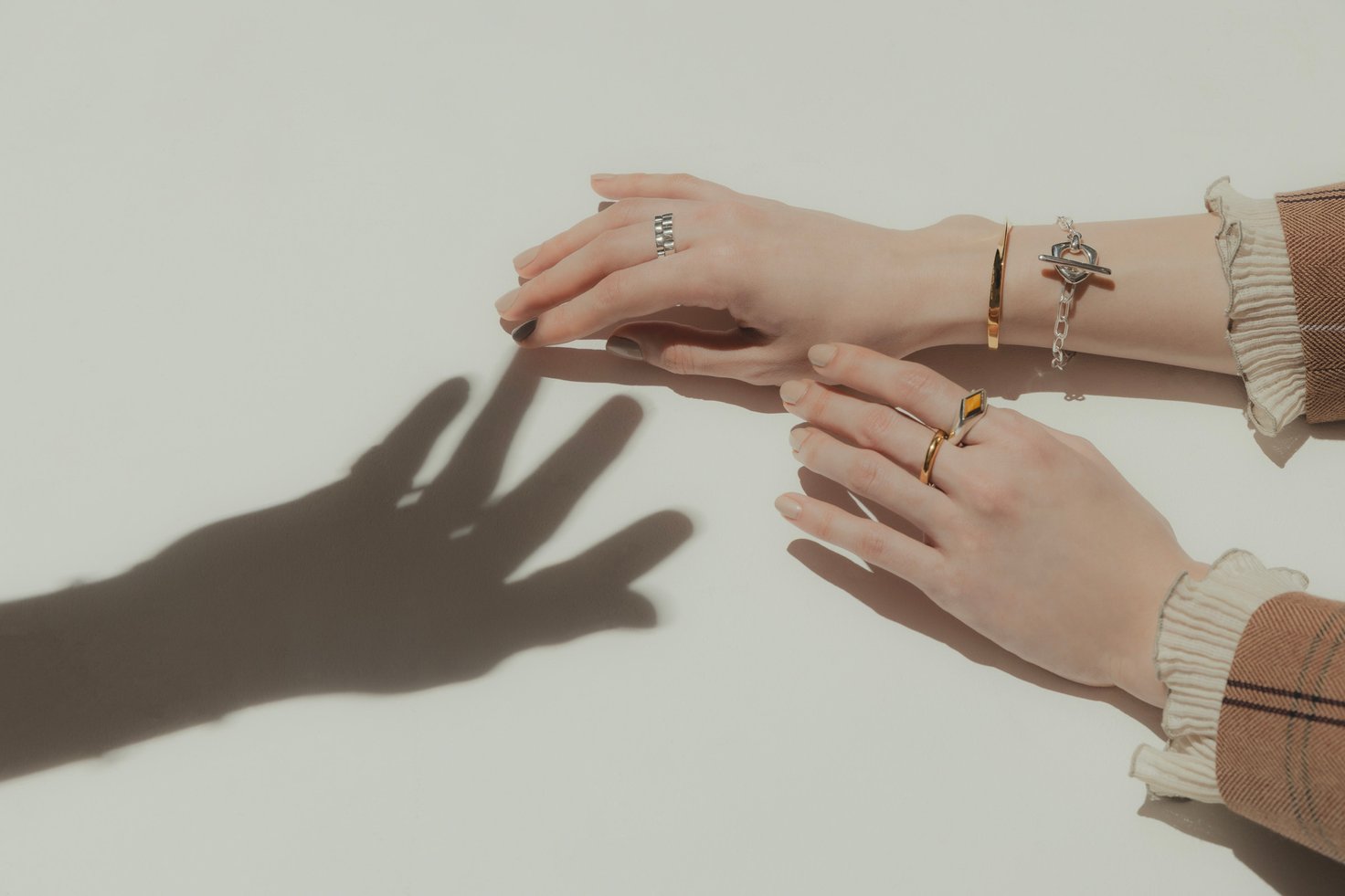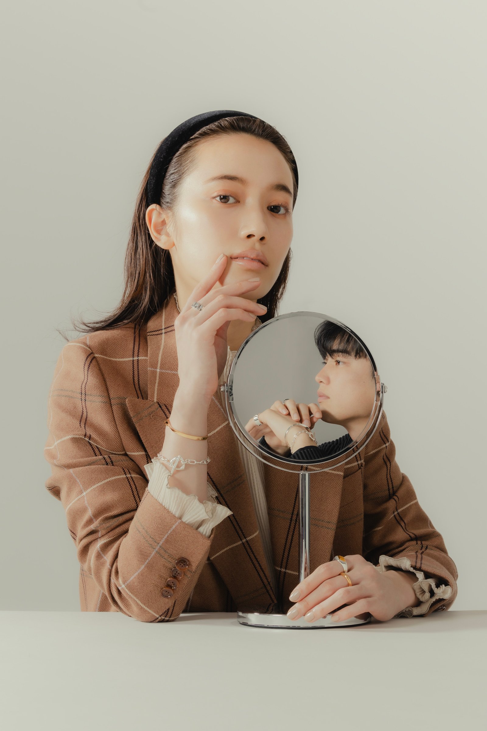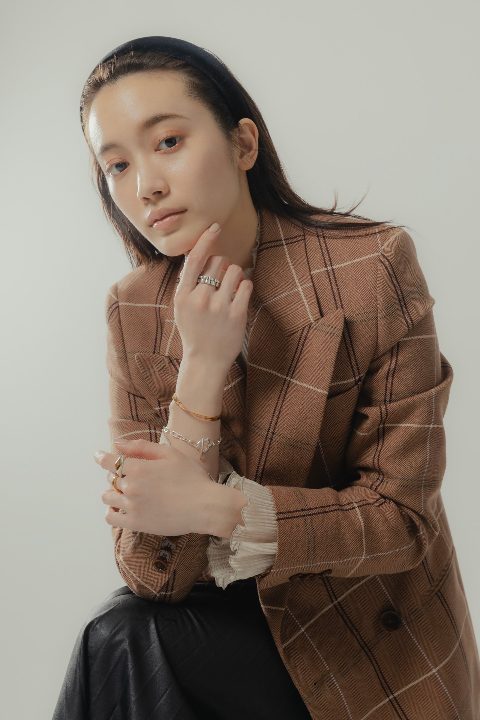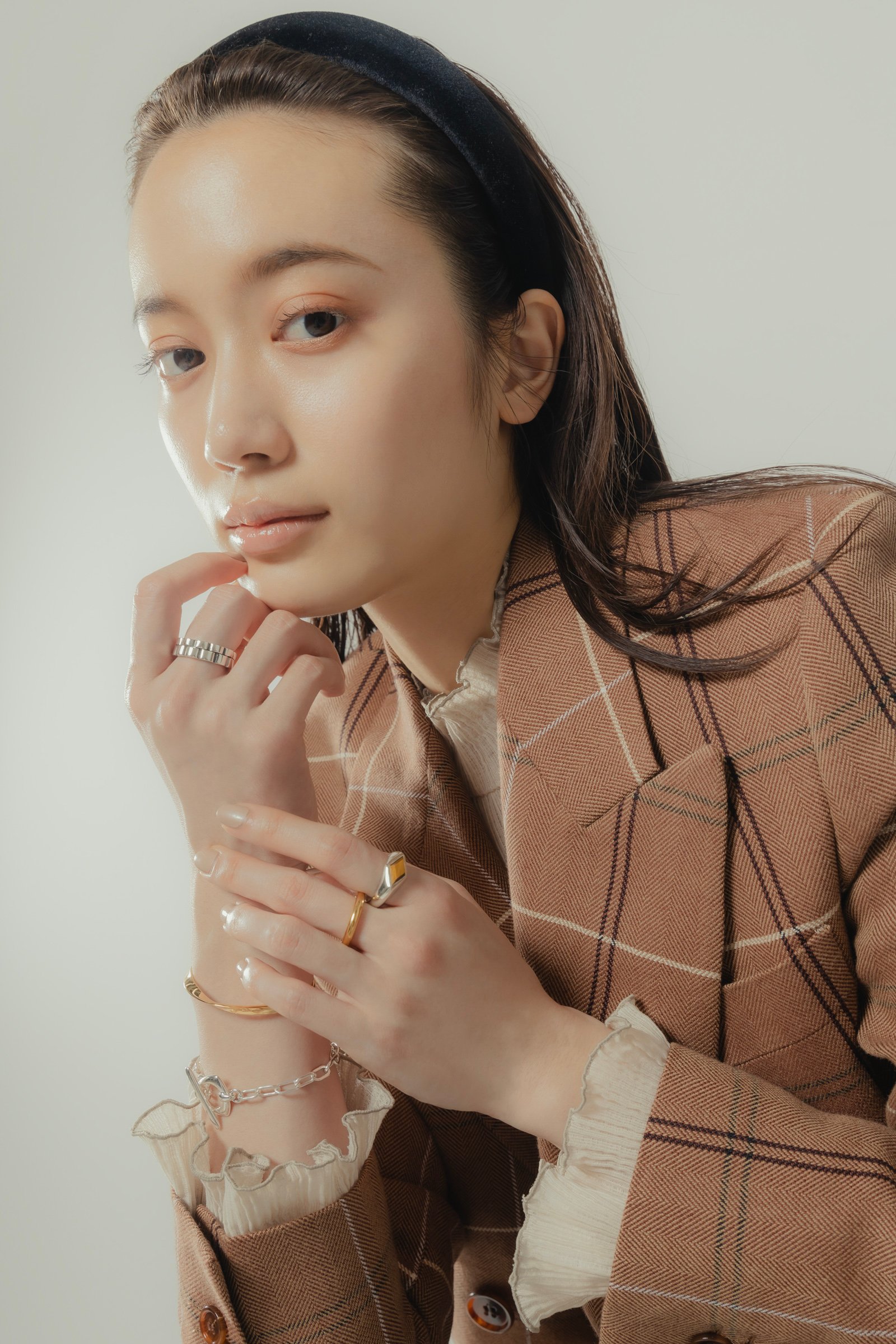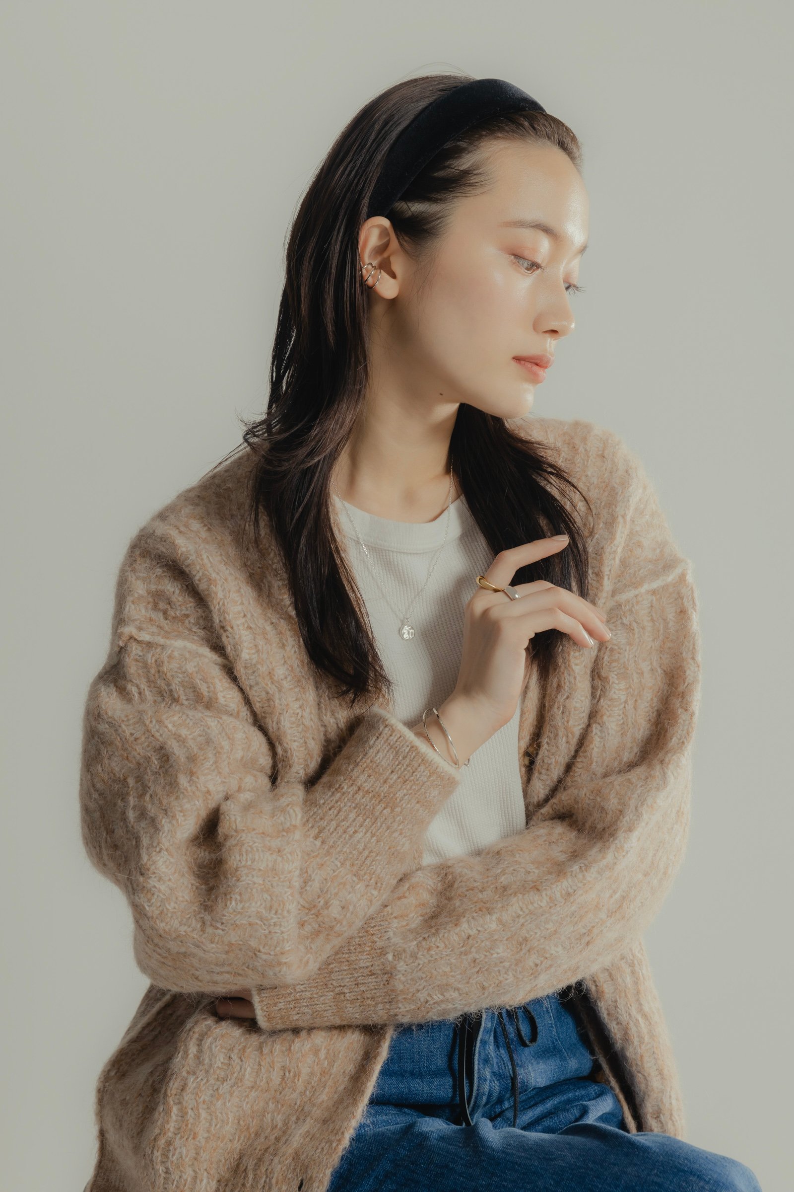 自然と肌に馴染むゴールドのバングルとリングに、いぶし加工を効かせたメンズライクなリングや、マンテルのフォルムが印象的なチェーンブレスレットなど、思わず目を引くデザインのシルバーアイテムをバランス良くコーディネート。人差し指で輝きを放つ「タイガーアイ」のストーンは、見る角度によって光彩が変化し、ほどよく主張する。