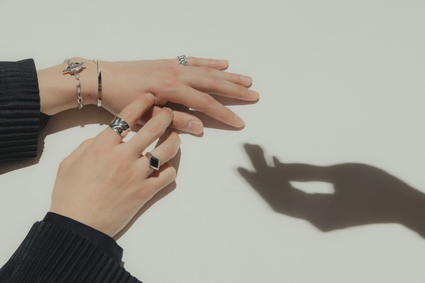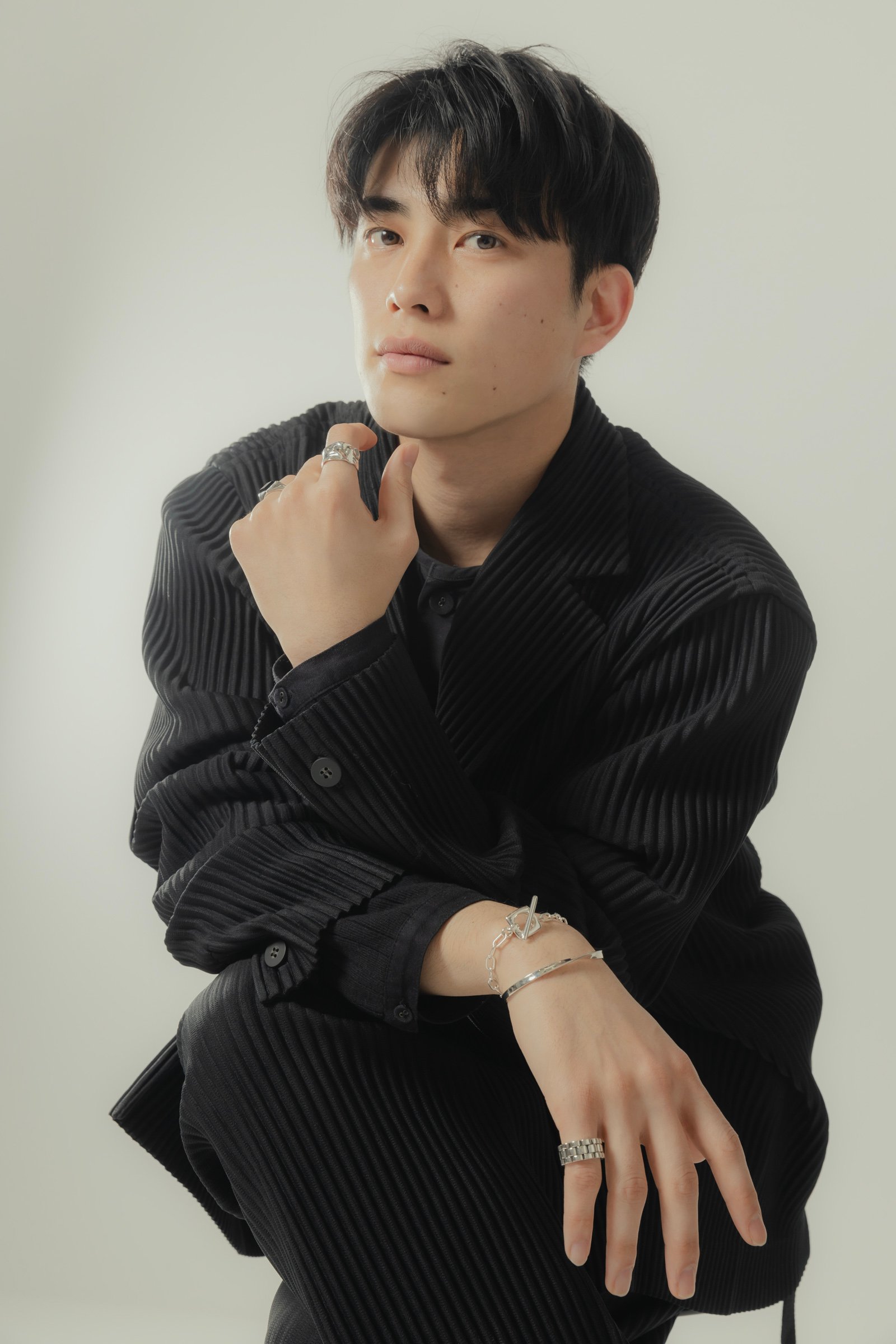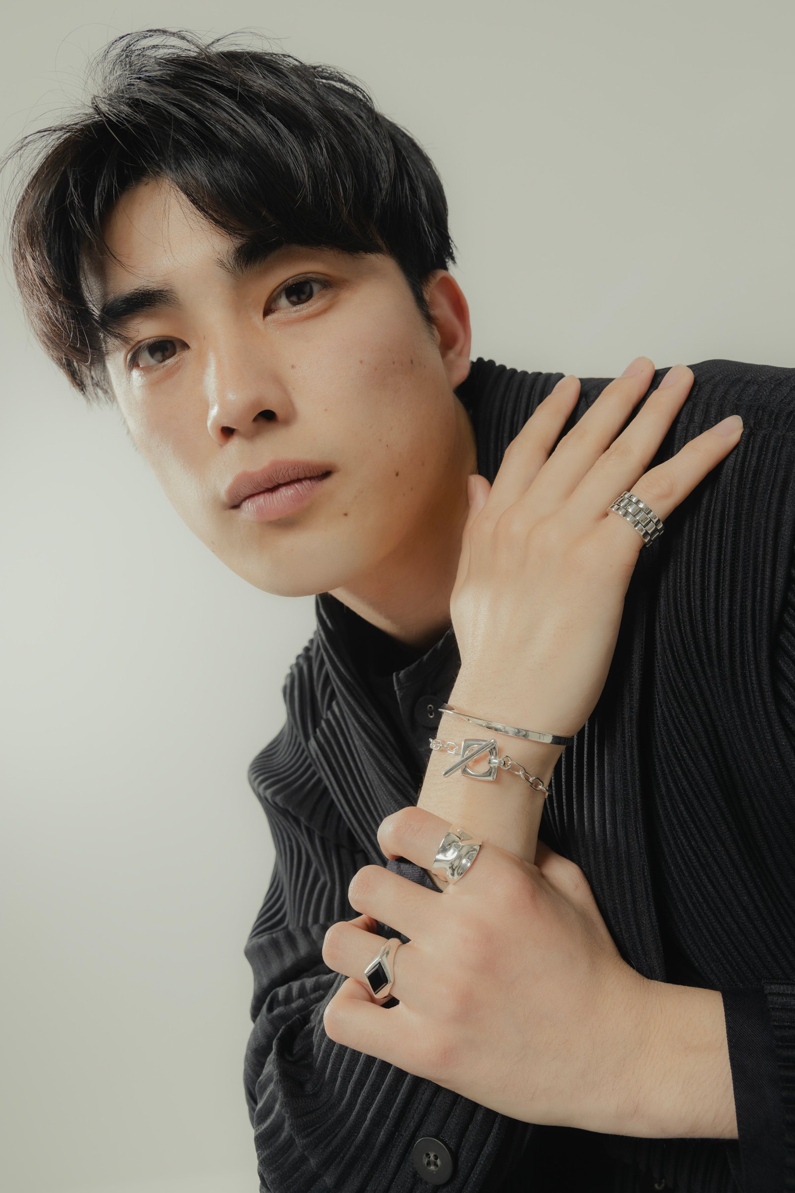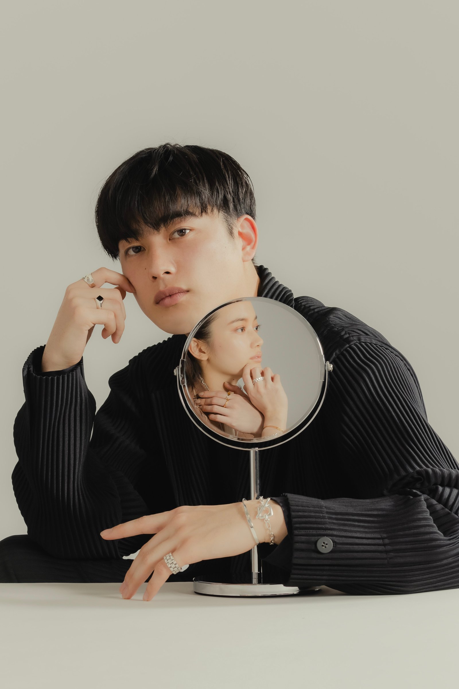 「ツイニング」コーデならではのリンクしつつも個性を欠かなさい装いを叶えるのは、男性の手首にも馴染むMサイズのバングルと、マンテルのデザインが異なるブレスレット。人差し指の「ジェンダレスリング」はハンサムかつクラフト感溢れるデザインが特徴で、ボリューム感のあるシルバーリングはピンキーリングとして着用。薬指には全体を引き締めるブラックのストーン「オニキス」を合わせ、モード感漂う雰囲気に。