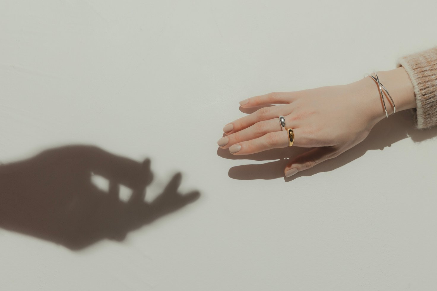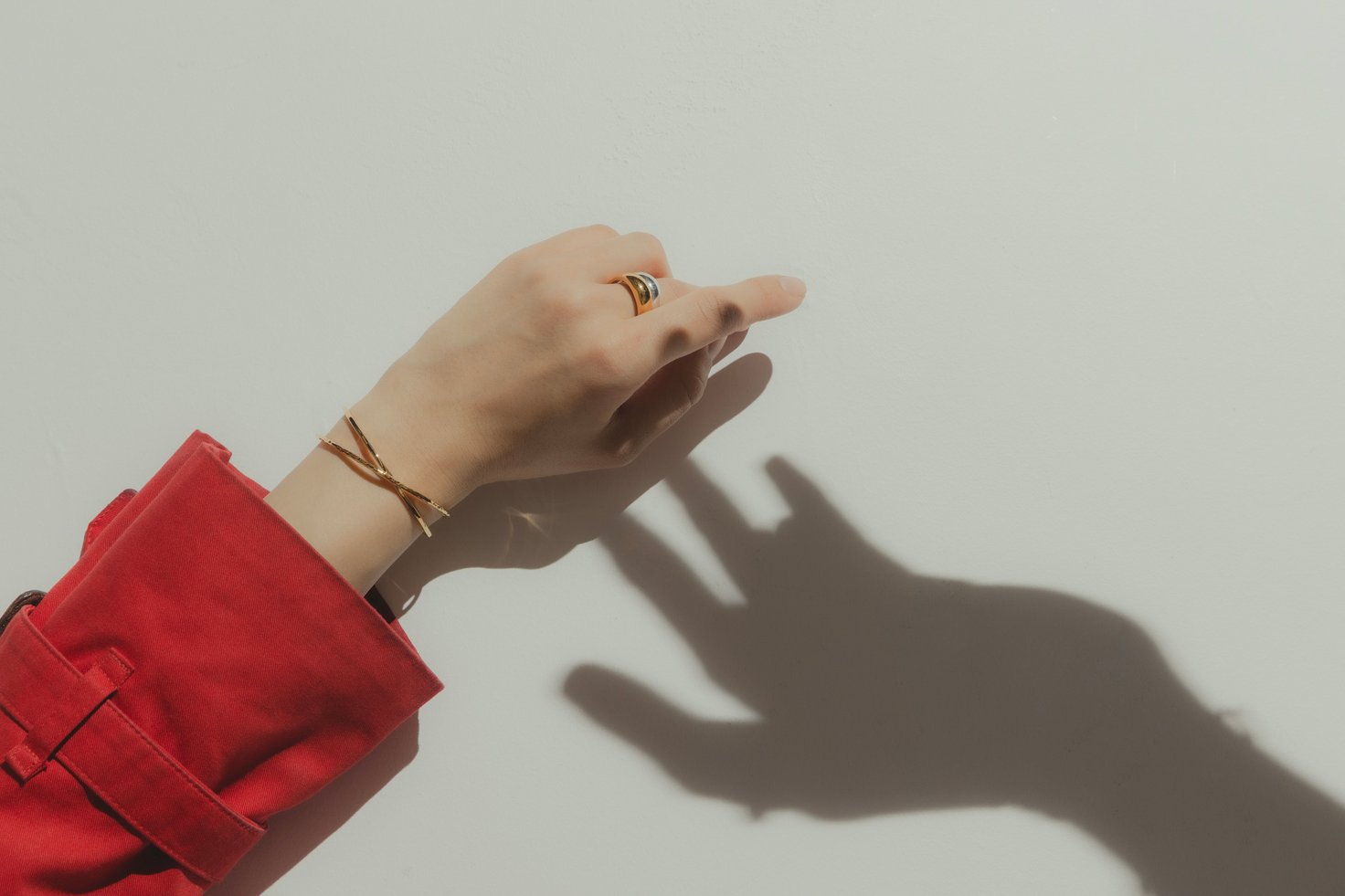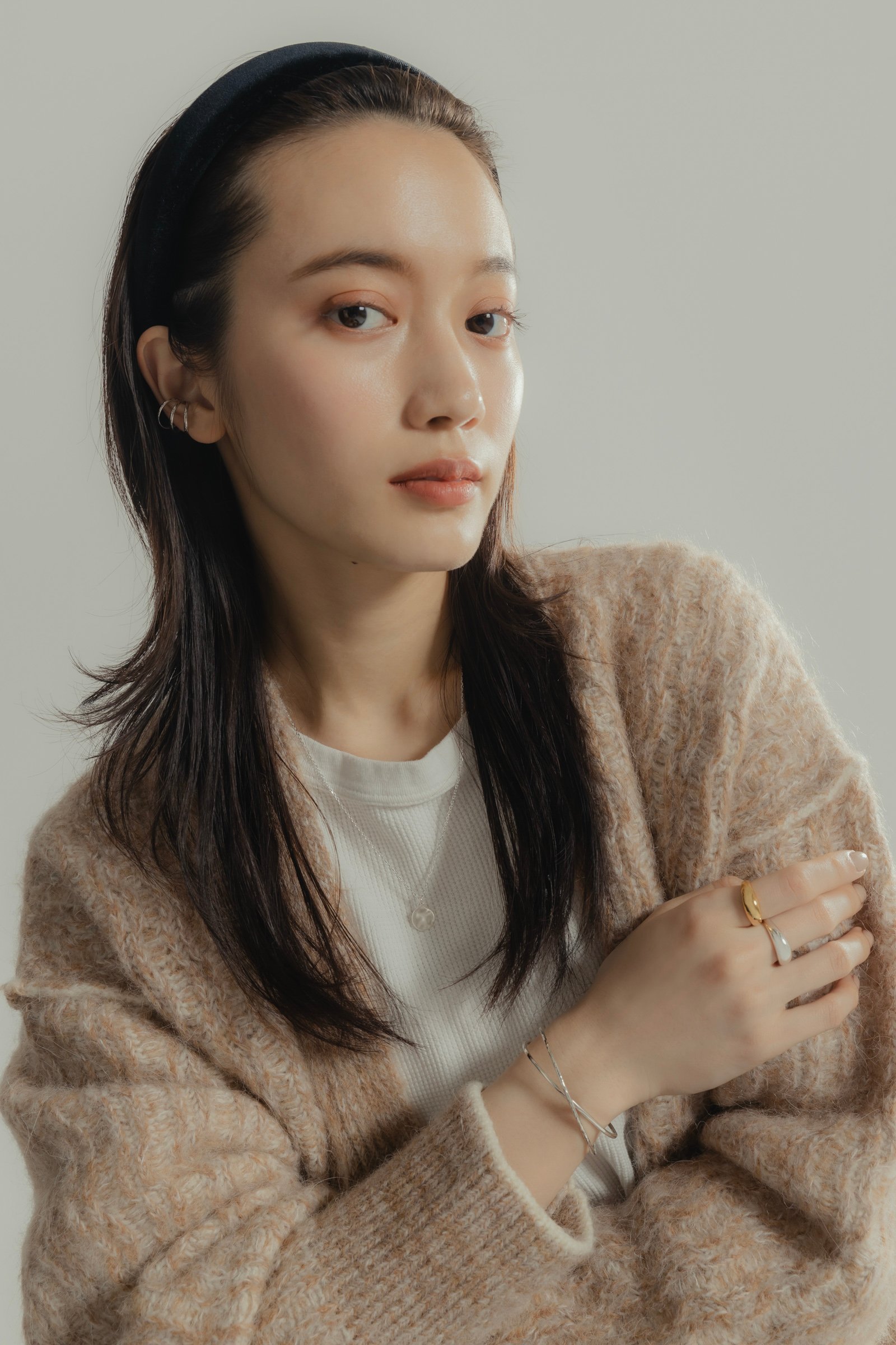 カジュアルなコーデにぽってりとしたジェンダレスリングと、手首で交わるラインシルエットが印象的なバングルをあわせて、こなれ感を演出。全体的にシルバーにまとめられたジュエリーの中で、ゴールドのリングがさり気ないアクセントに。