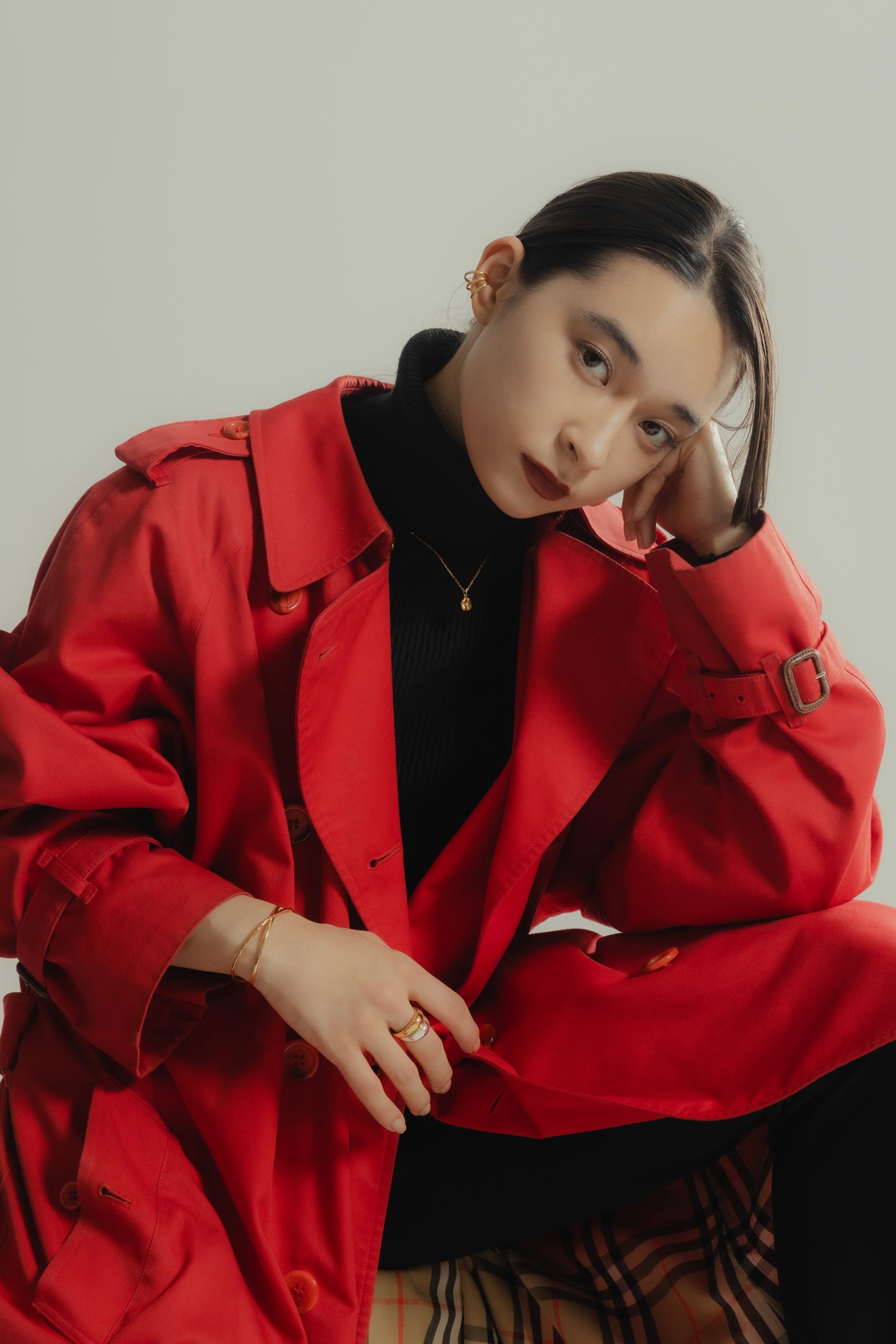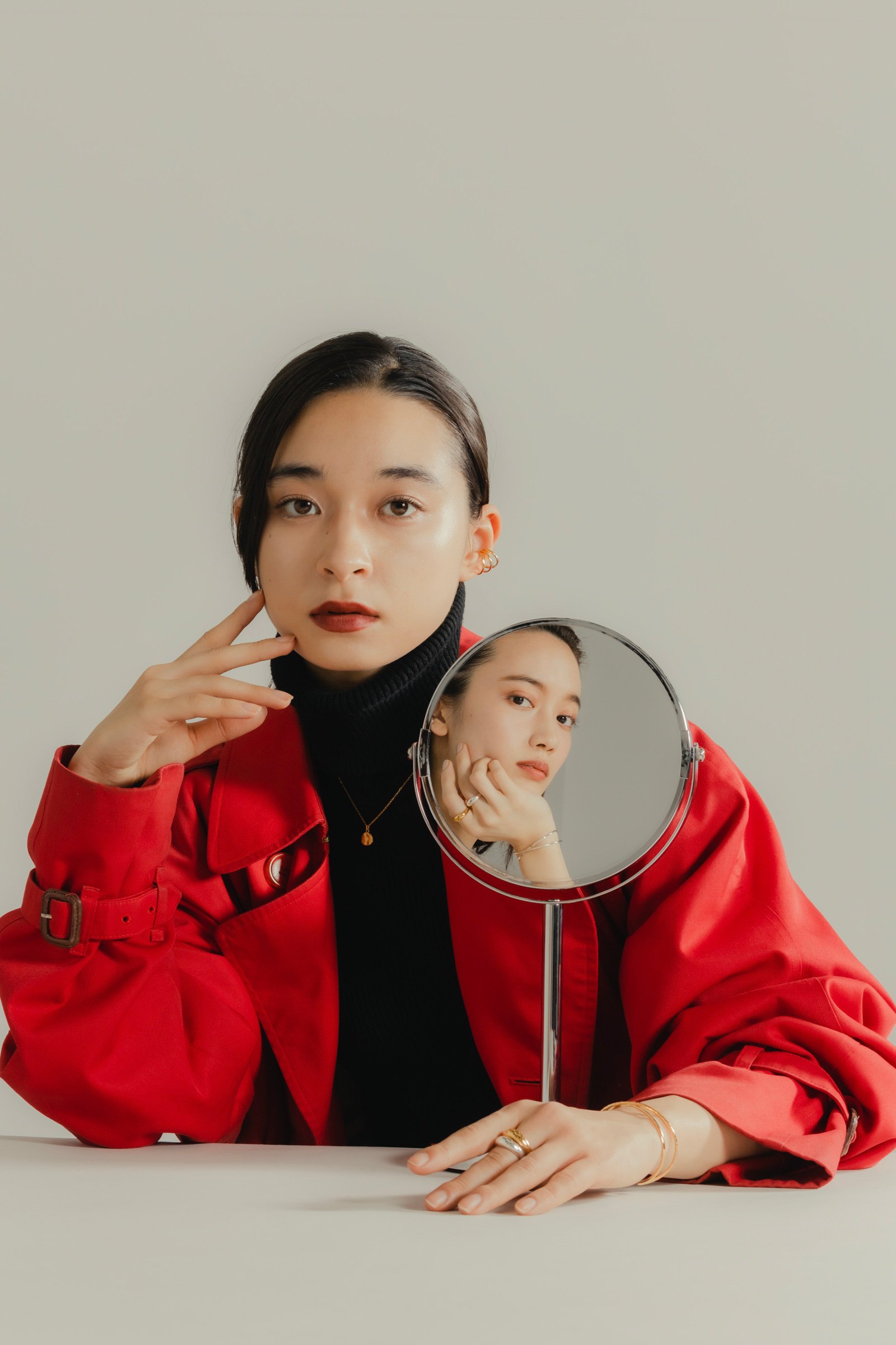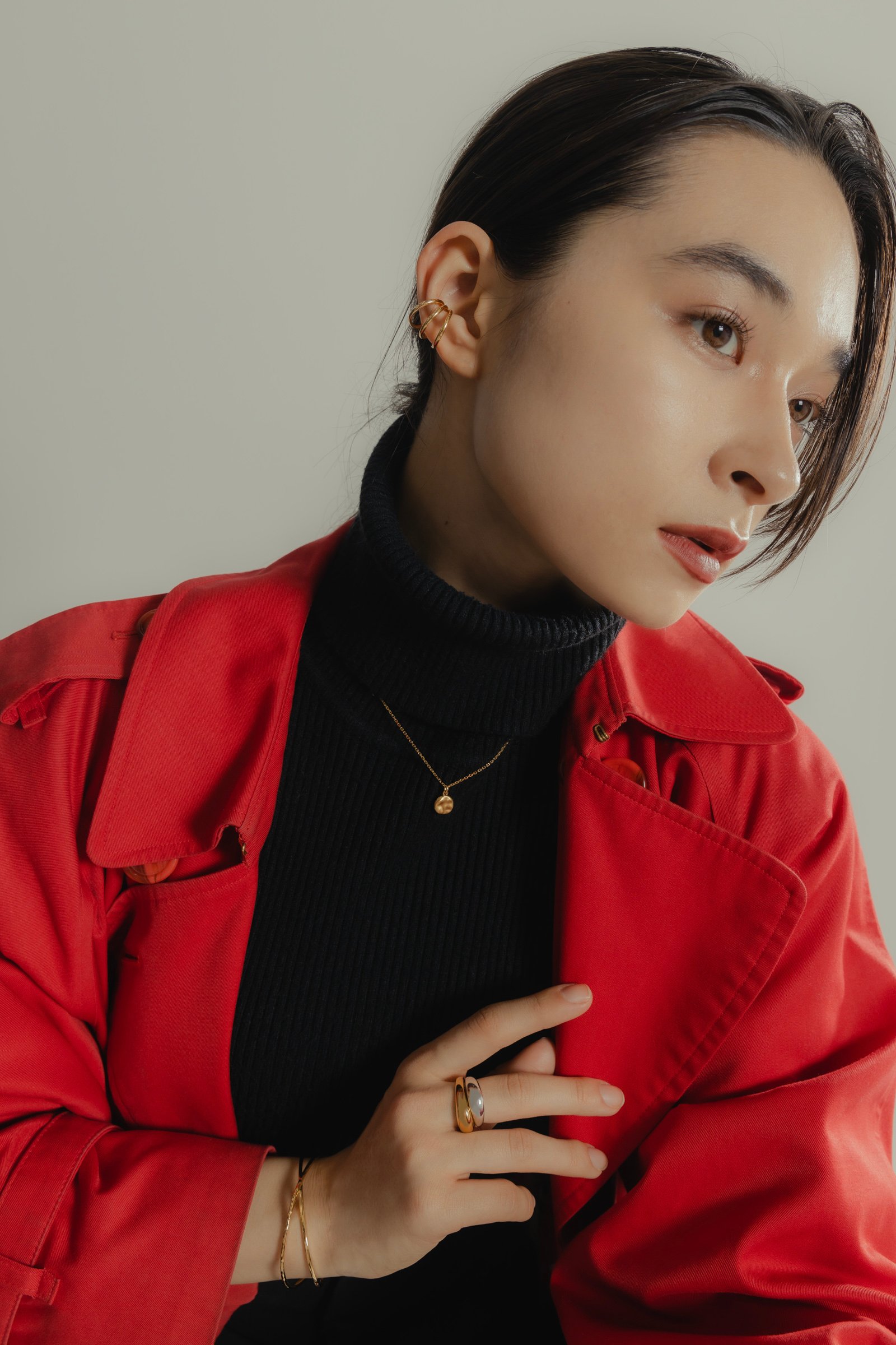 真っ赤なコートにも負けないゴールドのジュエリーがコーデの主役。柔らかなラインの「ジェンダレスリング」は、シンプルなシルエットで重ね付けに最適。ブラックのタートルネックにはゴールドのネックレスを合わせることで、首元に華やかさをプラスして。