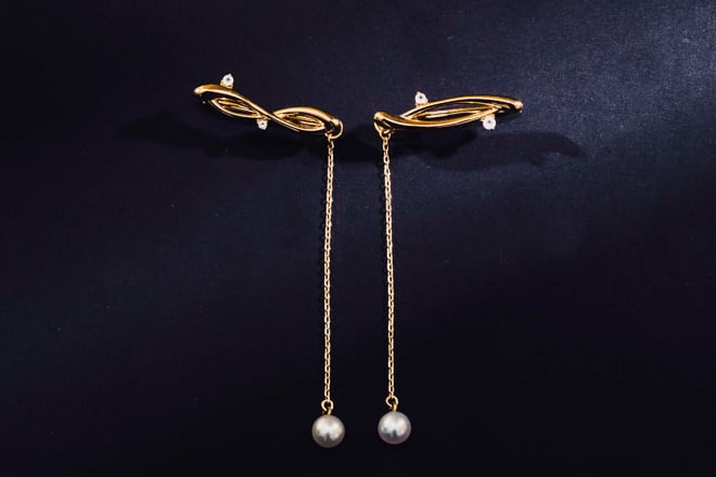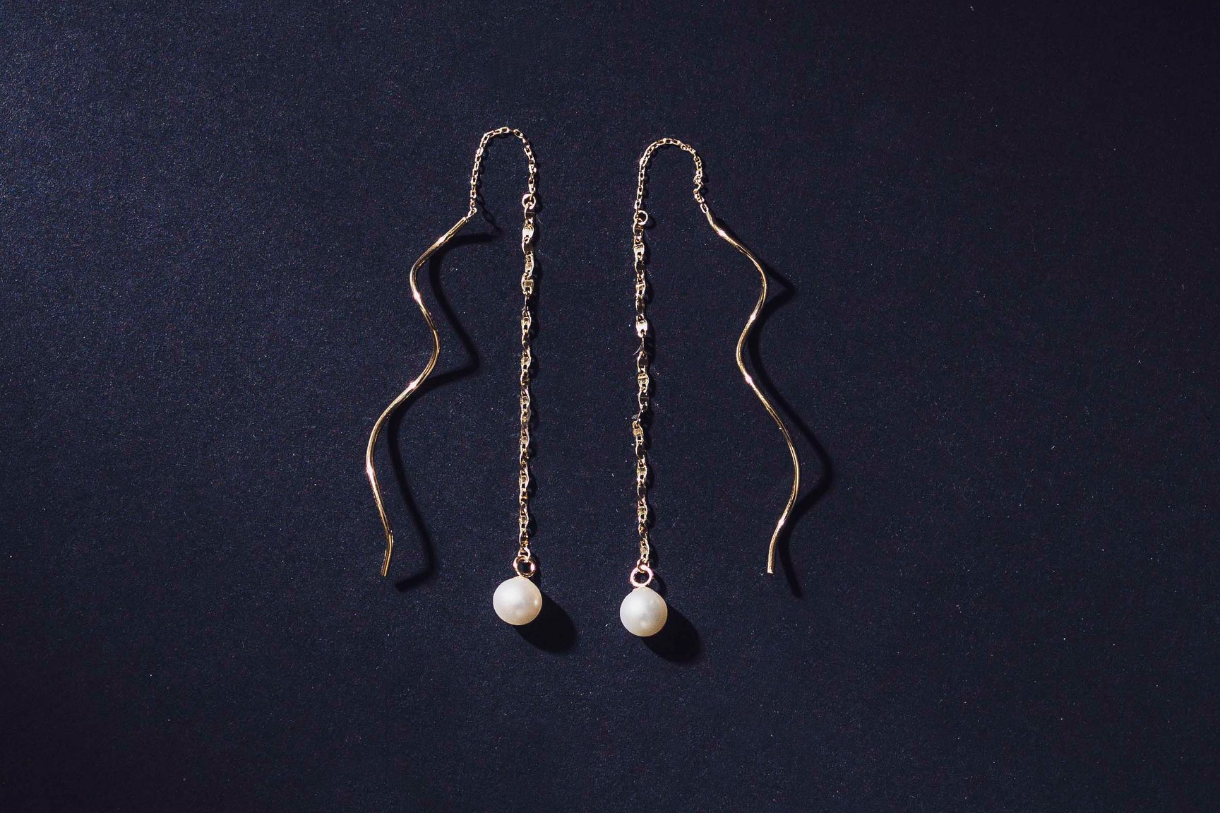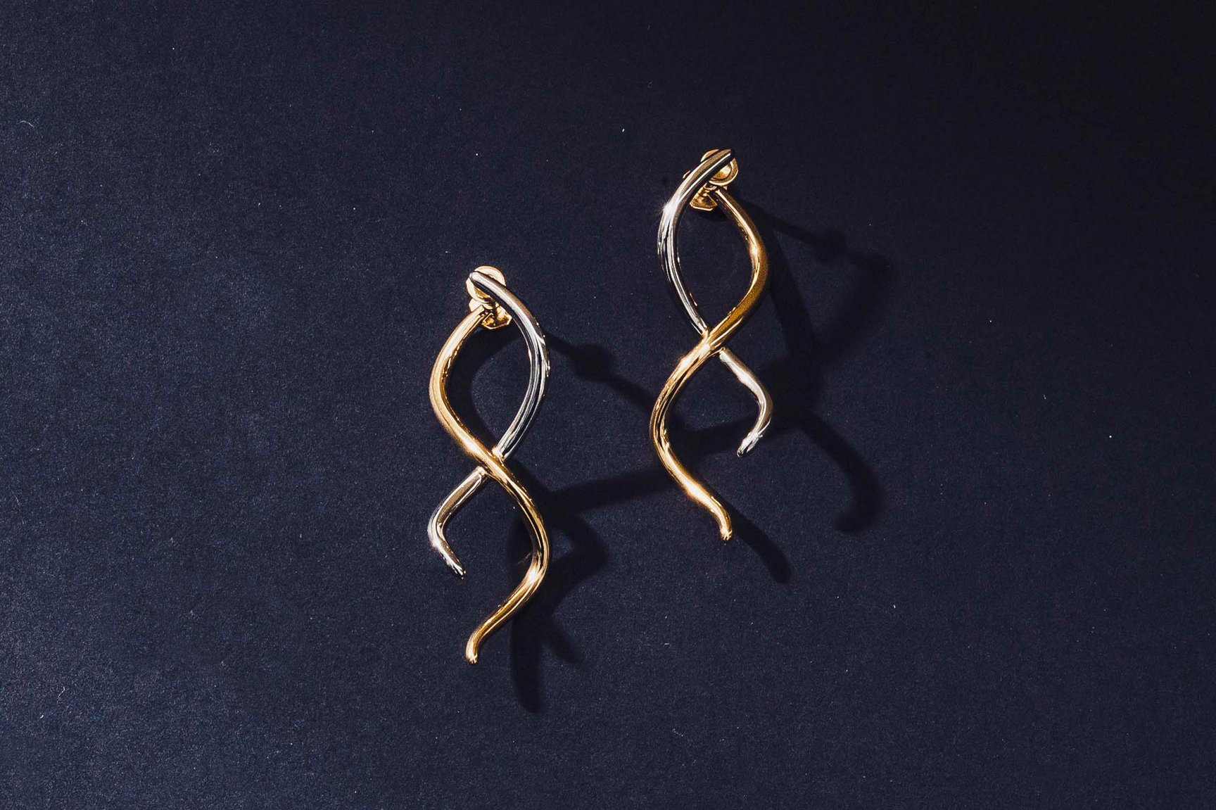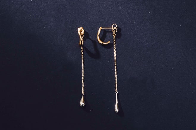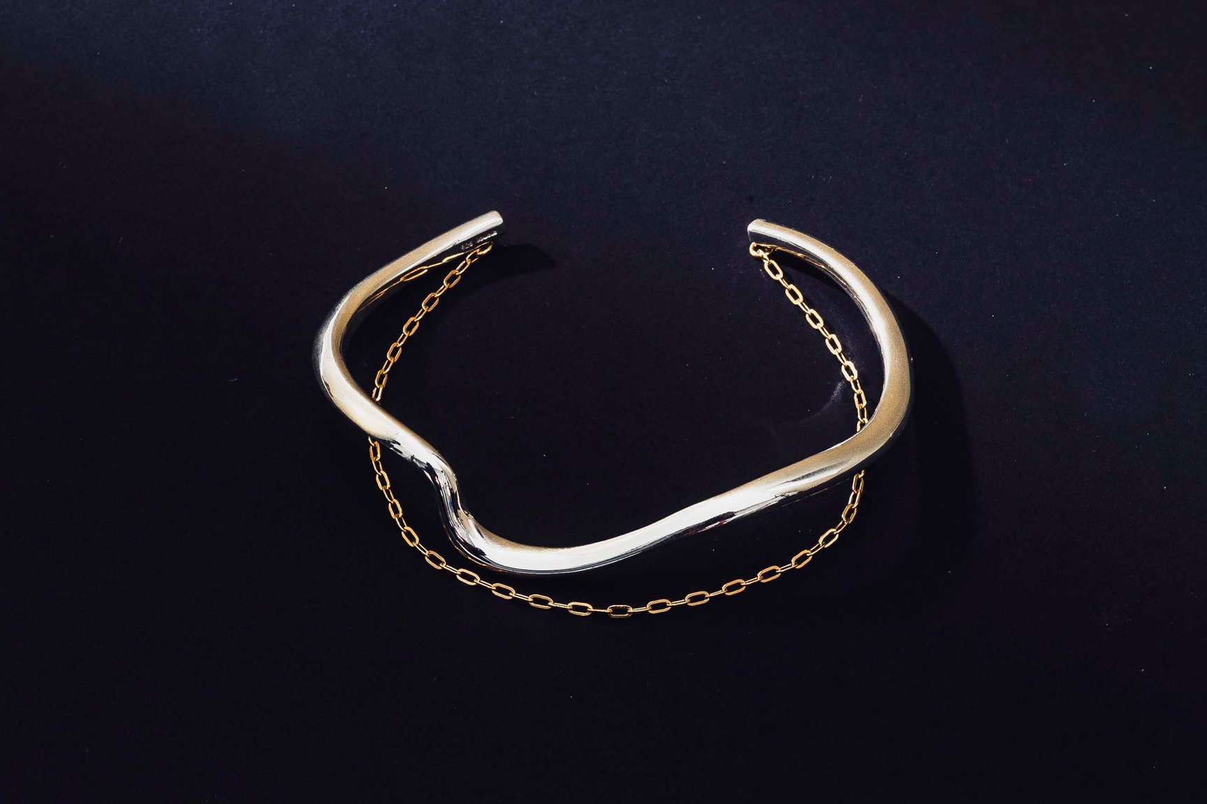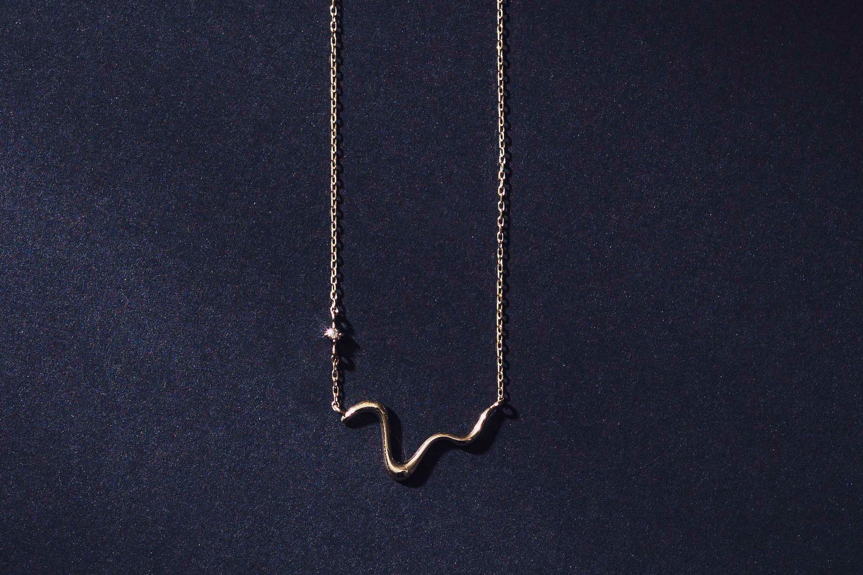 <ネックレス> ¥18,000+tax(K10YG、ブラウンダイヤモンド)</br> 胸もとに沿うシルエットが印象的。ダイヤモンドのリッチな輝きとともに楽しんで。