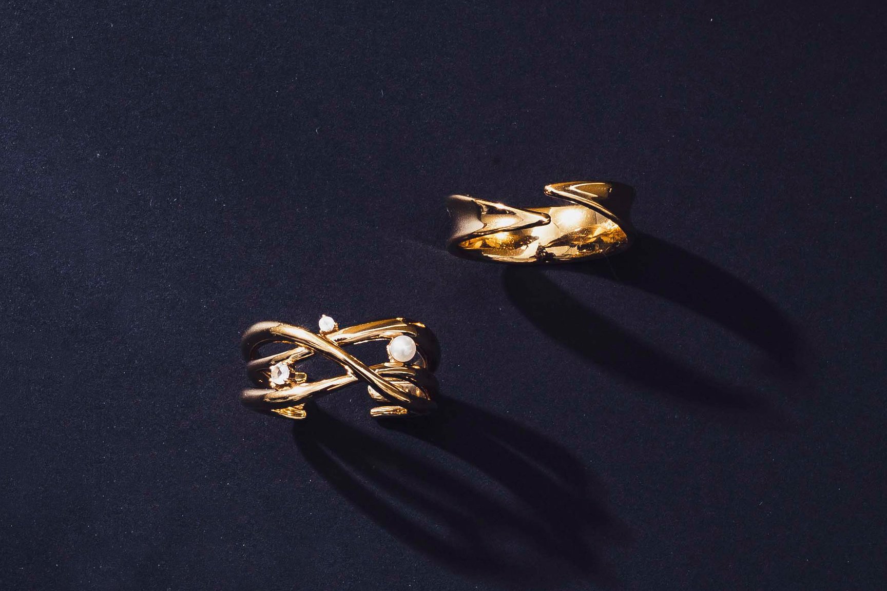 <フォークリングセット> ¥15,000+tax(SV925+YGコーティング、ムーンストーン、淡水パール)</br> 異なるシルエットが特徴的なセットリングは、着け方も自由。抜け感のあるデザインで、女性らしさをぐっと上げて。