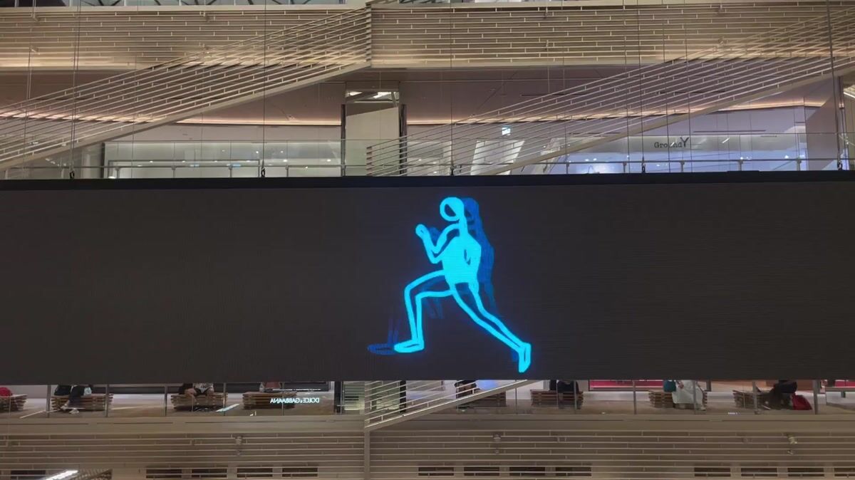 イギリスの現代美術家ジュリアン・オピーが手掛けた新作映像作品「マラソンウーマン(Marathon, Women.)」が、GINZA SIXの吹き抜け空間で公開された。シンプルかつカラフルな線画で描かれたランナーたちが、異なるスピードで躍動的に走る様子を、幅10m、高さ1mの大きなLEDサイネージを宙に浮かべる形で展開。2階から5階までの4フロアで、スクリーンの内外両面に映し出され、多角的に鑑賞できるのが特徴だ。作品制作の背景には、ボリビア代表マラソンチームのためにアートを制作したことがあるという。オピー氏は「走るという行為は、人間の本質的で美しい表現だ」と語る。人間の身体能力が長距離走に優れていることを踏まえ、今回の作品では女性マラソンランナー7人をモチーフにしたが、男性ランナーも撮影し、それらも作品化しているという。
