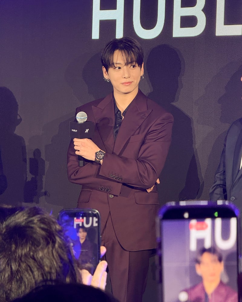 イベント会場に姿を現したジョングクは、バーガンディのスーツスタイルに「ビッグ・バン オリジナル ウニコ」を着用して登場。CEOのジュリアン・トルナーレとのフォトコールでは"ハート"ポーズなど愛嬌も見せ、終始和やかなムードで相思相愛ぶりを印象づけた。