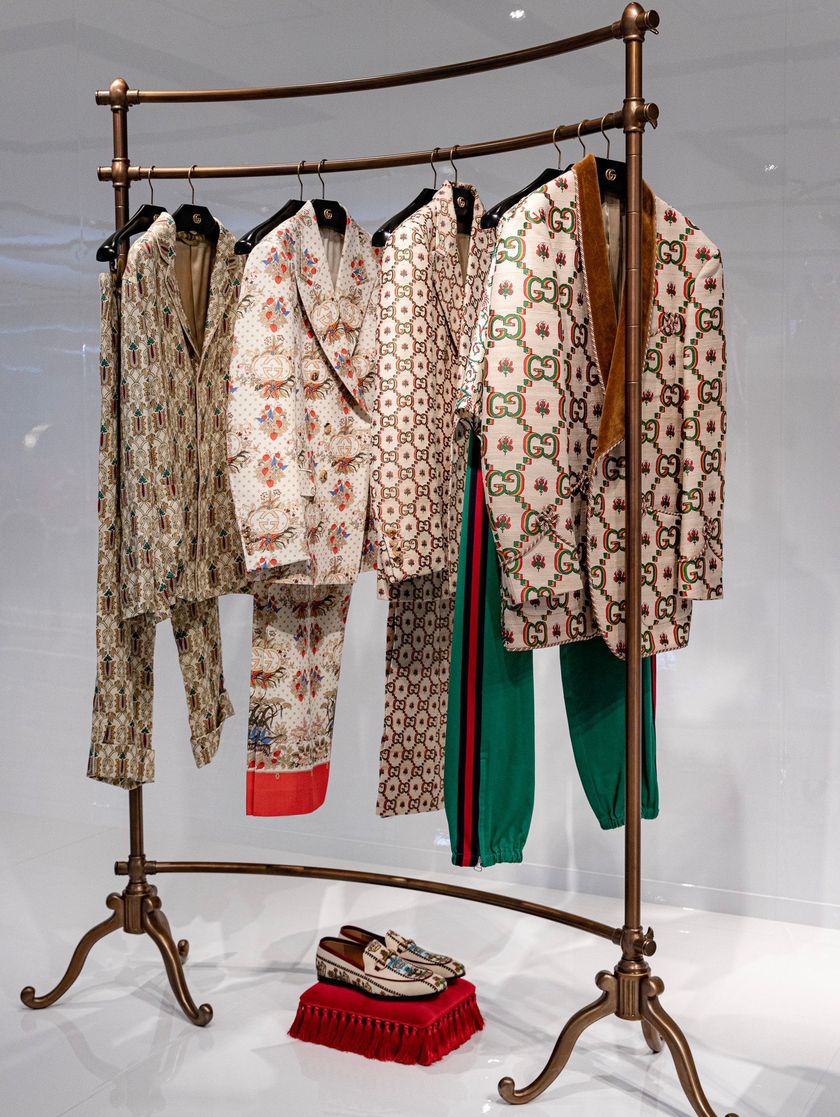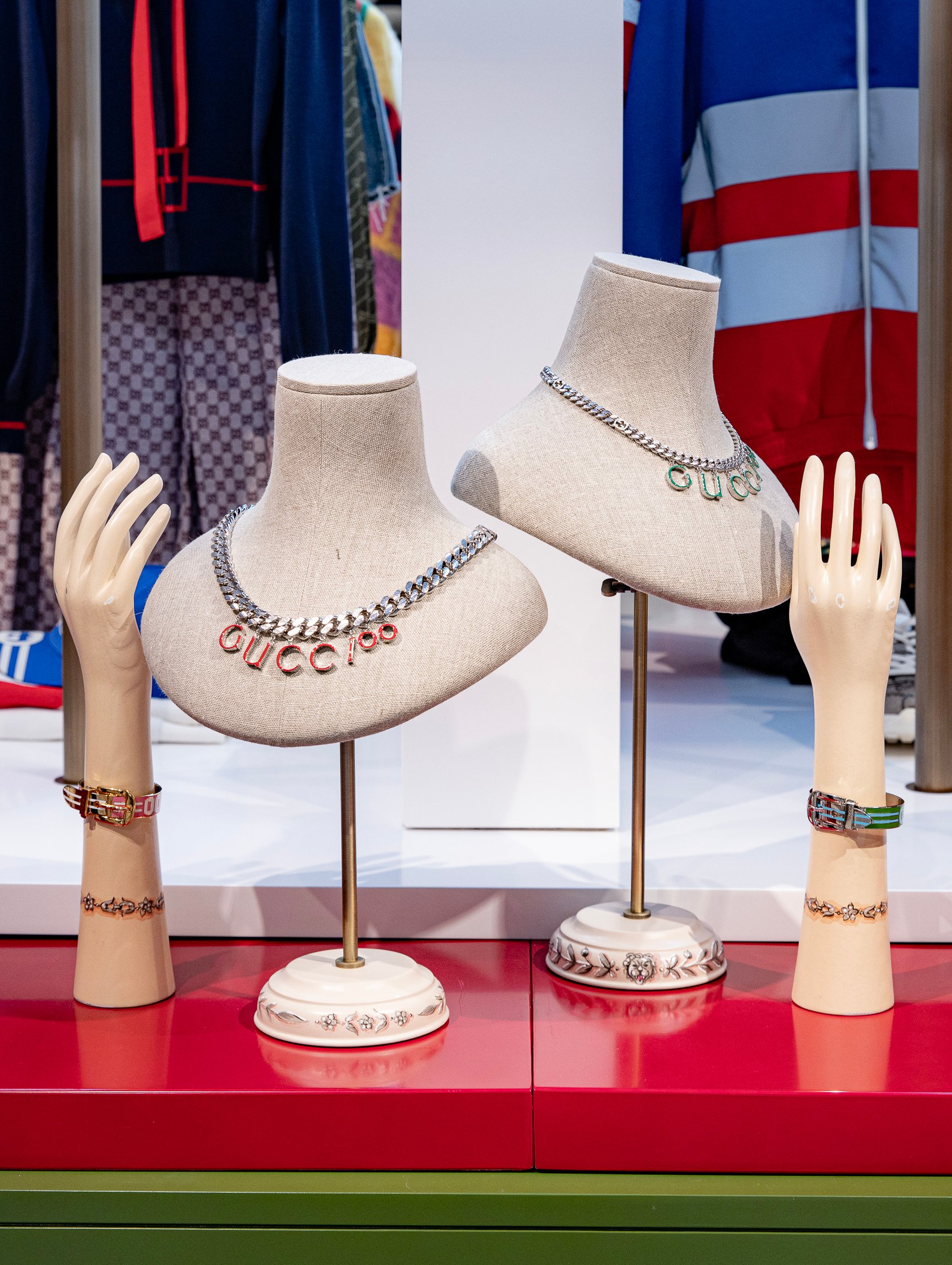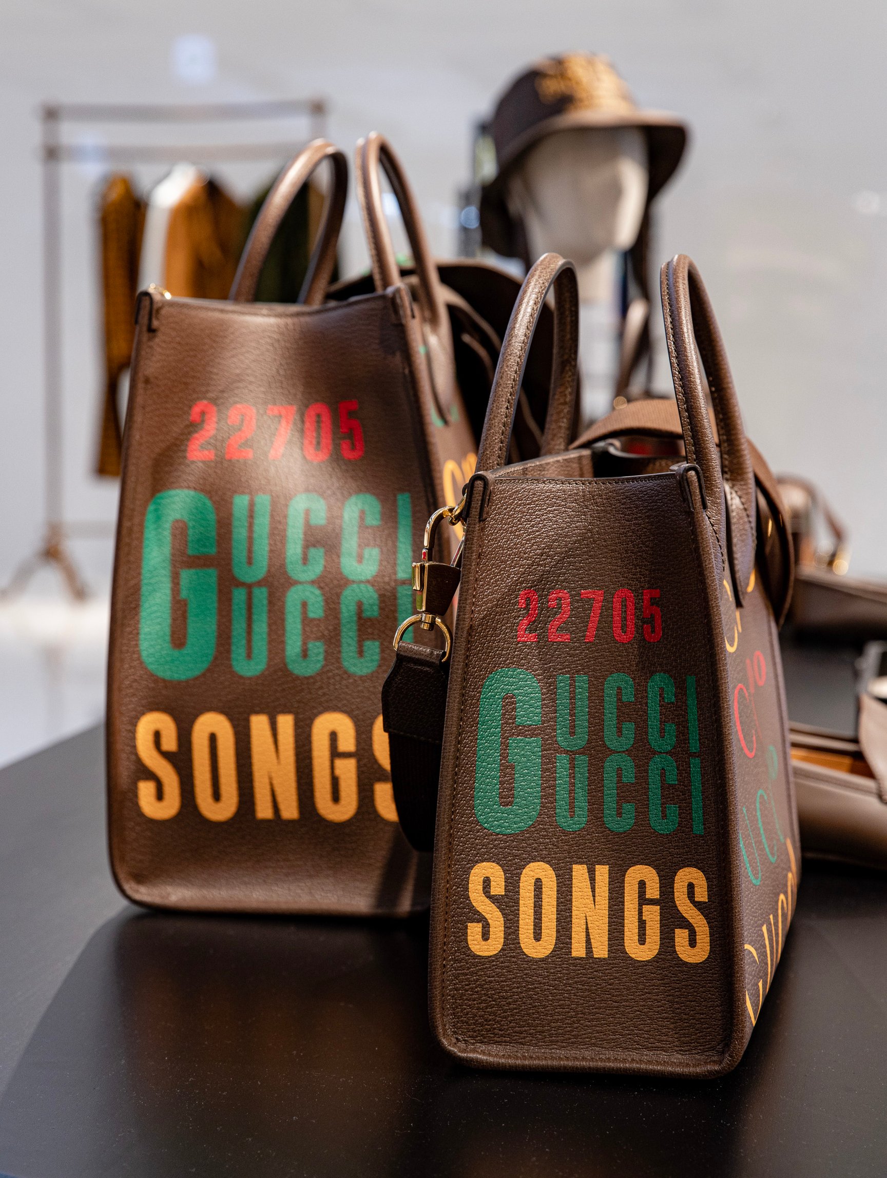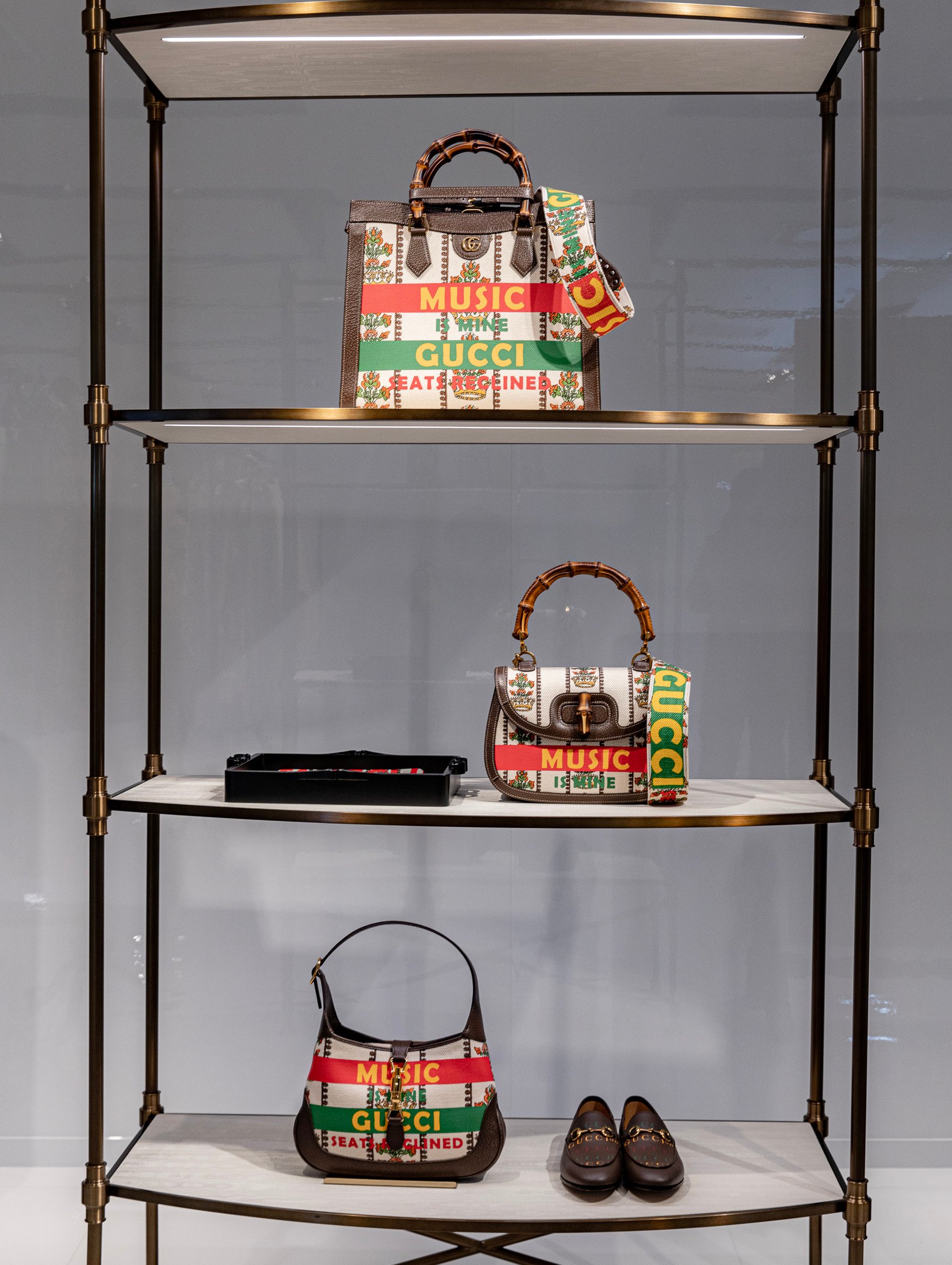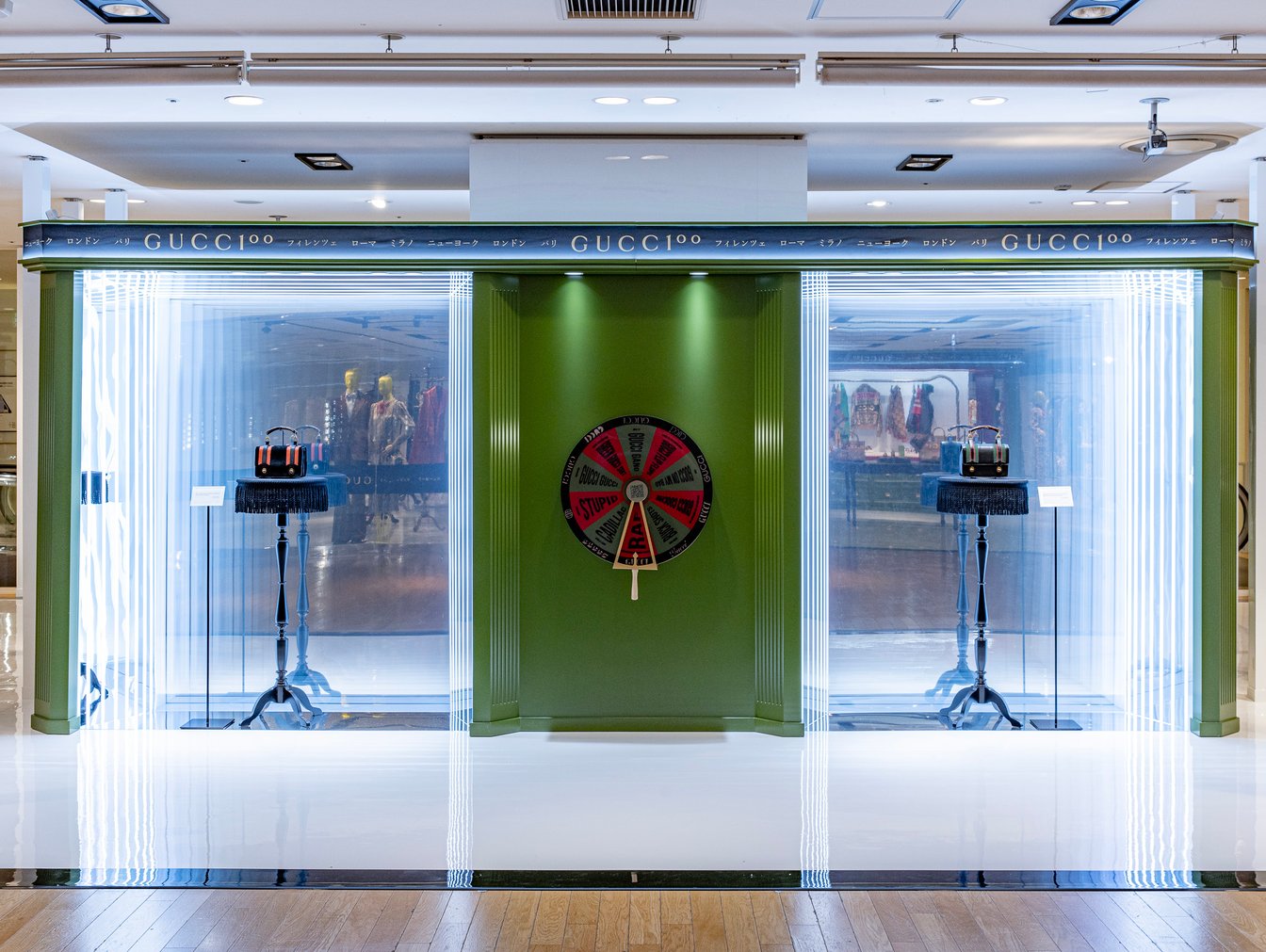 9階の阪急うめだギャラリーでは「Aria」コレクションのランウェイを彷彿とさせるような反射する白のフロアが広がり、ブランドを象徴するグリーンカラーのクラシックなキャビネットの什器に新作のウェアやアクセサリーがラインナップ。側面に取り付けられたホイールを回すと「GUCCI GANG」「GUCCI ON MY BAG」など年代やジャンルを超えた楽曲が流れるという仕掛けが施されている。