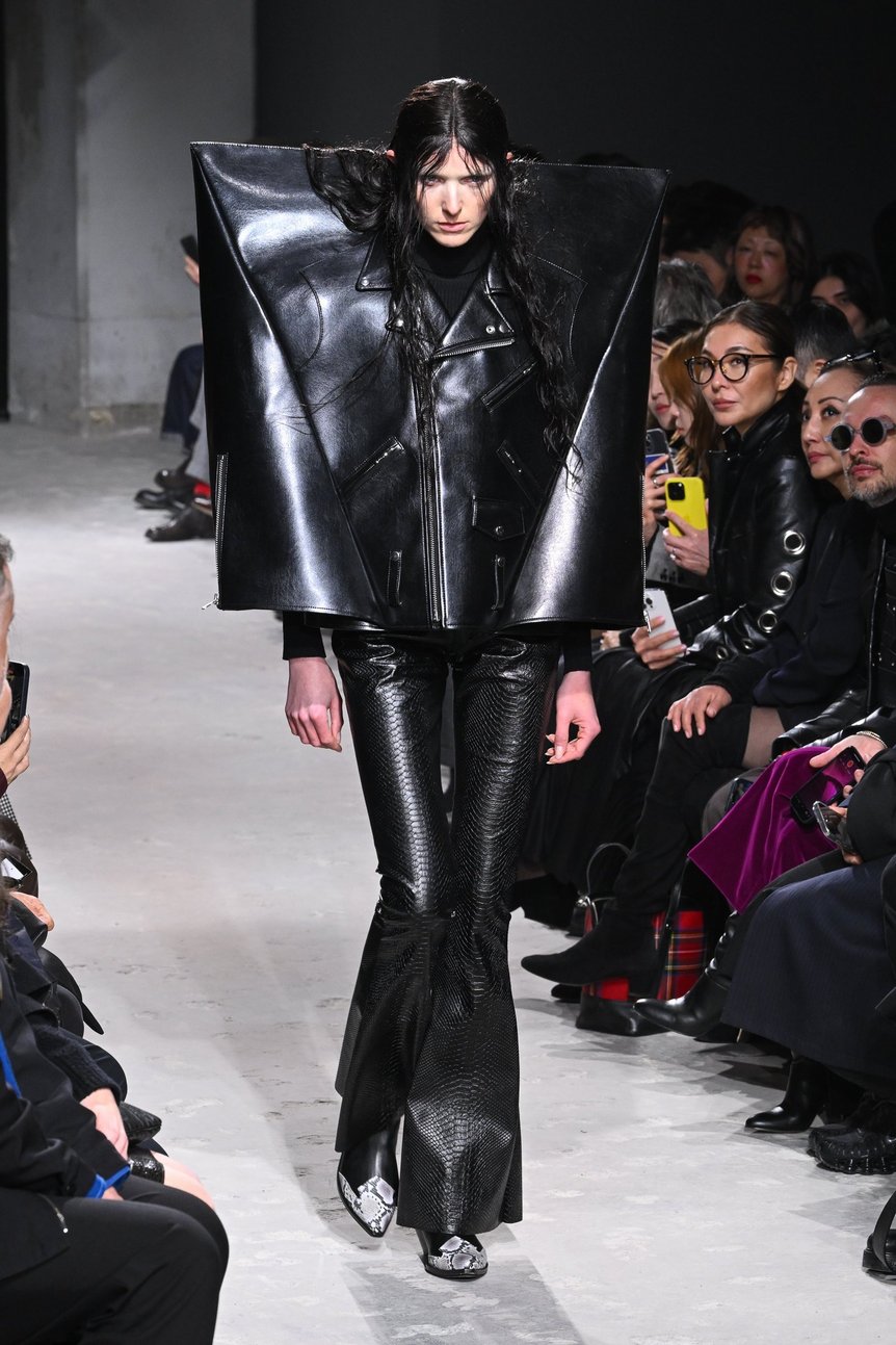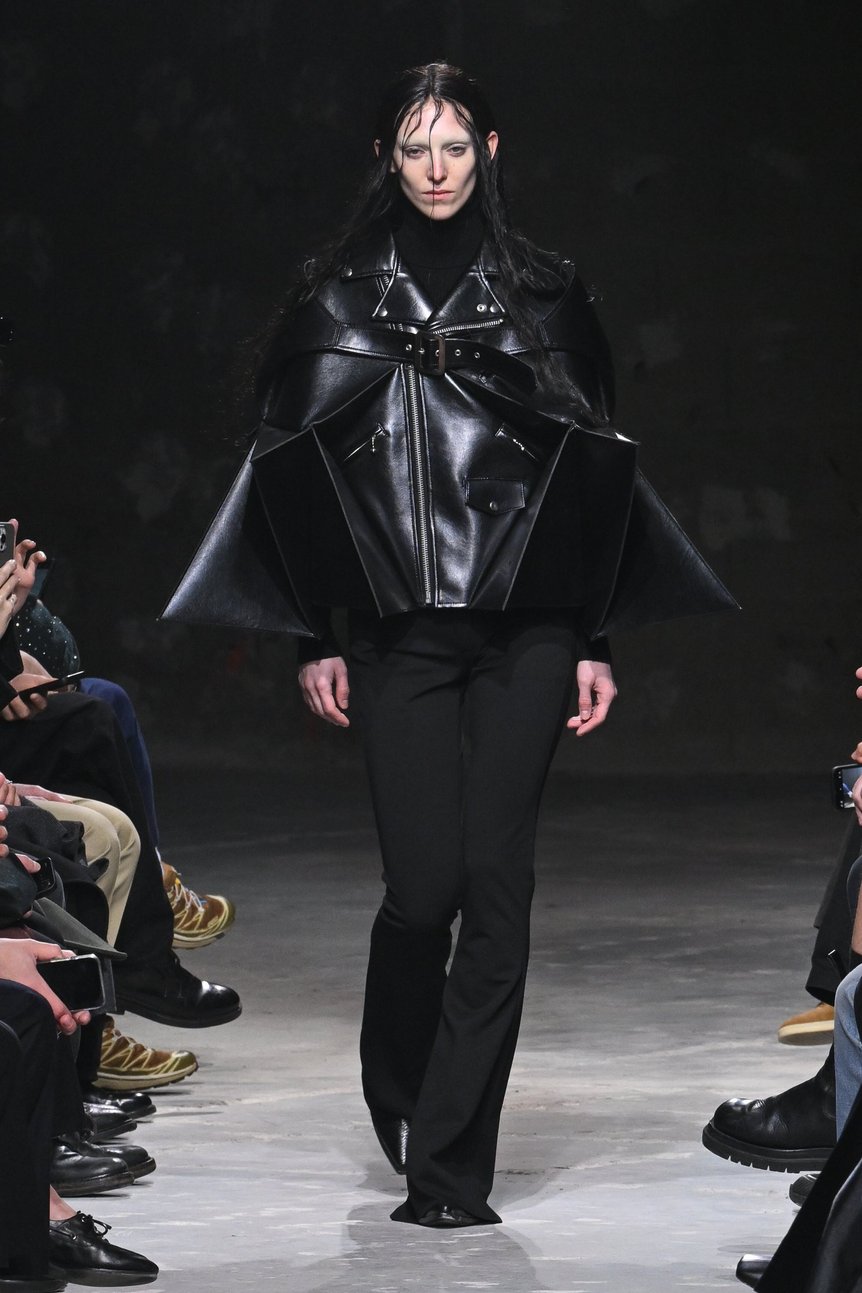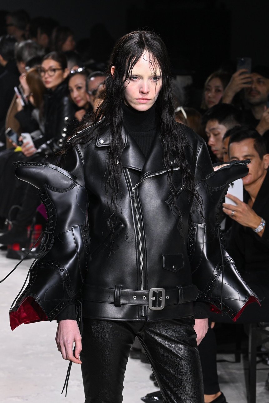 立体造形されたコートなど、パブリックアートを軸に、造形物と服とのコントラストを表現した2024年秋冬コレクションと重なる部分でもあるが、複数の三角柱が付いたライダースにはじまり、キュビズムの言葉の由来となっている「CUBE」の立体造形を用いたもの、ジップやベルトなどのライダースのディテールを複数の視点から捉え、一つのアイテムに集積させることで生まれた見たことのない形のライダースジャケットはキュビズム的アプローチを体現している。また、袖がブーツになっているライダースは「ドクターマーチン(Dr.Martens)」とのコラボレーションによるものだ。