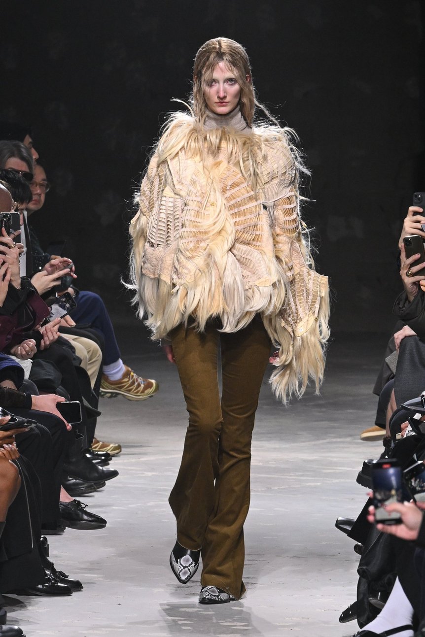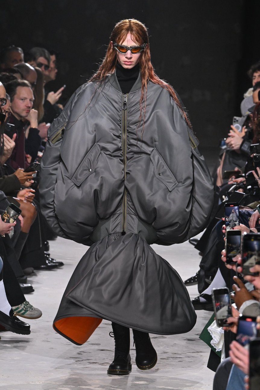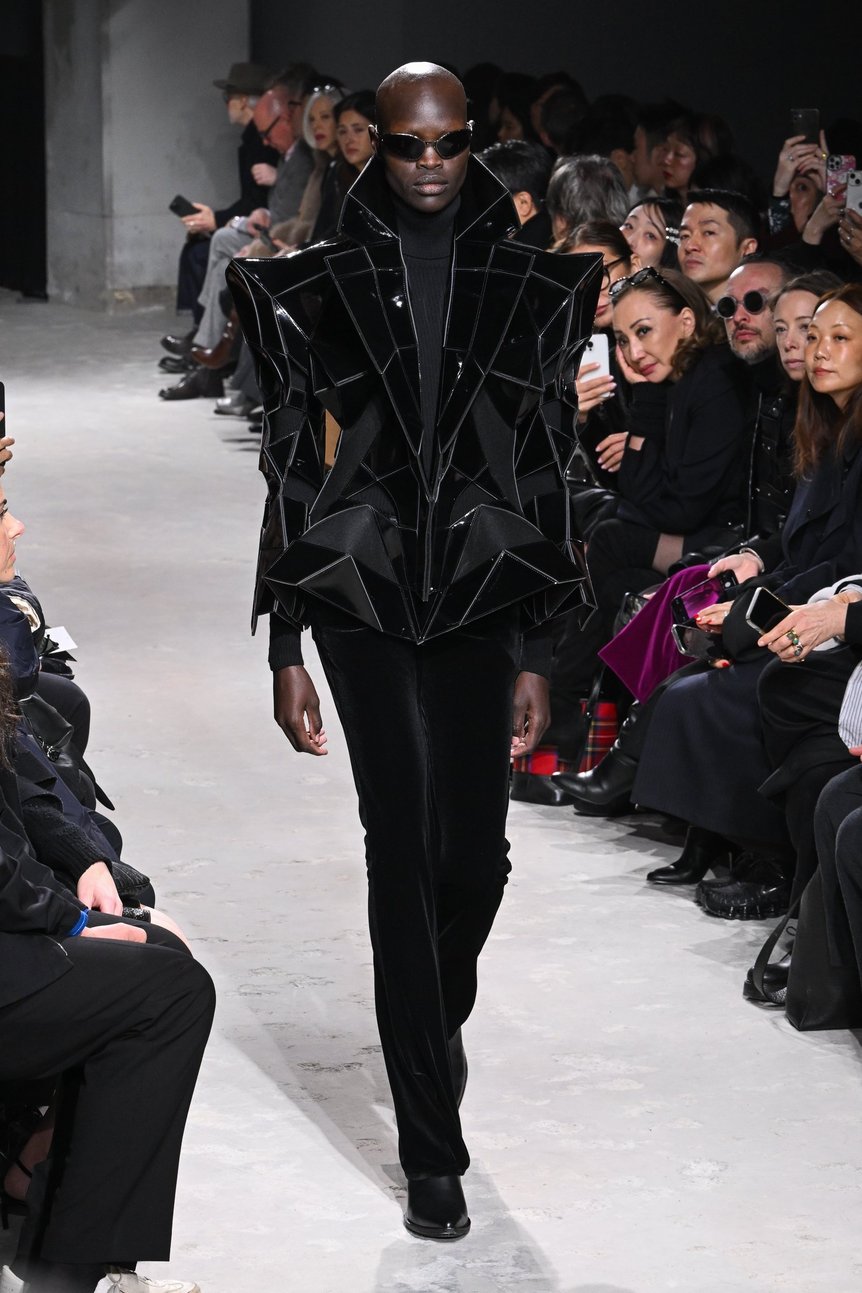 立体造形されたコートなど、パブリックアートを軸に、造形物と服とのコントラストを表現した2024年秋冬コレクションと重なる部分でもあるが、複数の三角柱が付いたライダースにはじまり、キュビズムの言葉の由来となっている「CUBE」の立体造形を用いたもの、ジップやベルトなどのライダースのディテールを複数の視点から捉え、一つのアイテムに集積させることで生まれた見たことのない形のライダースジャケットはキュビズム的アプローチを体現している。また、袖がブーツになっているライダースは「ドクターマーチン(Dr.Martens)」とのコラボレーションによるものだ。
