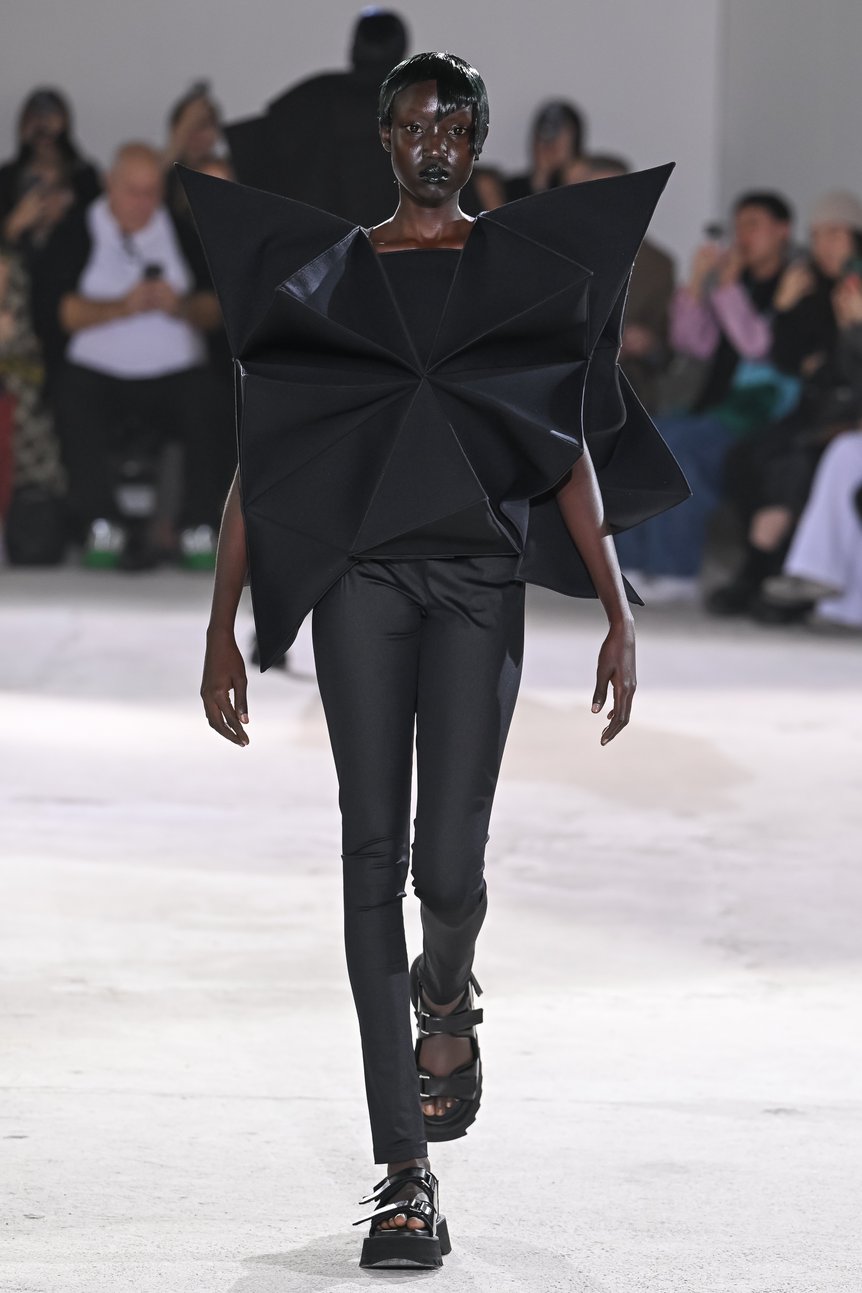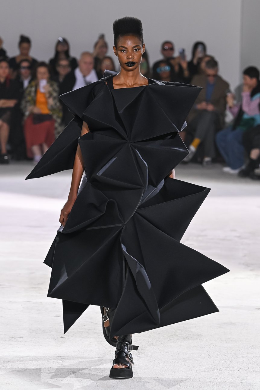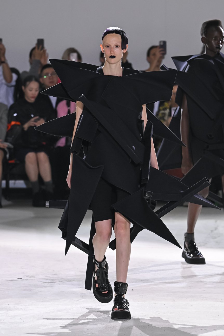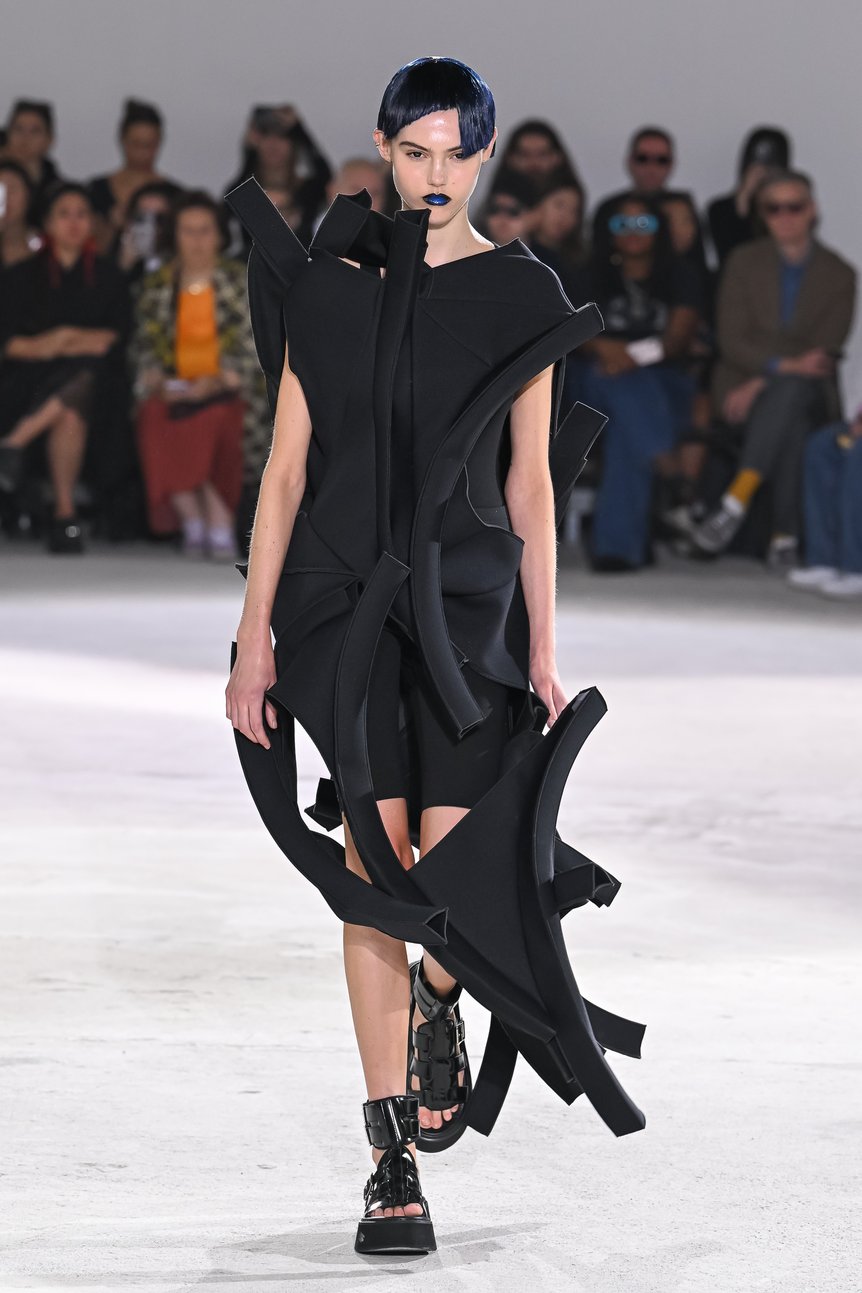 6月に発表された「ジュンヤ ワタナベ マン(JUNYA WATANABE MAN)」2024年春夏メンズは、数多くのブランドとのコラボもあって熱狂を生んだが、ウィメンズでは一変、ストイックに芸術的なアプローチを魅せる。序盤、三角錐をはじめ角筒や丸筒の管など、立体図形を服へと昇華したような、幾何学的なピースがオールブラックで登場。どれもモデルの動きに合わせて形を変えることはなく、およそ布で形取ったと思えない硬質な印象を与えた。