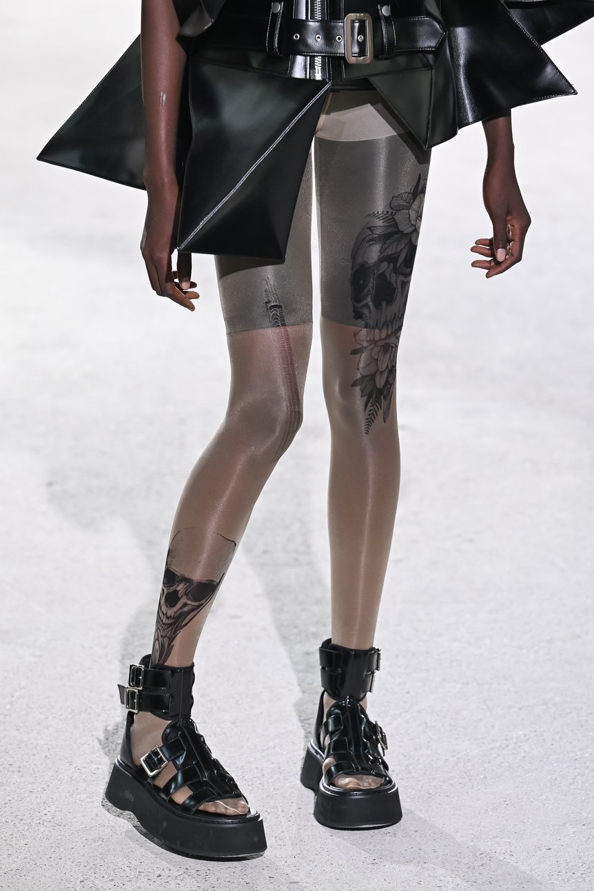 近年のジュンヤ ワタナベはコラボレーターとしての手腕が高く評価されており、本コレクションでもメンズほどではないが協業が登場した。全体を通してルックに怪奇な雰囲気が見え隠れしていた正体は、デンマーク出身のタトゥーアーティスト ヤコブ・ホルスト・ラスムッセン(Jakob Holst Rasmussen)とのコラボタイツだ。