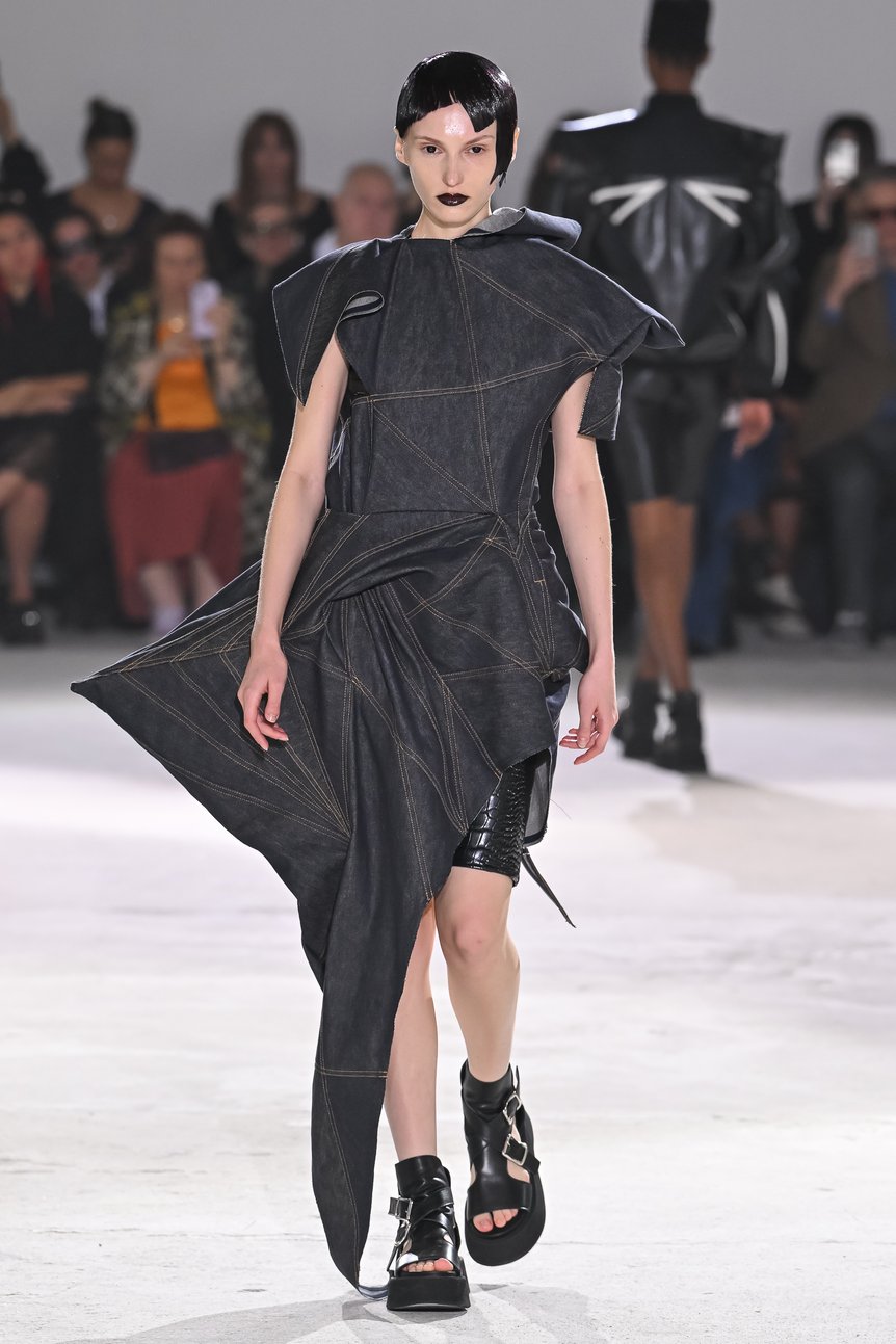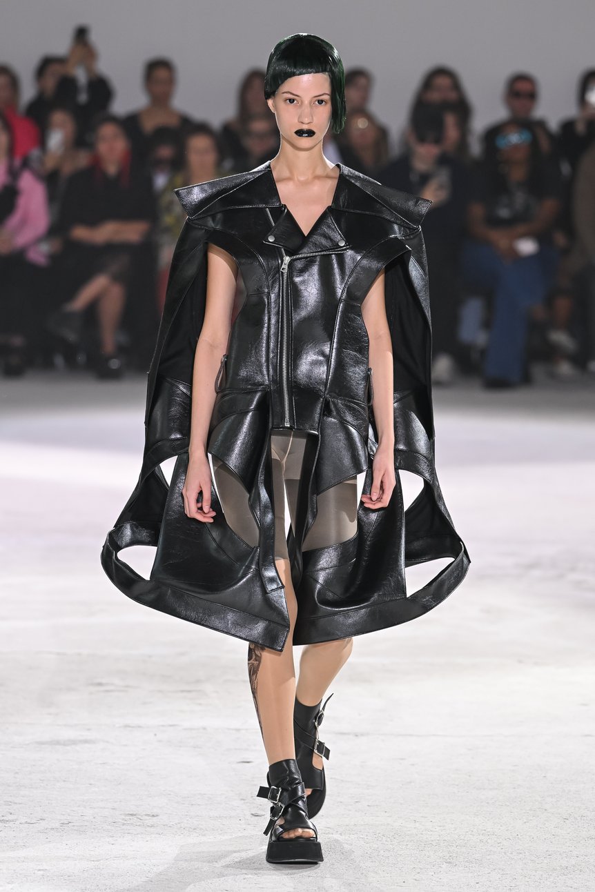 ブランドではおなじみの素材であるレザーやデニムを使用したアイテムでも、このアティチュードは変わらない。特にアイコンであるバイカージャケットは、ドレスほどに誇張しながら大胆な穴開きのカッティングを施したり、台襟や型部分を拡張して正面からのシルエットを星型にしたりと、造形美あふれる構築的なシルエットで提案。