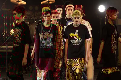 3部構成で行われたショーでは、仏像を連想させるゴールドなどメタリックなテクスチャーを随所に散りばめ、民族衣装風のファブリックと組み合わせた。また、ドレープやチュールを重ねた立体的なワンピースに、スカートやライダースジャケットの前立てやアームを平面的に縫い付けることで、平面と立体を共存させている。同ブランドでは初めてであろうファン付きウェアは、空気を含ませることでダウンジャケットのようなシルエットになっている。
