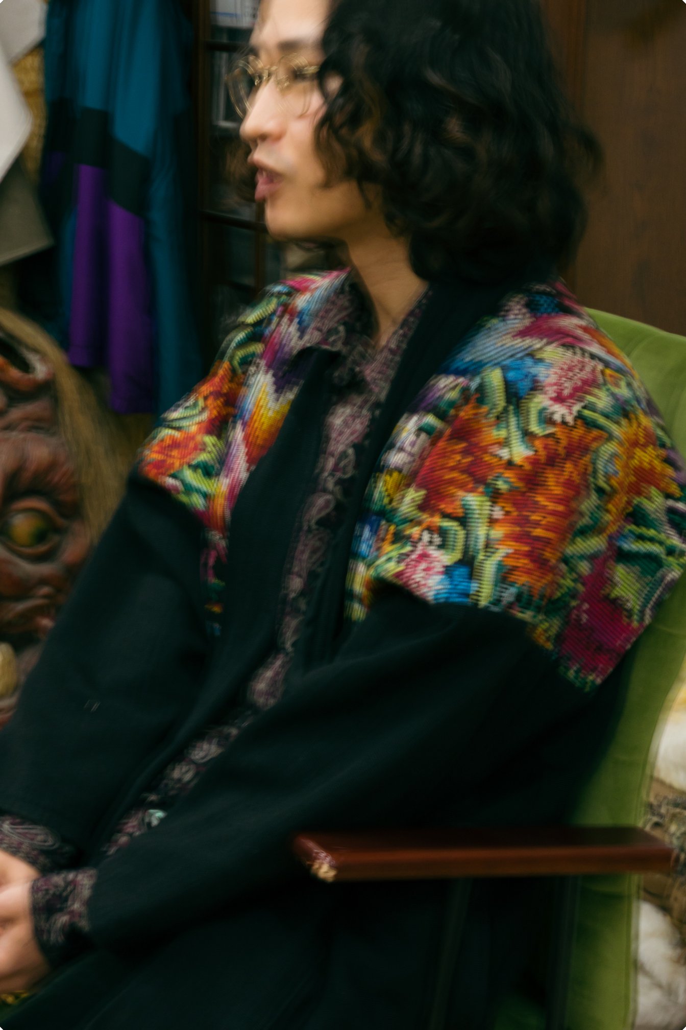 取材時は、柄が印象的な古着の羽織と「ニードルズ」のシャツを着用