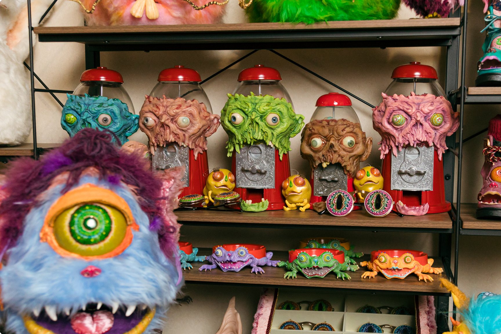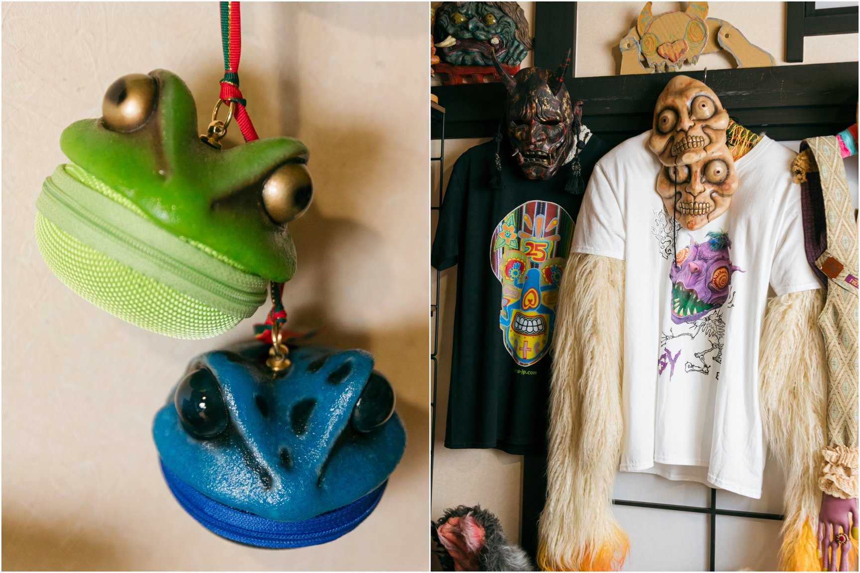 特殊メイクのアーティストは、裏方として映画やショーで使う何かを手掛けることが多いのですが、僕は一人のアーティストとして手掛けた作品を知ってもらいたいという思いがあって。例えば、カエルのコインケースを作ったりしているんですけど、 それも特殊メイクの技術や造形物を用いながら、色も特殊メイク的な塗り方をしています。そういう「誰が使うんだよ」みたいなものを誰かが買ってくれたり、それがいろんな人のカバンの中に入っていたりしたらすごく面白いなと思ったので、グッズなどを作り始めました。もっともカエルのコインケースは、元々実家が花とカエル雑貨の店をやっていたので、あまり仕事がなかった頃に店に置いて売ってもらって、小銭を稼いでいたところから始まっているんですが。