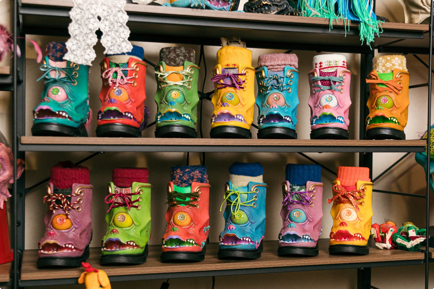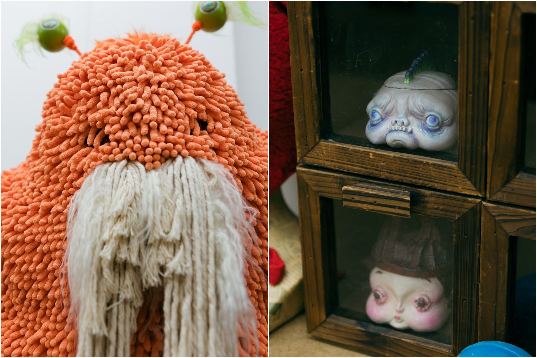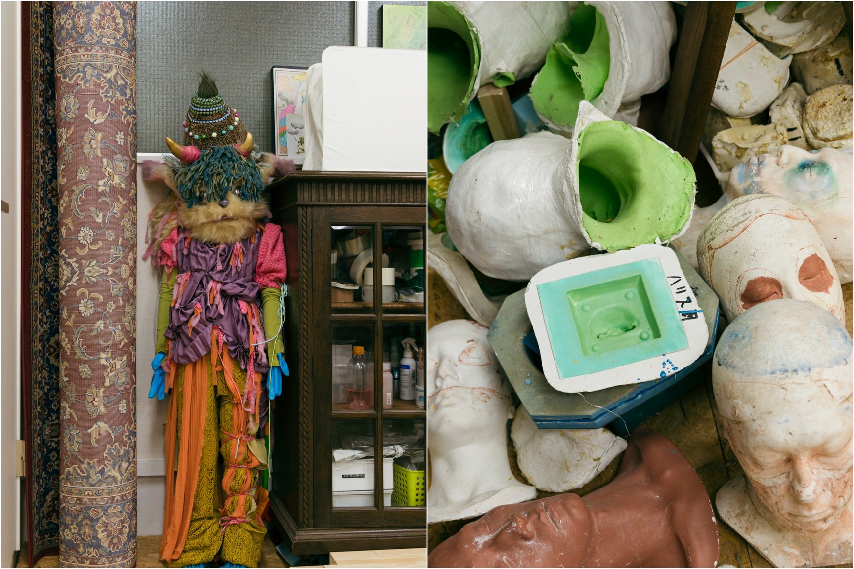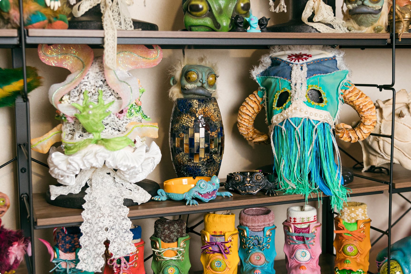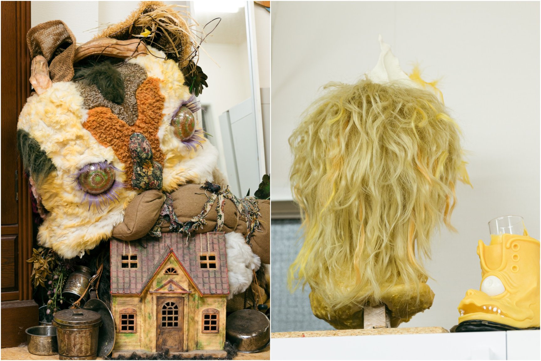 特殊メイクアップアーティストはどうしても裏方になりがちな職業なのですが、作品撮りをずっと続けていたので自分の作品がどんどん溜まっていってしまって。なので初めてやった展示は、「溜まったものを全部みんなに見せよう」「こんなに面白いことができるということを知ってほしい」という思いでやりました。去年開催した個展では、特殊メイクの技術を使って作ったものがいろいろな人の家にあったら面白いという発想から、約150点の大小様々な作品を展示販売しました。そんな感じで、とにかく「知ってほしい」「面白いよ」みたいな気持ちが大きいですね。