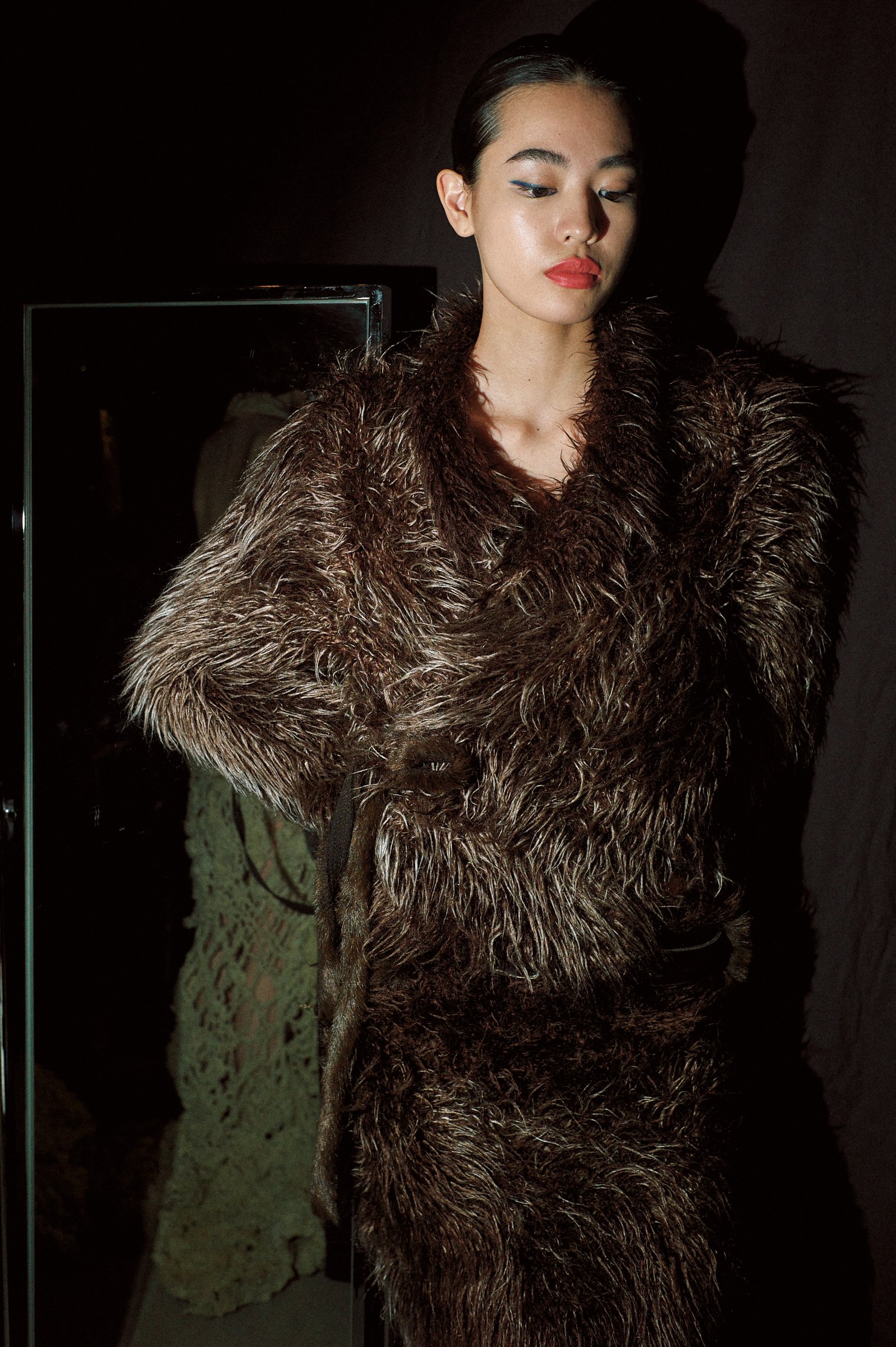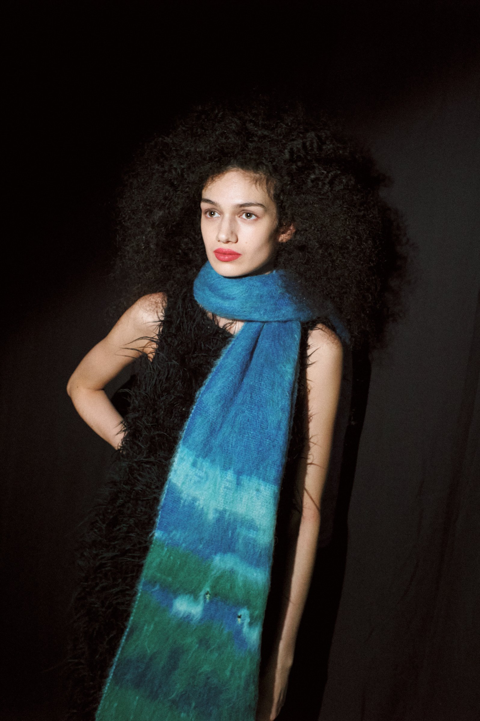 一体目のドレスは、ブランドのシグニチャーともなっている手紡ぎ糸のボリュームあるニットドレスだった。モデルはゆっくり、真っ直ぐ歩き、また舞台袖へと戻っていく。そういった調子で一体ずつたっぷりと時間をとって見せられていく。──この潔さ。誤魔化しのない具体的な提案の仕方が、デザイナーの実直な姿勢を表しているように思える。演出で雰囲気作りをしたりしない「ただハッキリと洋服を見せたい」という堂々とした態度。モデルはほとんど皆、素足だった。