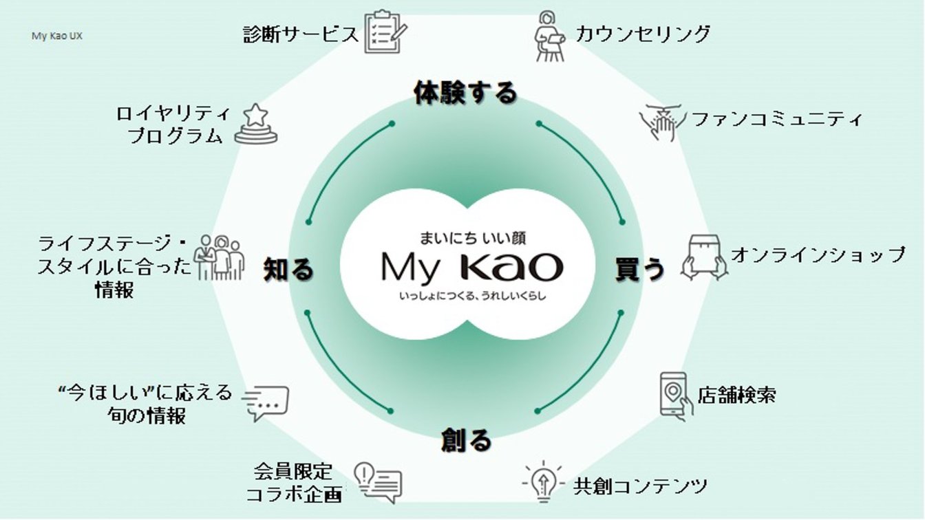 My Kaoは、日用品から化粧品まで幅広い商品を展開する花王が、グループ全体で生活者と直接つながる、双方向デジタルプラットフォームです。「知る」「体験する」「買う」「創る」の4つの機能からなり、これらを通じてOne-IDでお客さまとつながることで、お客さまを深く理解し、さまざまなUX(顧客体験)の提供につなげていきます。「買う」については、花王初のブランド横断EC「My Kao Mall」をオープンし、まずは化粧品の販売からスタートしています。