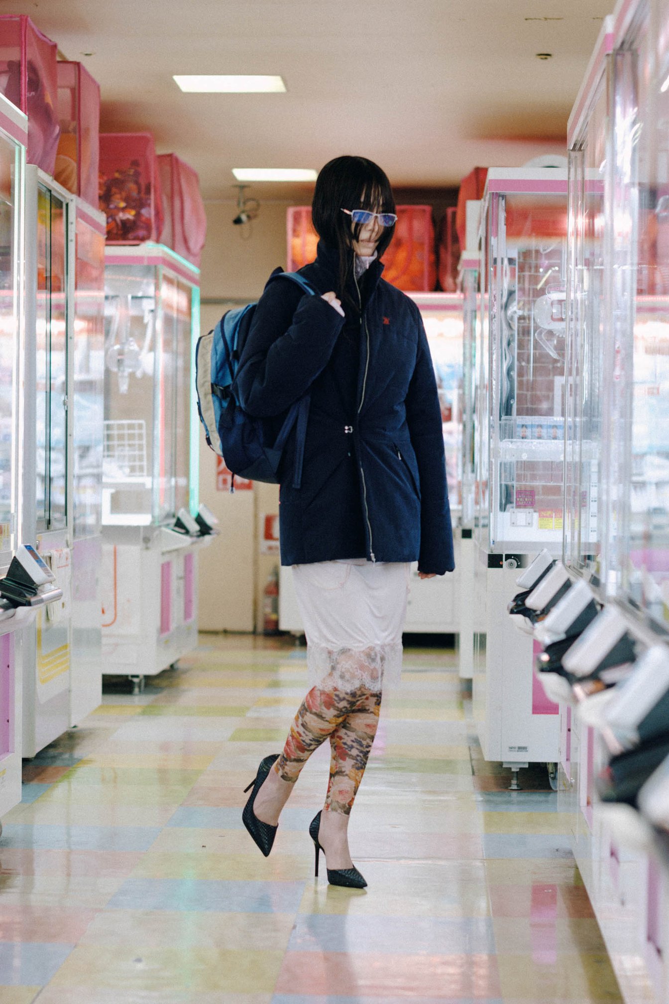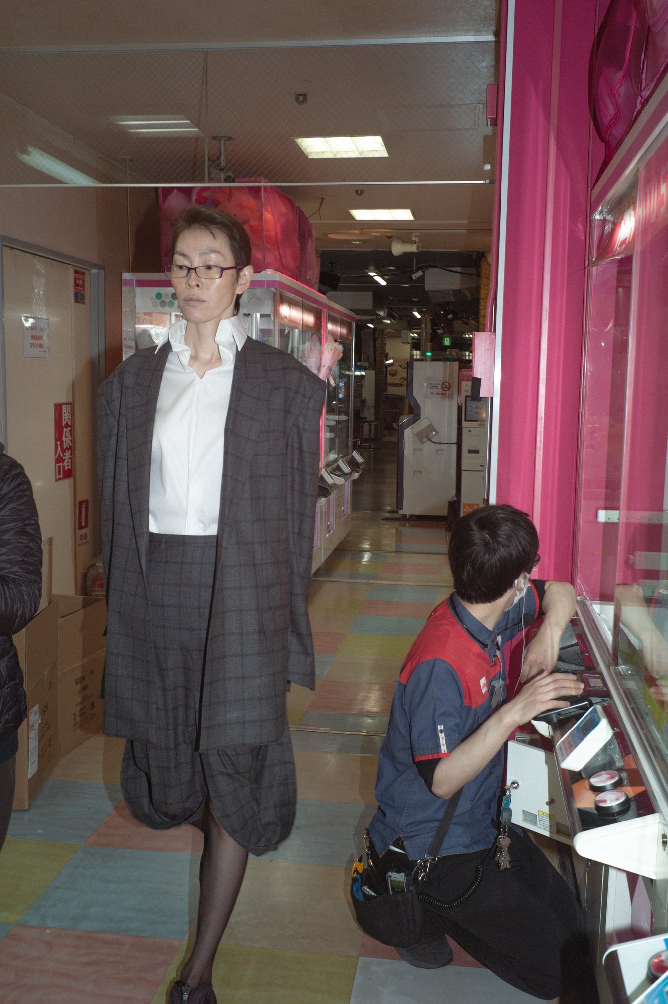 そんな思考を巡らしているとライトがつき、目前にふらりふらりとスローモーションのようにモデルがゆっくり歩いてきた。TSUTAYAのある2階から階段を降り、無表情のまま、周囲の喧騒は耳に入らないような様子でゲームセンターへと静かに吸い込まれていく。その後ろ姿を見送る感覚は、街中で偶然見た素敵な装いの人をつい目で追ってしまう時に似ていた。