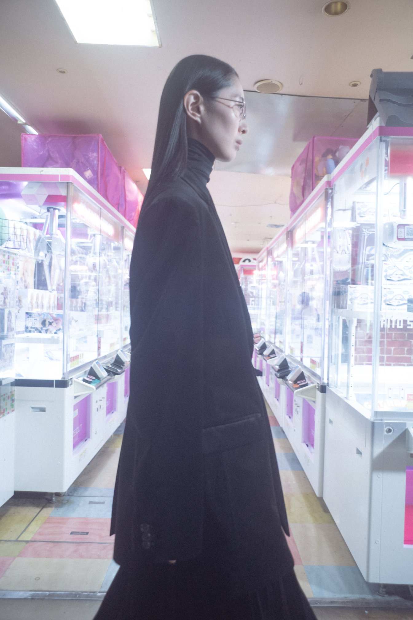 光が点滅し、電子音が飛び交い、タバコと汗の匂いが混ざったあの場所には、学校や職場という社会規律から離れ、自分の居心地を求めた彼・彼女らの土着的なスタイルが根付いている。エレガンスとは、ただ洗練されたものだけを指すのではない。時に生活の匂いが染み付いたもの、不完全で、不規則なものの中にも美しさは宿る。それを伝えるためには服だけでなく、”あの”少年が孤独を埋めるために通った生々しい空気感を体感してもらうことが必要だった。混沌とした空間でゆっくりと歩くモデルたちはまるで見廻りに来た生徒指導員。ケイスケヨシダの”あの”少年を探しているかのような緊張感が漂い、ドラマチックなシーンとして私の脳内に再現された。