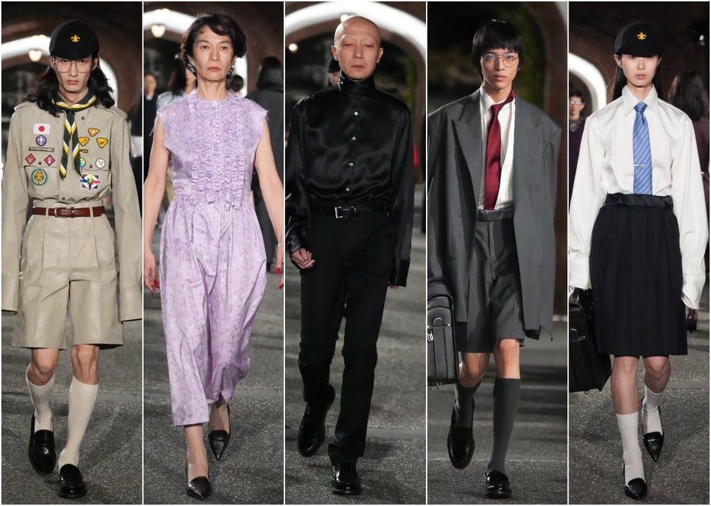 そんな風に今回のショーで登場したモデルは、吉田が明確に打ち出した人間像ではなく、自分の記憶の中にある装いを追随するような印象を覚えた。ミッション系大学では見覚えのある牧師、ボーイスカウトの少年少女、授業参観に着てくれた母親、黒板の前に立つ先生など、学舎に通っていればいくらか見覚えのある人々がランウェイを歩く。話を聞けば、今回のモデルはルックに合わせてキャスティングされたそうで「今までで一番人間像がなかった」と吉田も認めた。