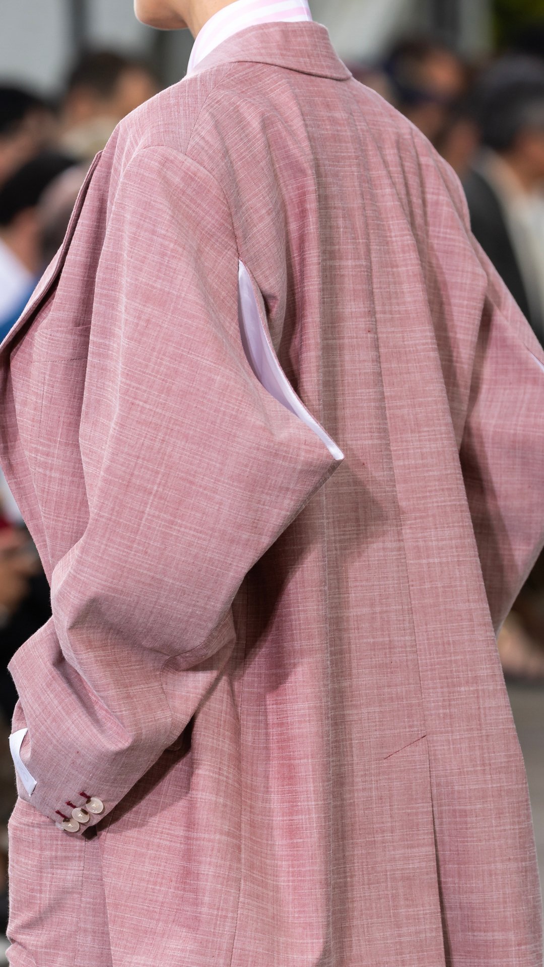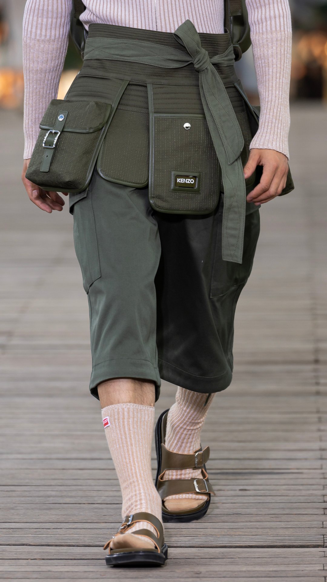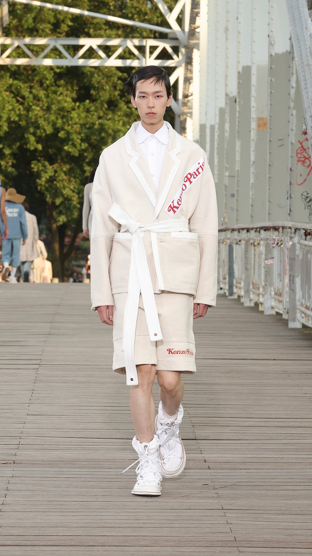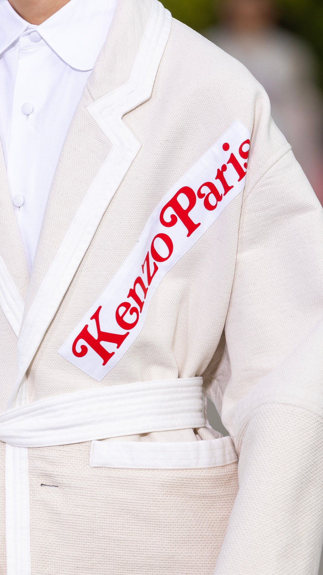 日本文化に由来するアイデアは、今やケンゾーを代表するモチーフだ。柔道着から着想したスーツは、今回のキールック。畳んだ道着を帯でくくり肩に掛ける、独特な持ち運び方もスタイリングに取り入れている。また、剣道ベルトを機能的なウエストバッグとして提案。テーラリングにも日本の着物に由来するカッティングを反映している。