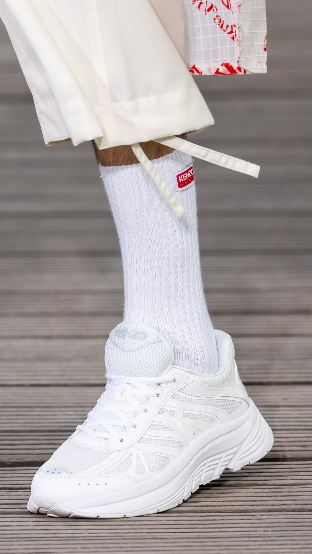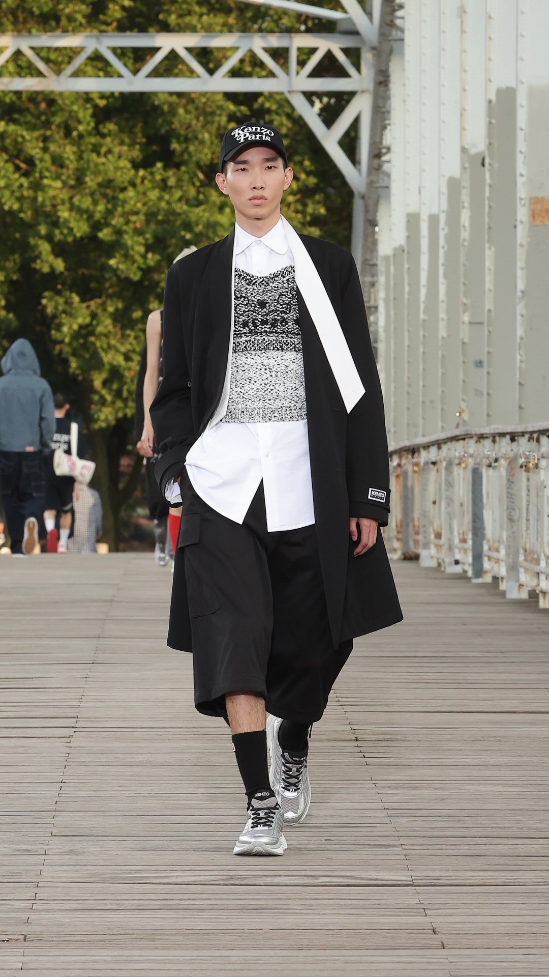 足元は、2シーズン目となるスニーカーの新作をはじめ、ウィメンズルックではエレガントなキトゥンヒールのミュールをスタイリング。チュールなど繊細な素材を積極的に用いることで、ポップでノンシャランな女性像も確立しつつある。クリエイティブ・ディレクターに就任して以来取り組んできた「リアル・トゥ・ウェア」のコンセプトを守りながら、Nigoのケンゾーはコレクションを重ねるごとに進化を続けている。