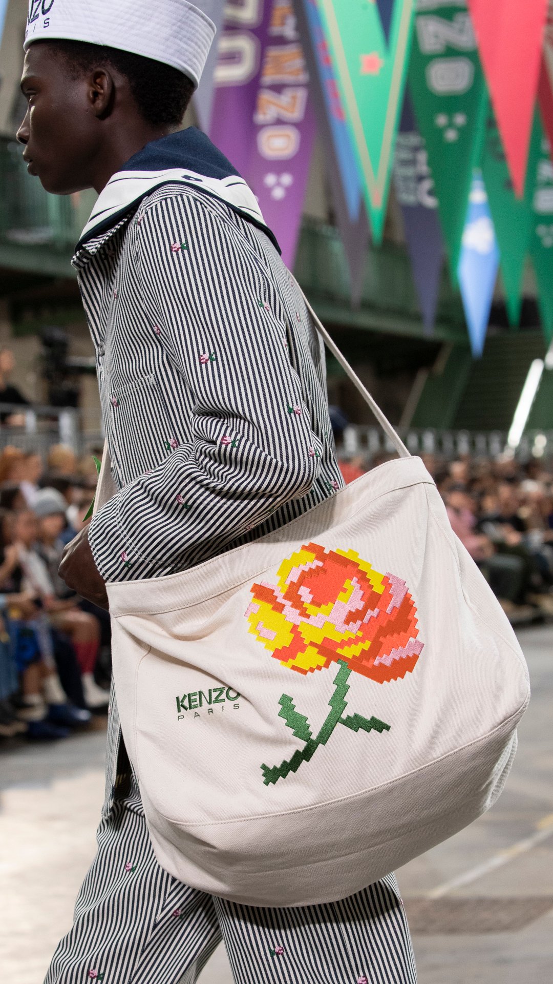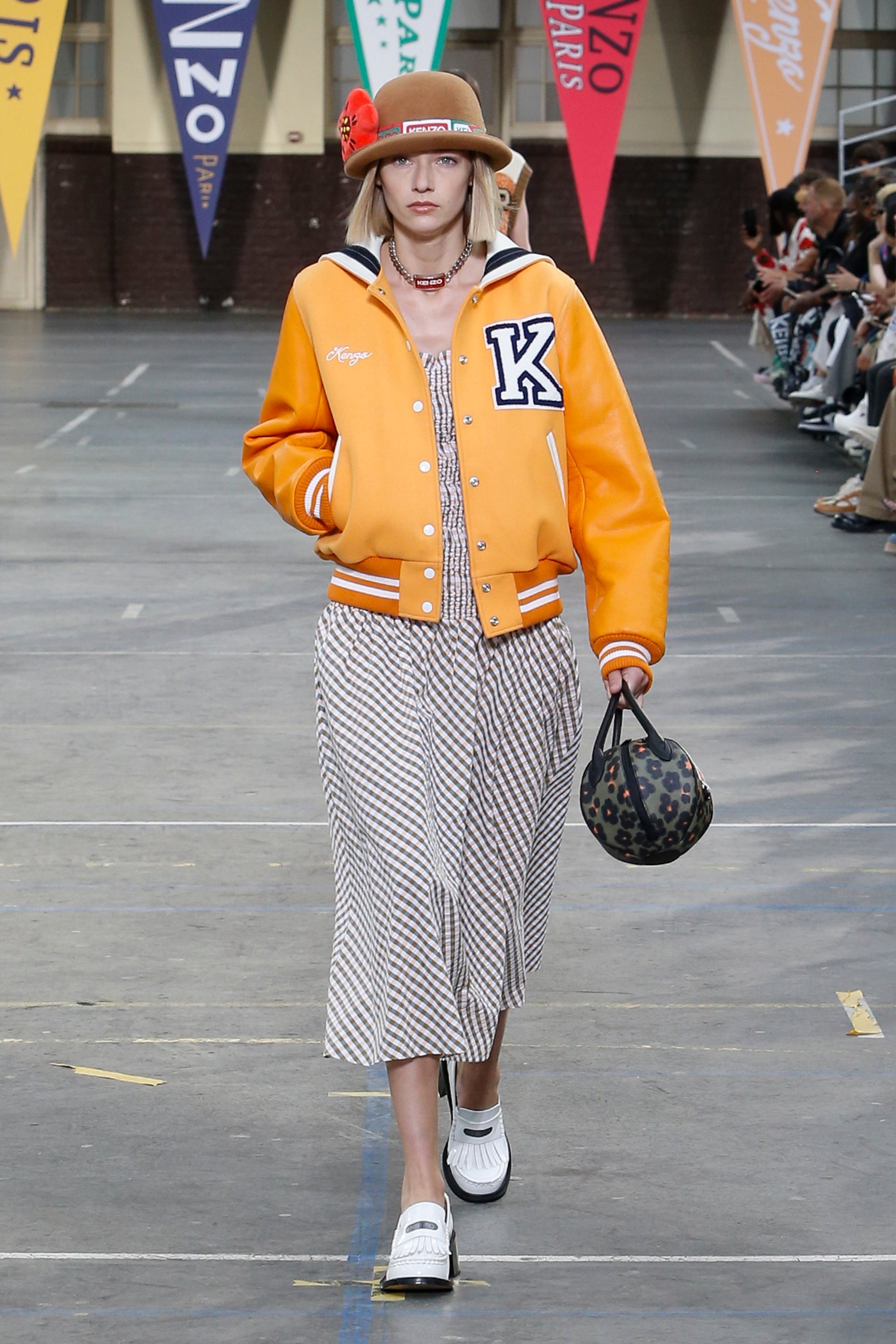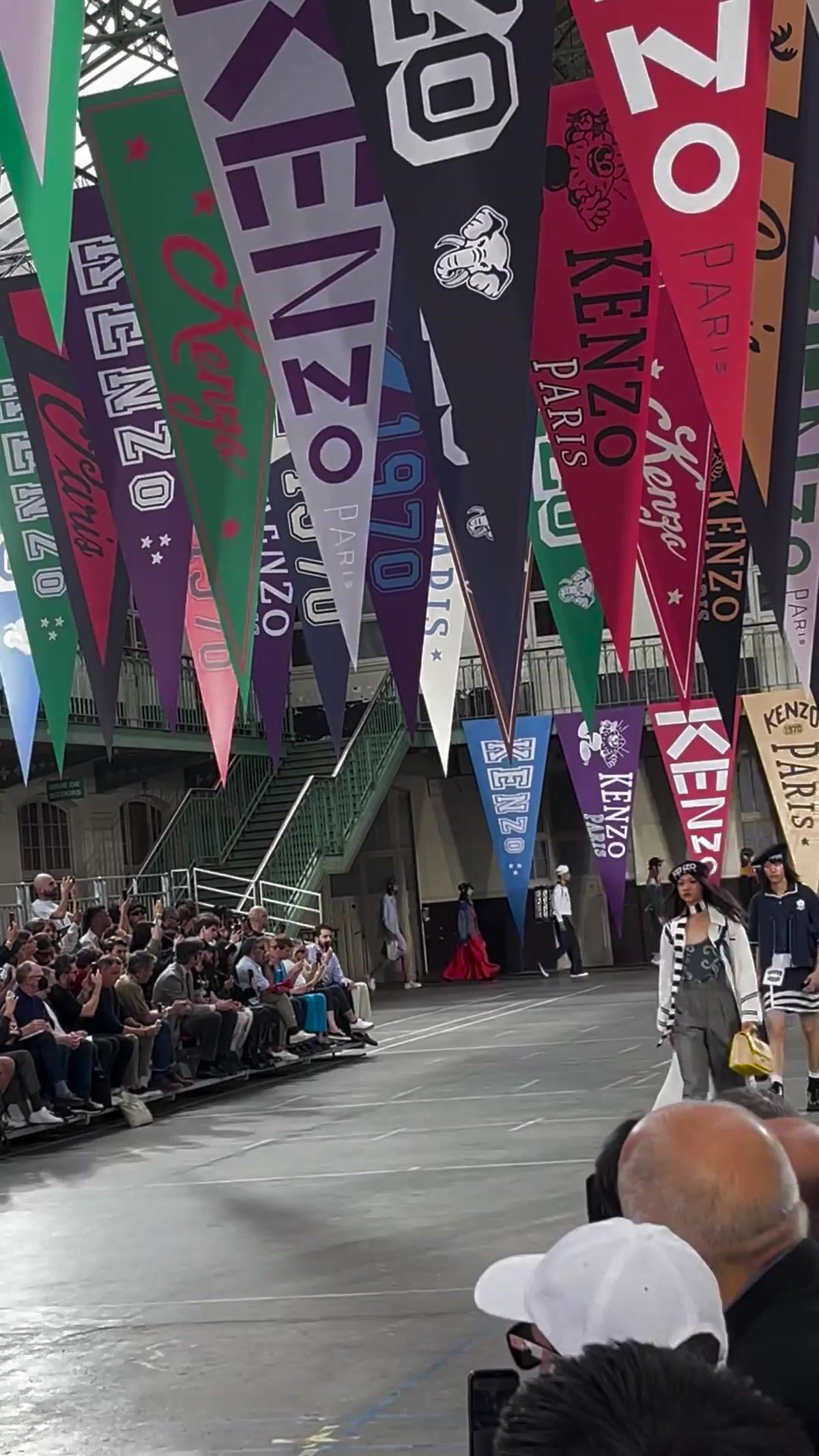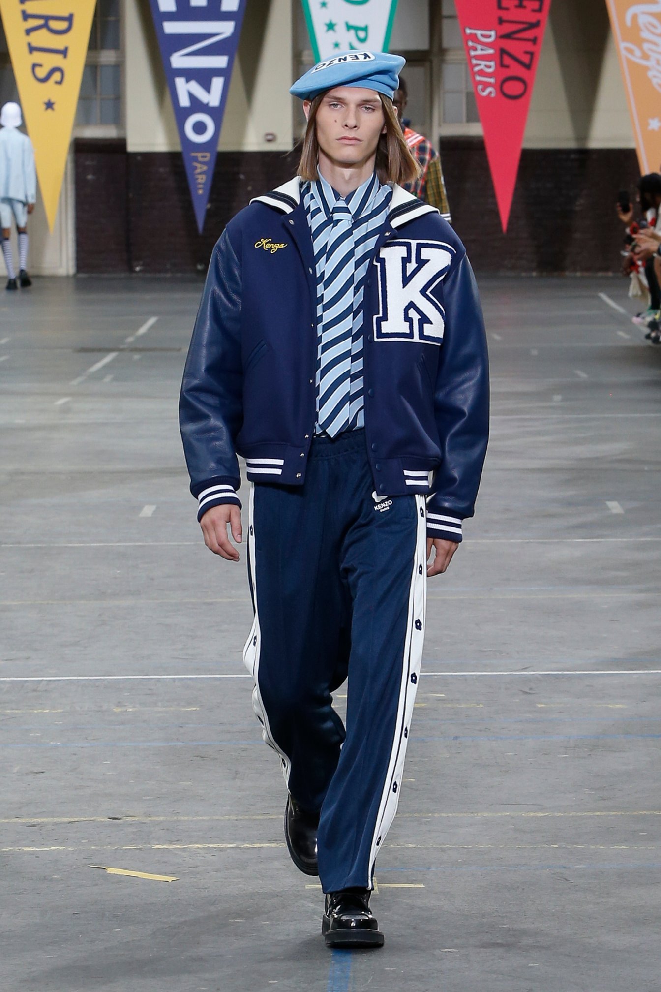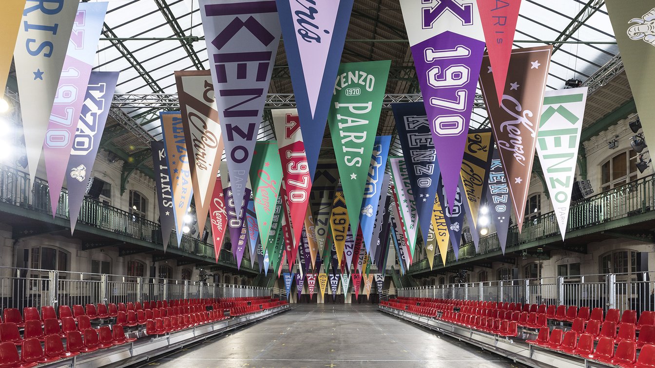 会場となったのは、パリ17区にある学校施設「リセ・カルノ」。天井からは「KENZO」「1970」の文字があしらわれた無数のペナントが吊り下げられていた。観客席にはミニサイズのフラッグが置かれていて、ショーの気分を盛り上げる。音楽はイエロー・マジック・オーケストラ(YMO)が演奏する「Firecracker」(オリジナル版は1978年発売)など、ティーンエイジャーだったNIGO®が「ケンゾー」を発見した当時の時代性を反映したものだという。