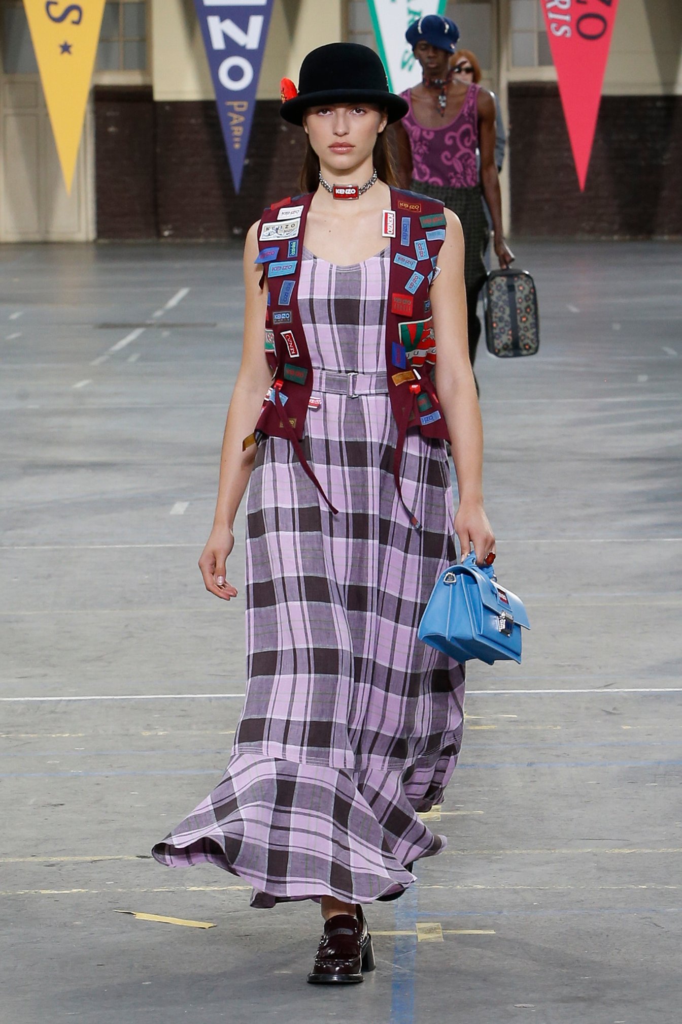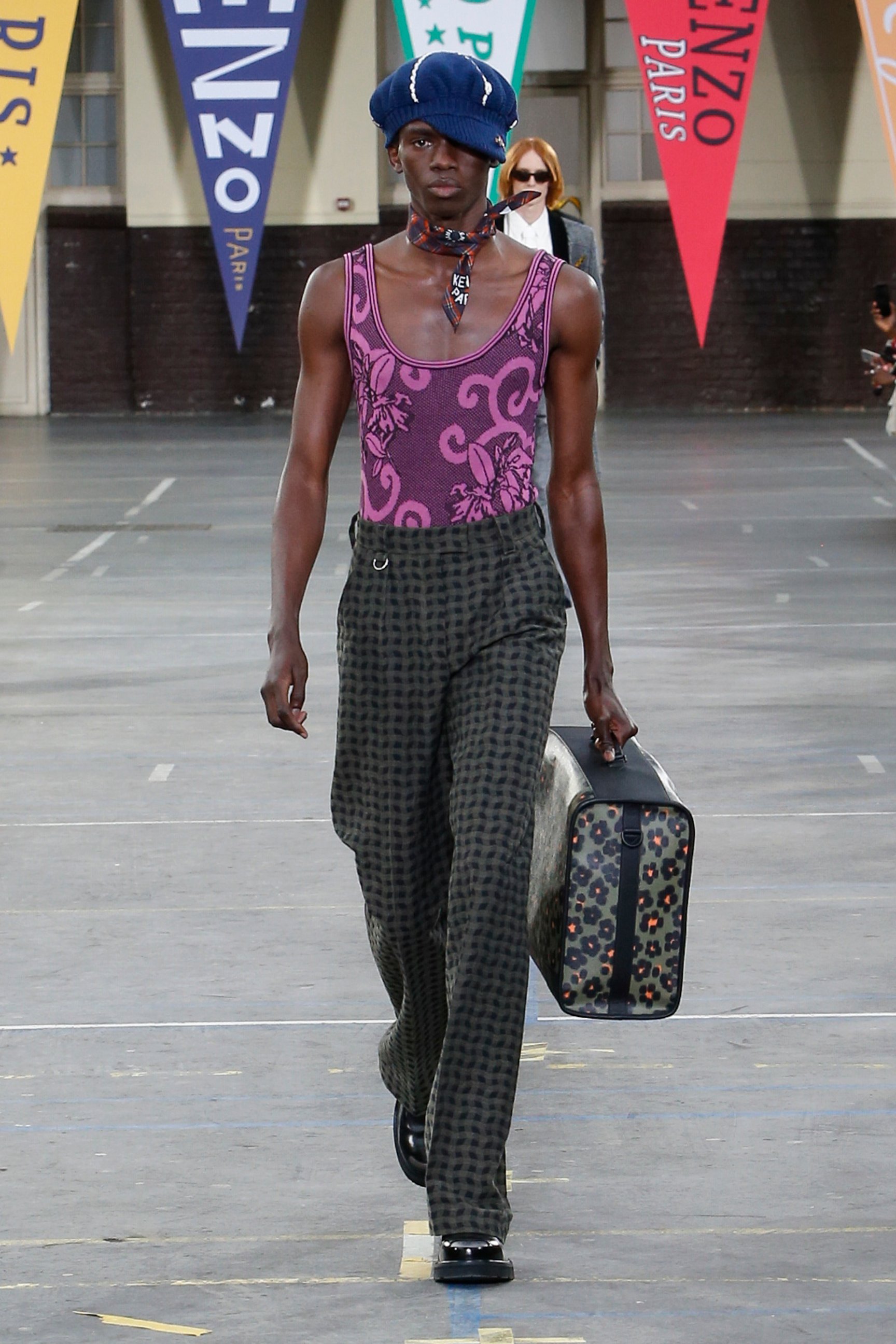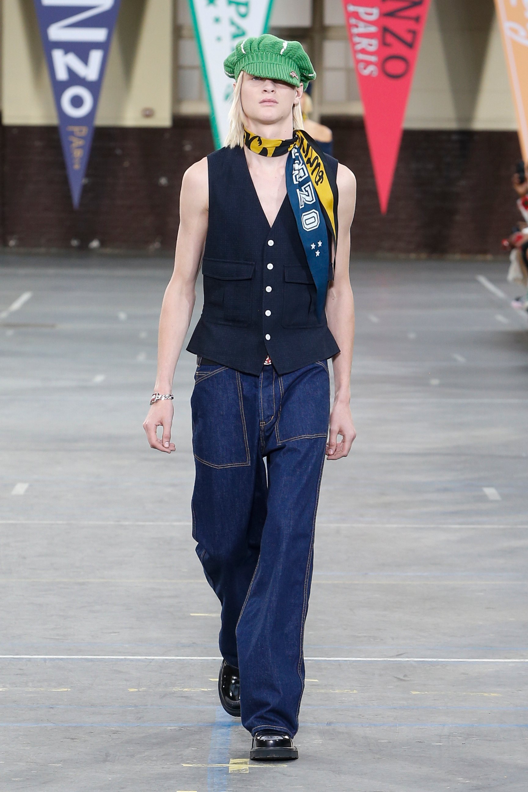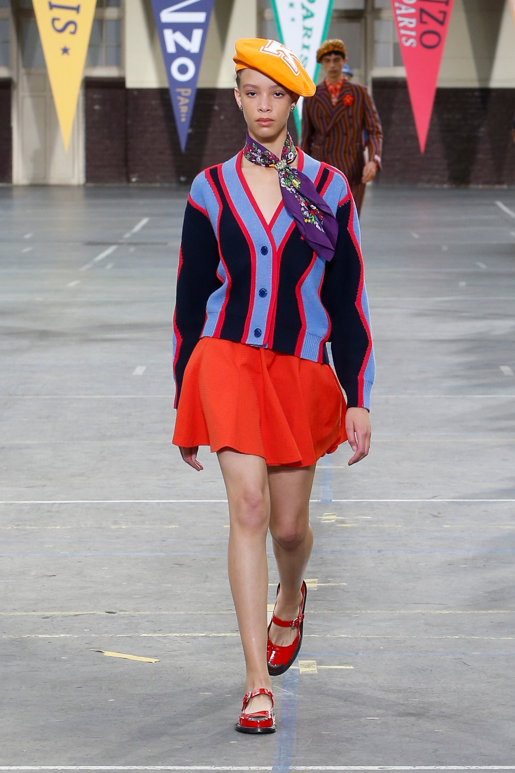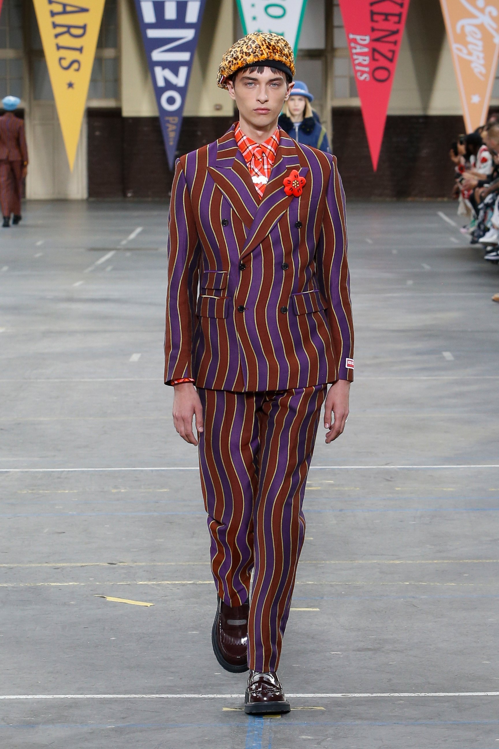 会場となったのは、パリ17区にある学校施設「リセ・カルノ」。天井からは「KENZO」「1970」の文字があしらわれた無数のペナントが吊り下げられていた。観客席にはミニサイズのフラッグが置かれていて、ショーの気分を盛り上げる。音楽はイエロー・マジック・オーケストラ(YMO)が演奏する「Firecracker」(オリジナル版は1978年発売)など、ティーンエイジャーだったNIGO®が「ケンゾー」を発見した当時の時代性を反映したものだという。