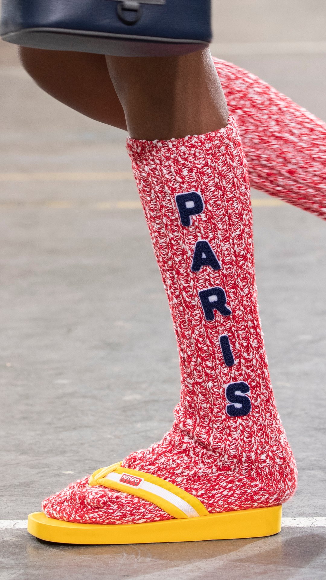 今回のコレクションは、アーカイブのシルエットとモチーフを取り入れ、創業者と後継者が共有する「日本的視点からのパリ」を再構築したもの。また、1980年代の日本のDCブランドブームを彷彿とさせるバーシティジャケットなど、日本人デザイナーならではの味付けもユニーク。足元には、草履をアレンジしたラバースライドをコーディネートした。