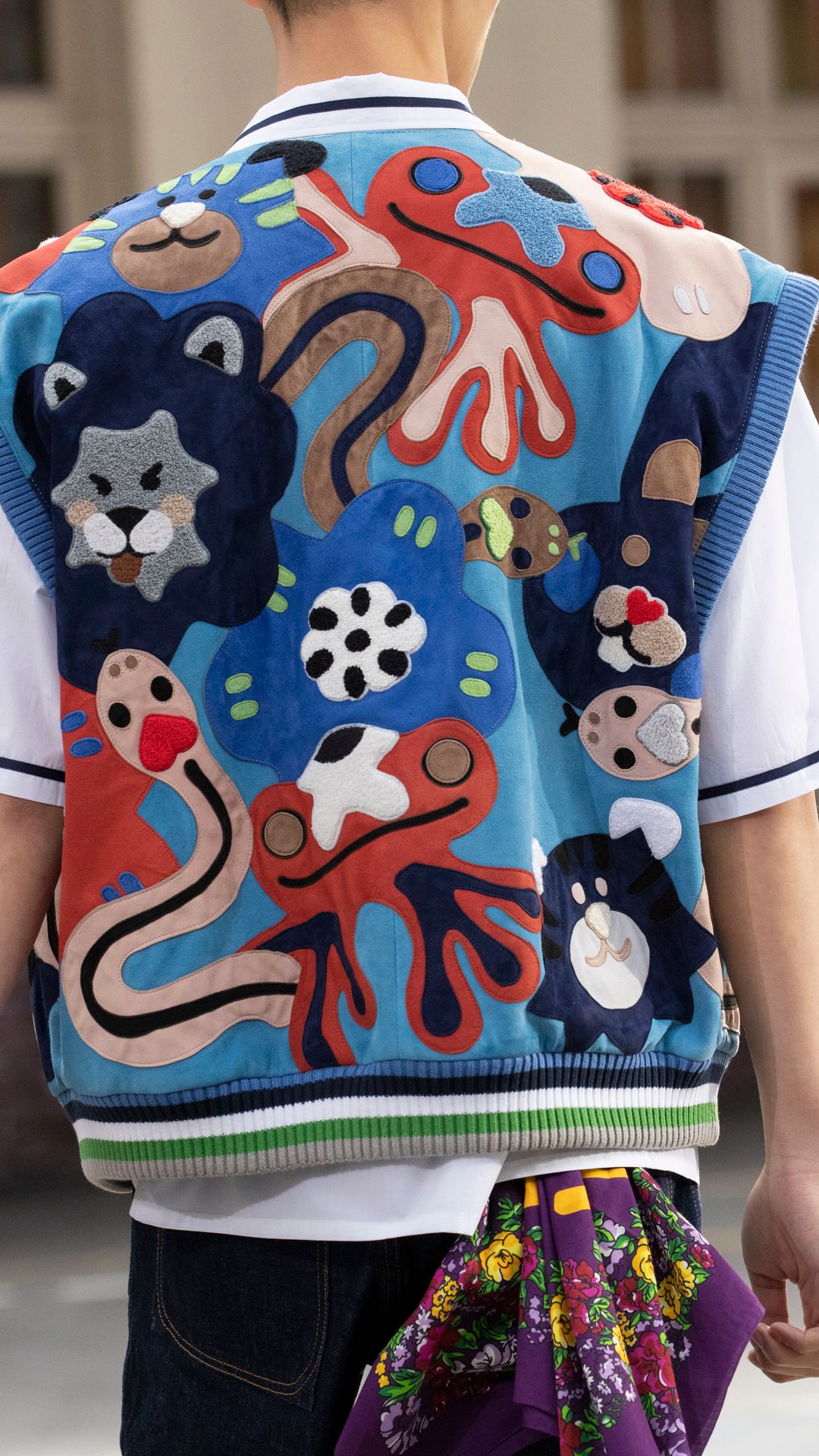 ベストを彩るカラフルな「KENZO」ラベルは、アーカイブコレクションで使われたラベルを複製したもの。これは、高田賢三がロゴとラベルを再開発することへ愛情を持っていたことに由来するという。様々なフォントやカラー、イラストを取り入れた歴代のラベルには、ブランドのこれまでのヒストリーが刻まれている。