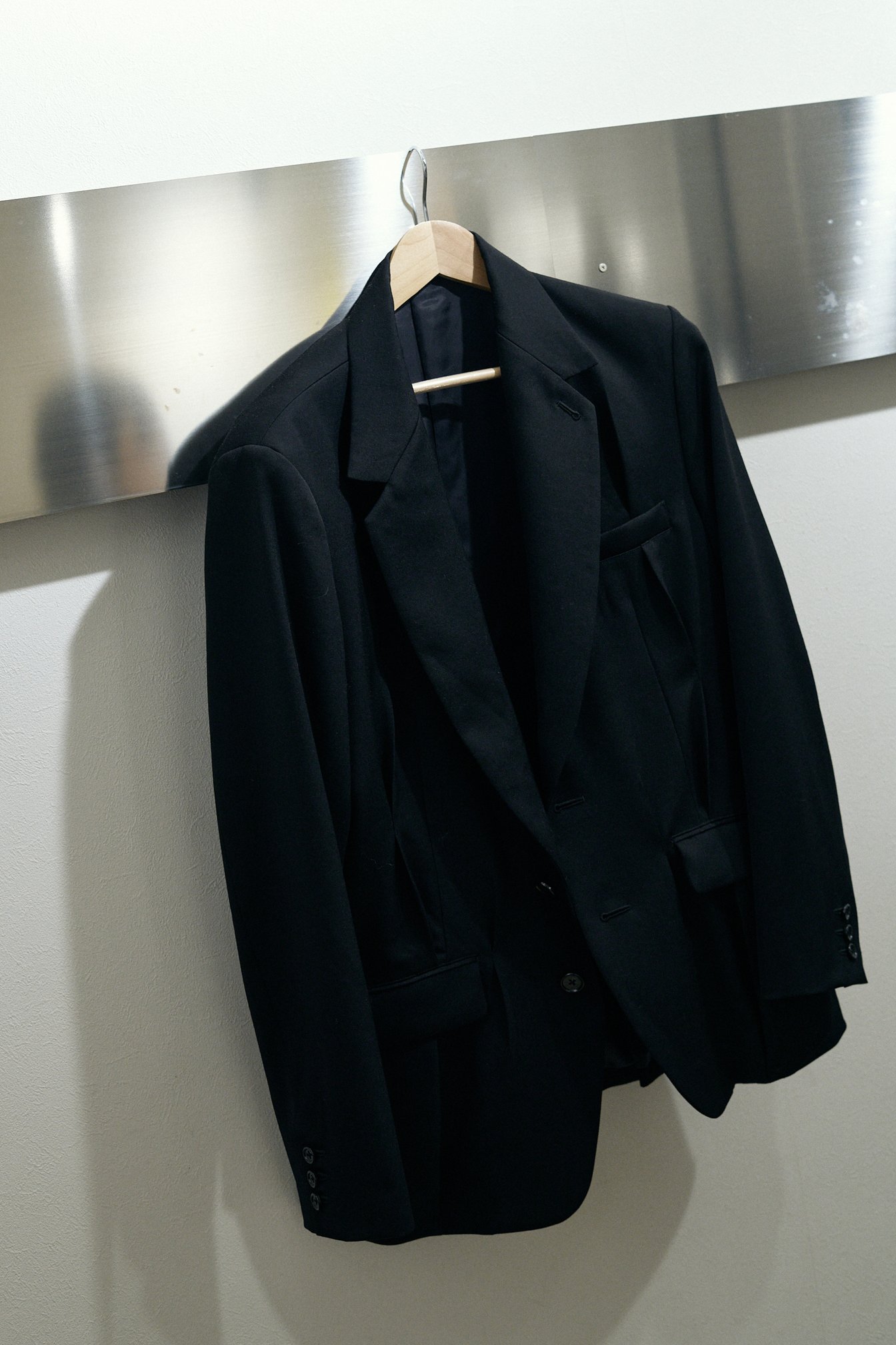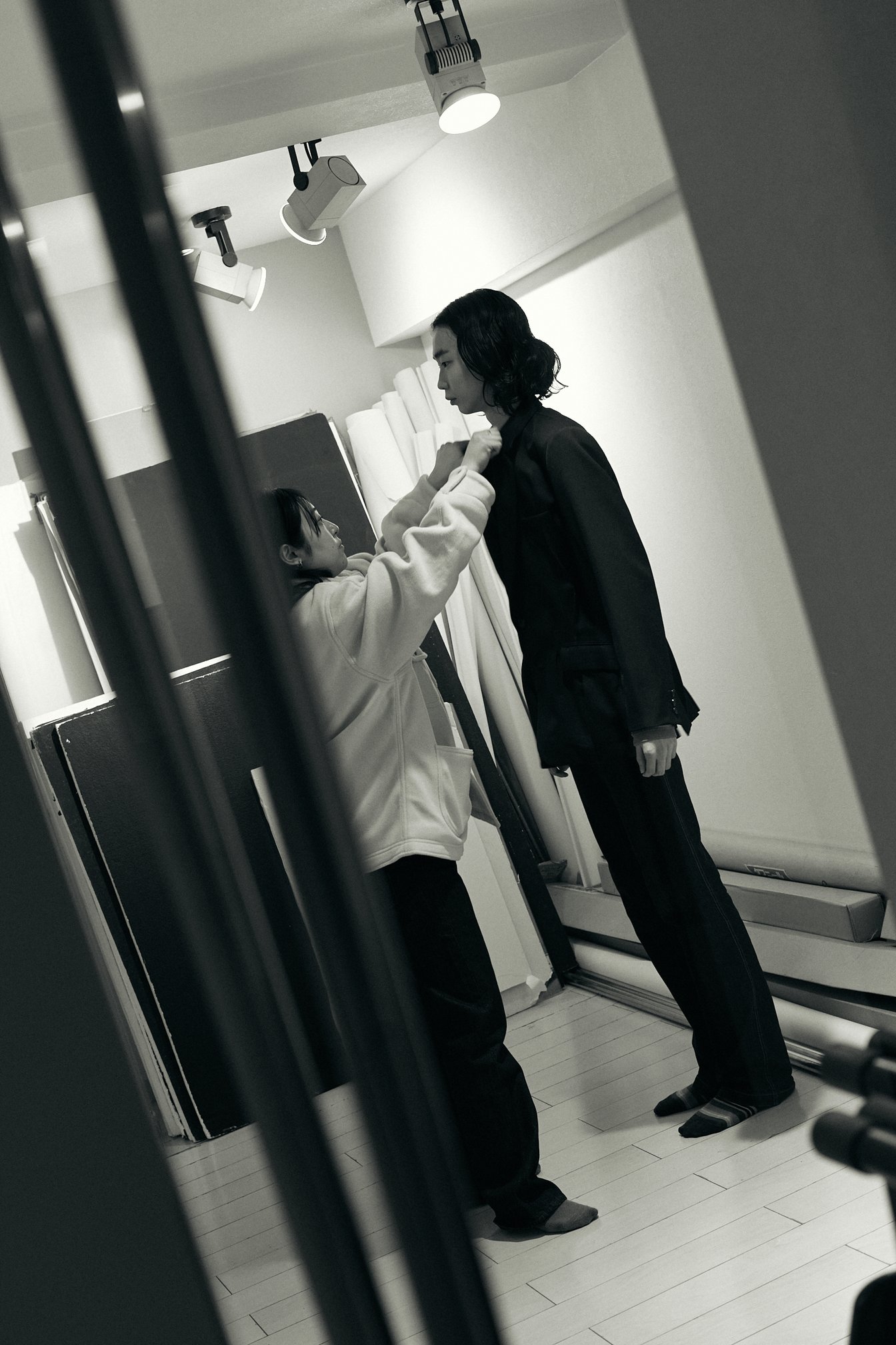 コンポジを受け取り、正面、左右、背面の写真を撮る。この段階で今回のコレクションのイメージに合うモデルかどうかを決める。通過した候補者にだけブラックのジャケットを羽織らせ、2回のウォーキングをして終了。その時間わずか1分30秒。穏やかな物腰は変わらないが、Kokiの眼差しは鋭い。撮影した写真はその場で出力し、ボードに貼り付けていく。