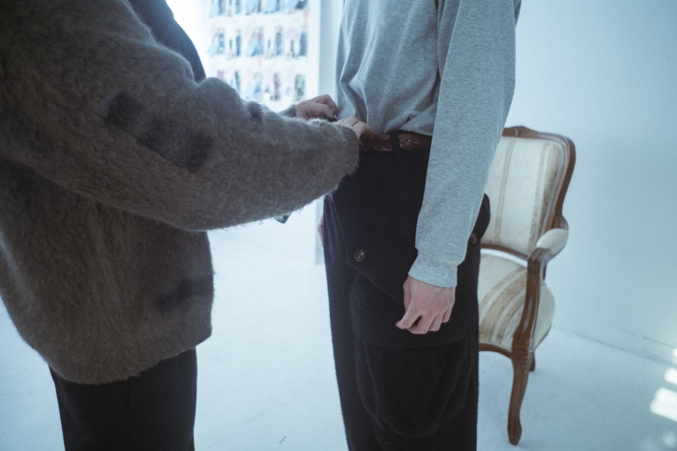 2月10日、ショー本番2日前のアトリエには意外にも静かで穏やかな時間が流れている。スタイリングのメモに沿って、モデルに衣装を着せ付け、四面図とウォーキングの様子を記録する。