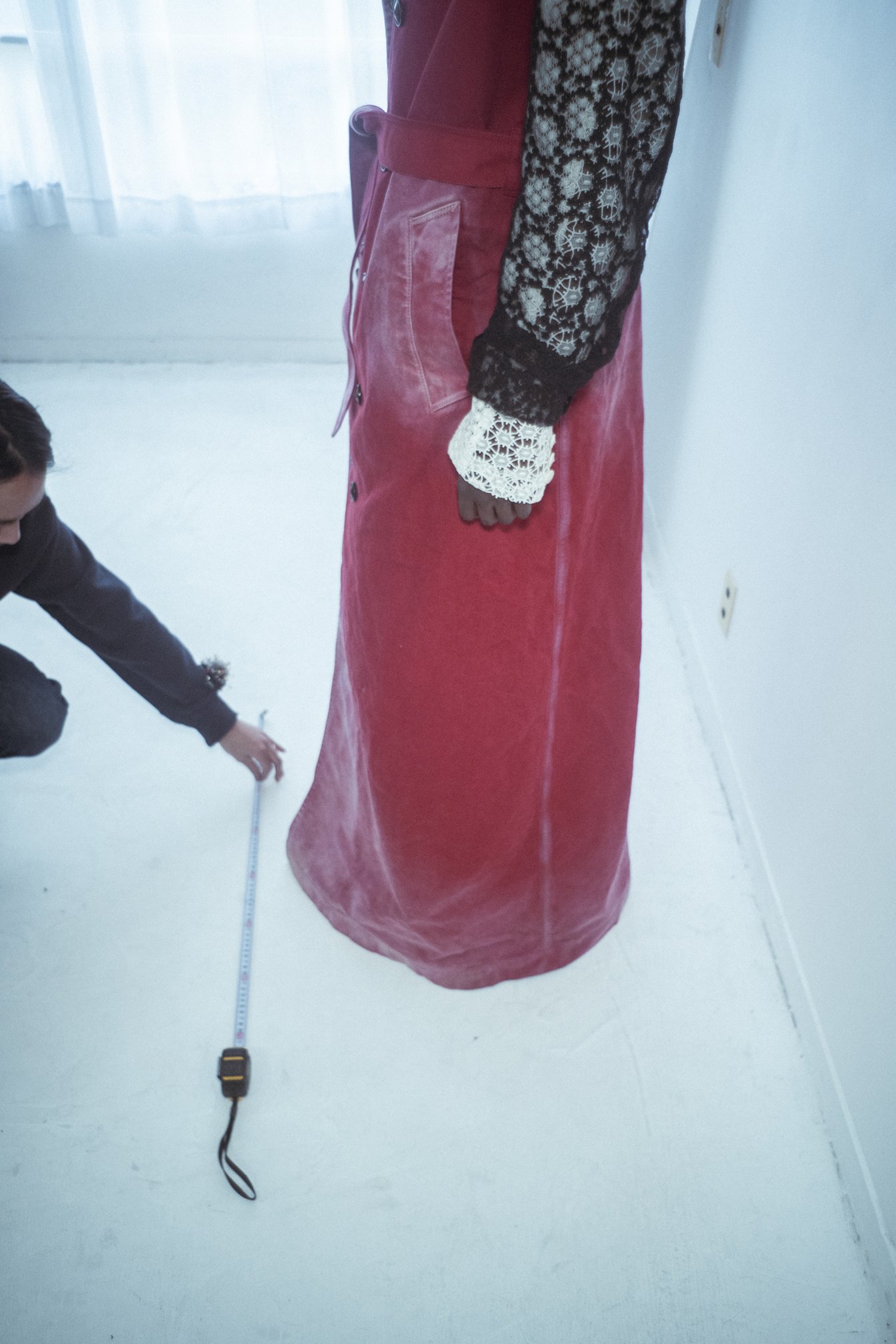ラストルックとなるコレクションピースの赤いコートは、裾のなびき方を計算するためにモデルの身長に対する裾のあまりを確認。ヘッドピースのフィッティングや歩く際にポケットに手を入れるかどうか、といった細かい点を確認していく。モデルの身のこなしがスタイリングのムードをより際立たせる。