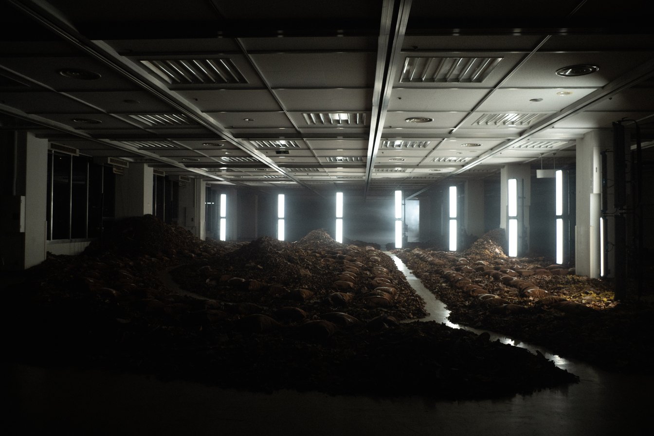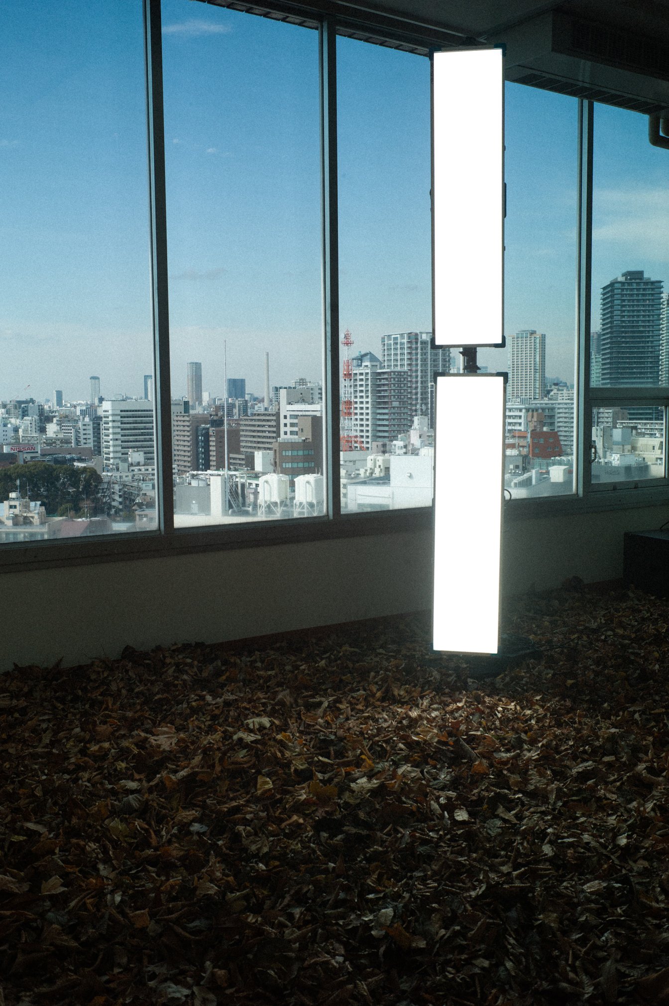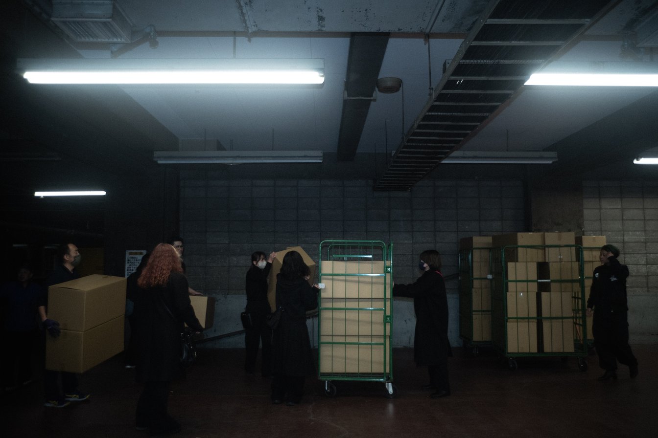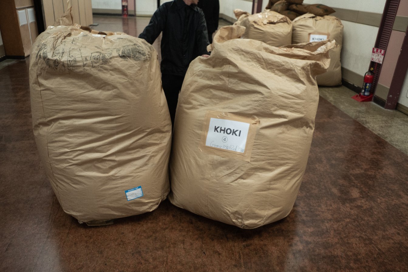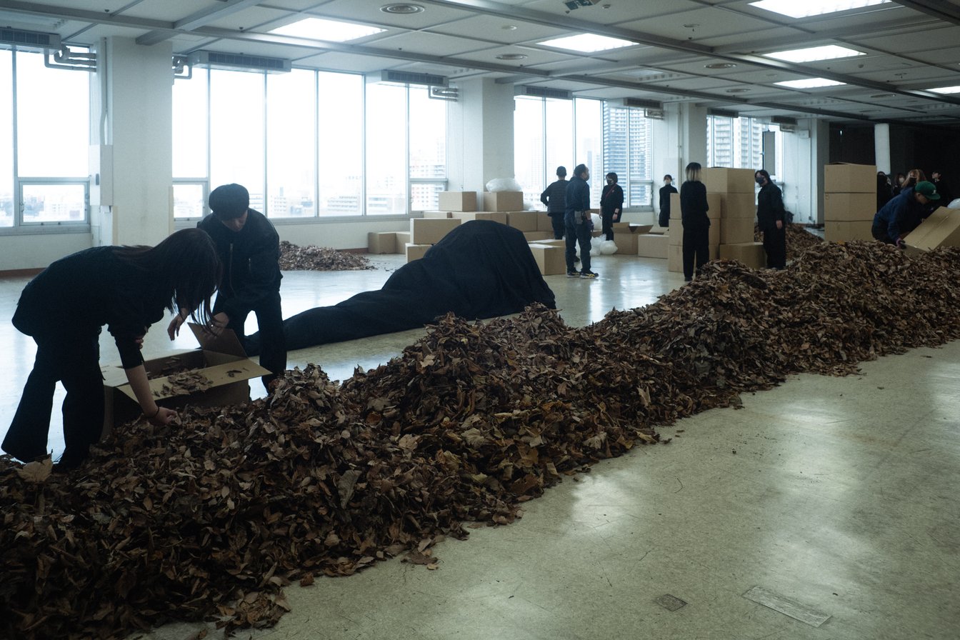 2トントラック4台分、ダンボール600箱の枯葉が運び込まれる。枯葉はいずれもKokiの実家がある山梨県の山から採集されたもの。秋口の発色が美しい時期に拾い集めた枯葉を、ドライフラワーを製造する家業の乾燥機で乾燥させ、色褪せないように保管していたという。