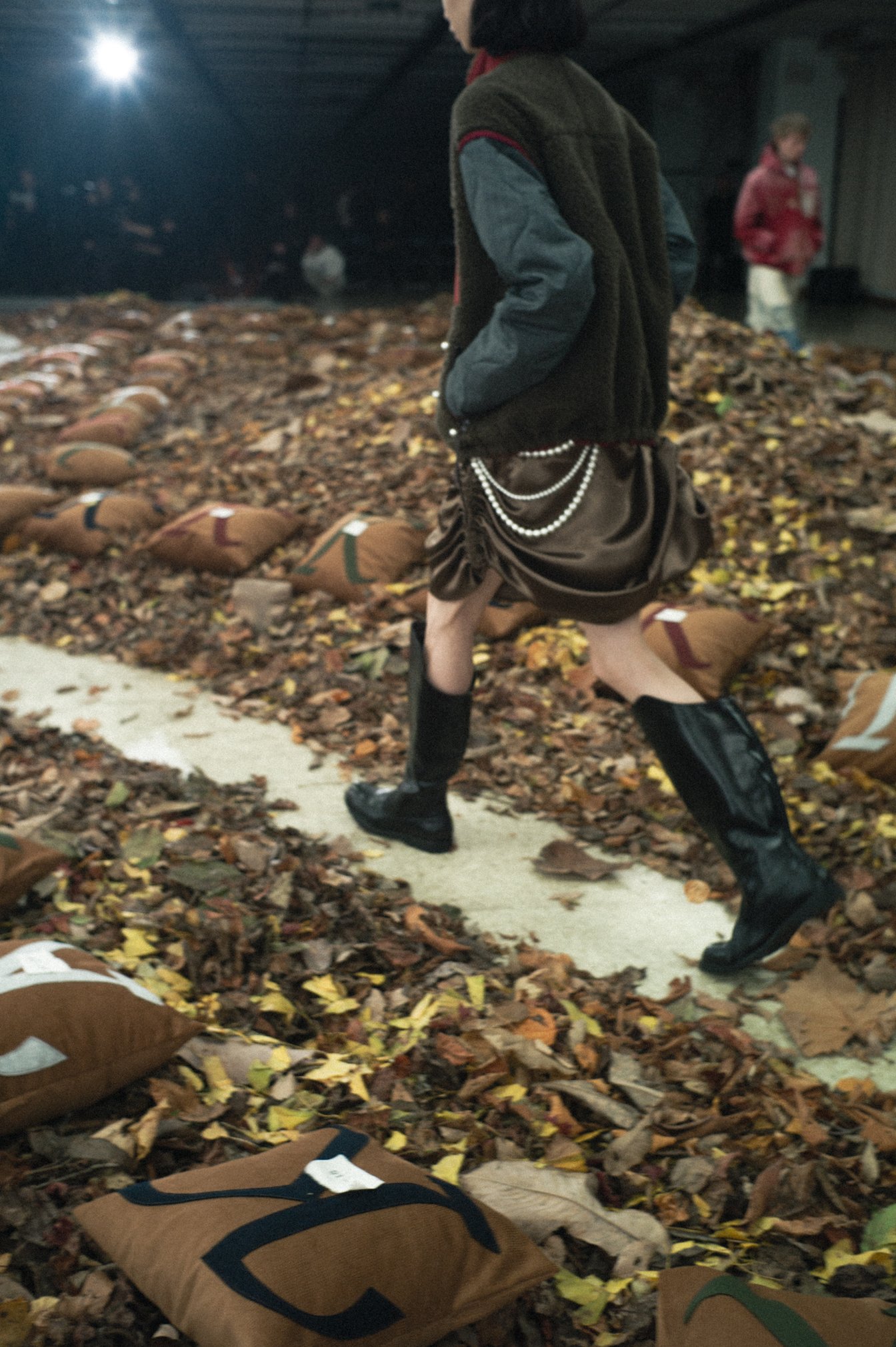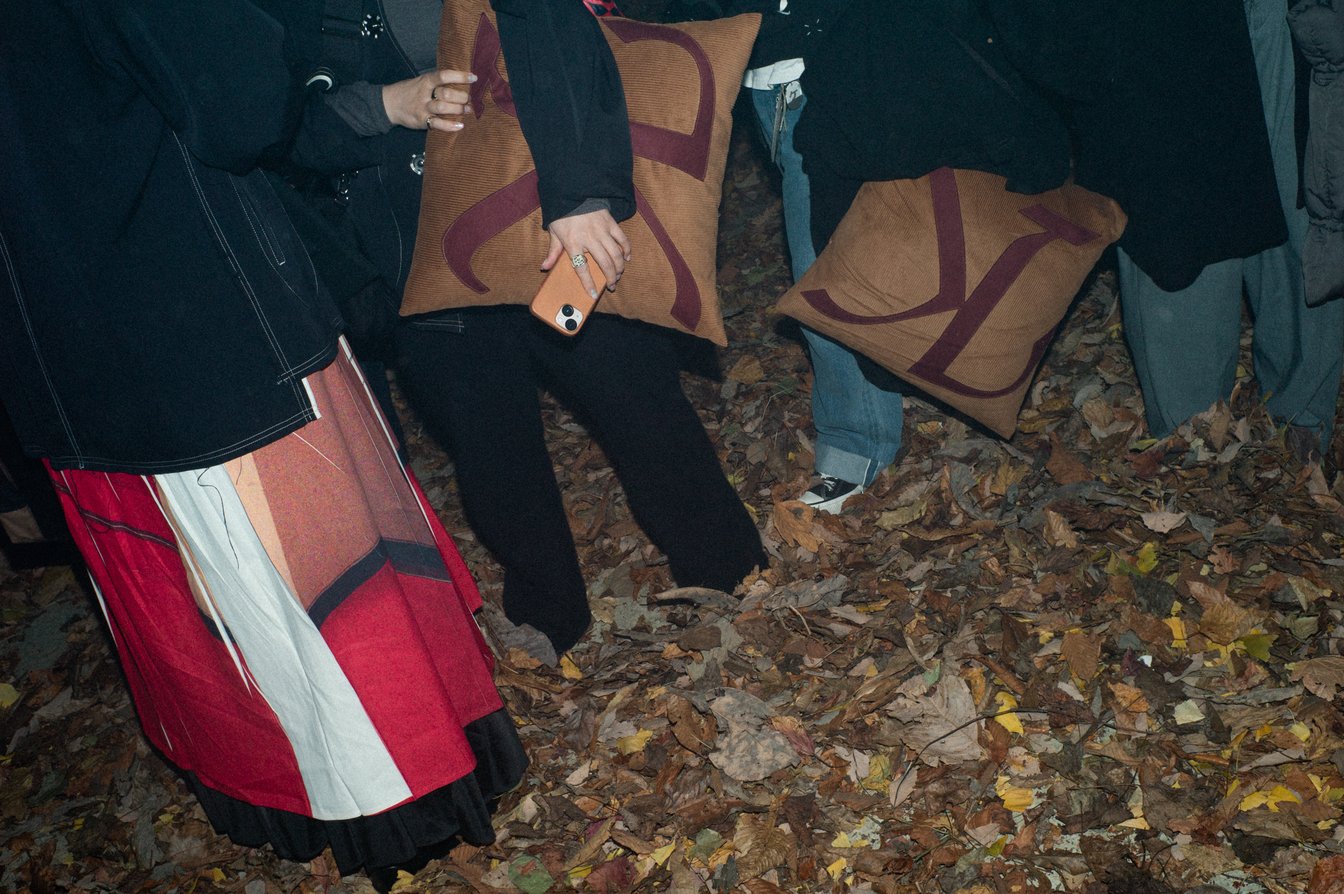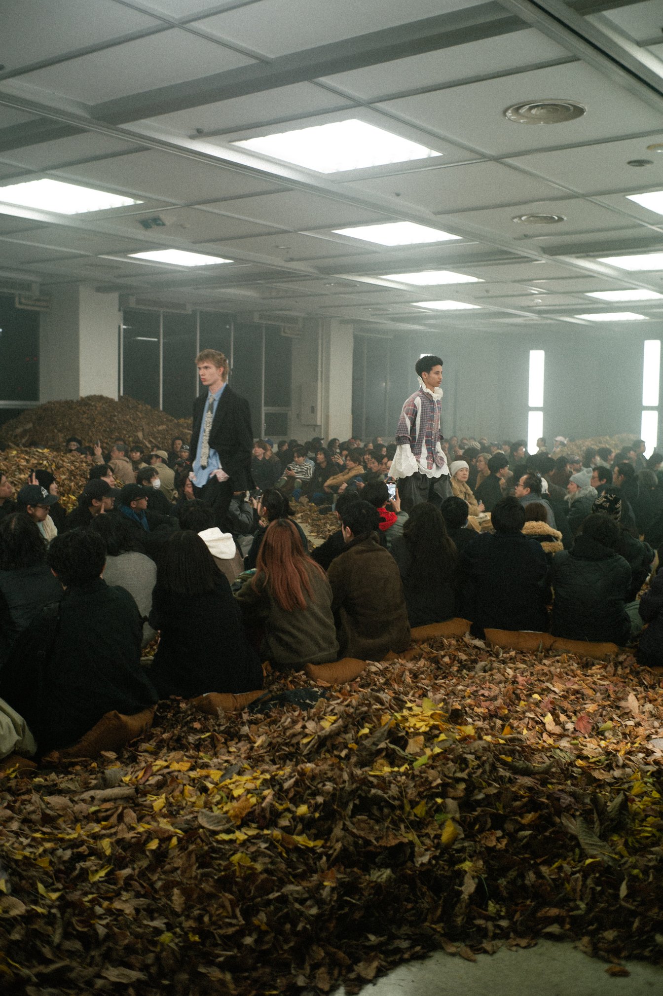 概ね敷き詰め終わった枯葉の上に、客席であるクッションが配置されていく。ランウェイの幅は異例の40cm。クッションは、ブラウンのコーデュロイにコッキの「K」の文字が施されている。ランウェイに立ってみると、客席から眺めている以上に狭く、客席は脚が触れそうなほど近い。しかしこの観客とモデルの距離の近さはKokiきっての希望だ。鑑賞者と被鑑賞者としての関係ではなく、空間全体が「コミュニティに見える」ようにしたい、という思いがそこにはあった。