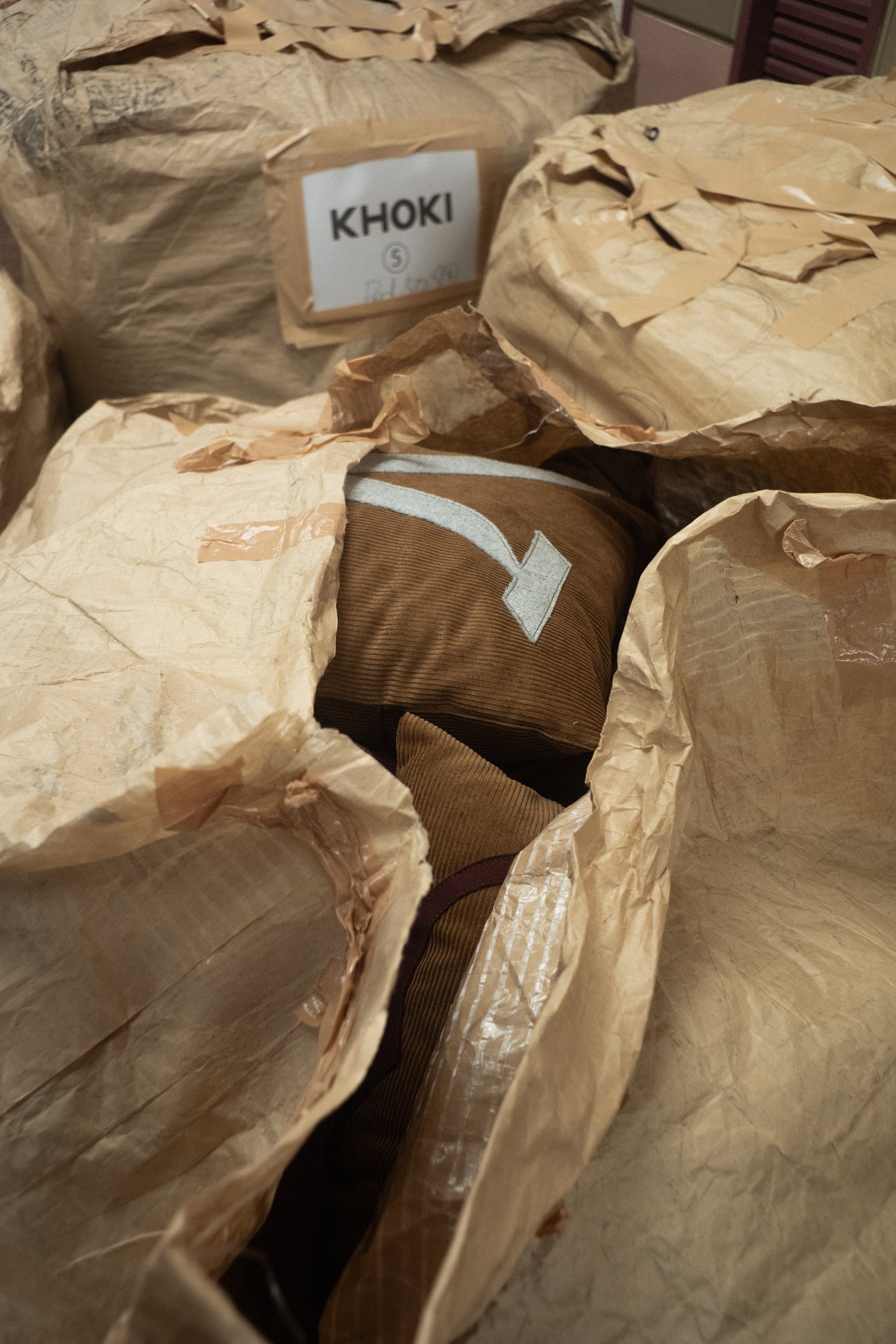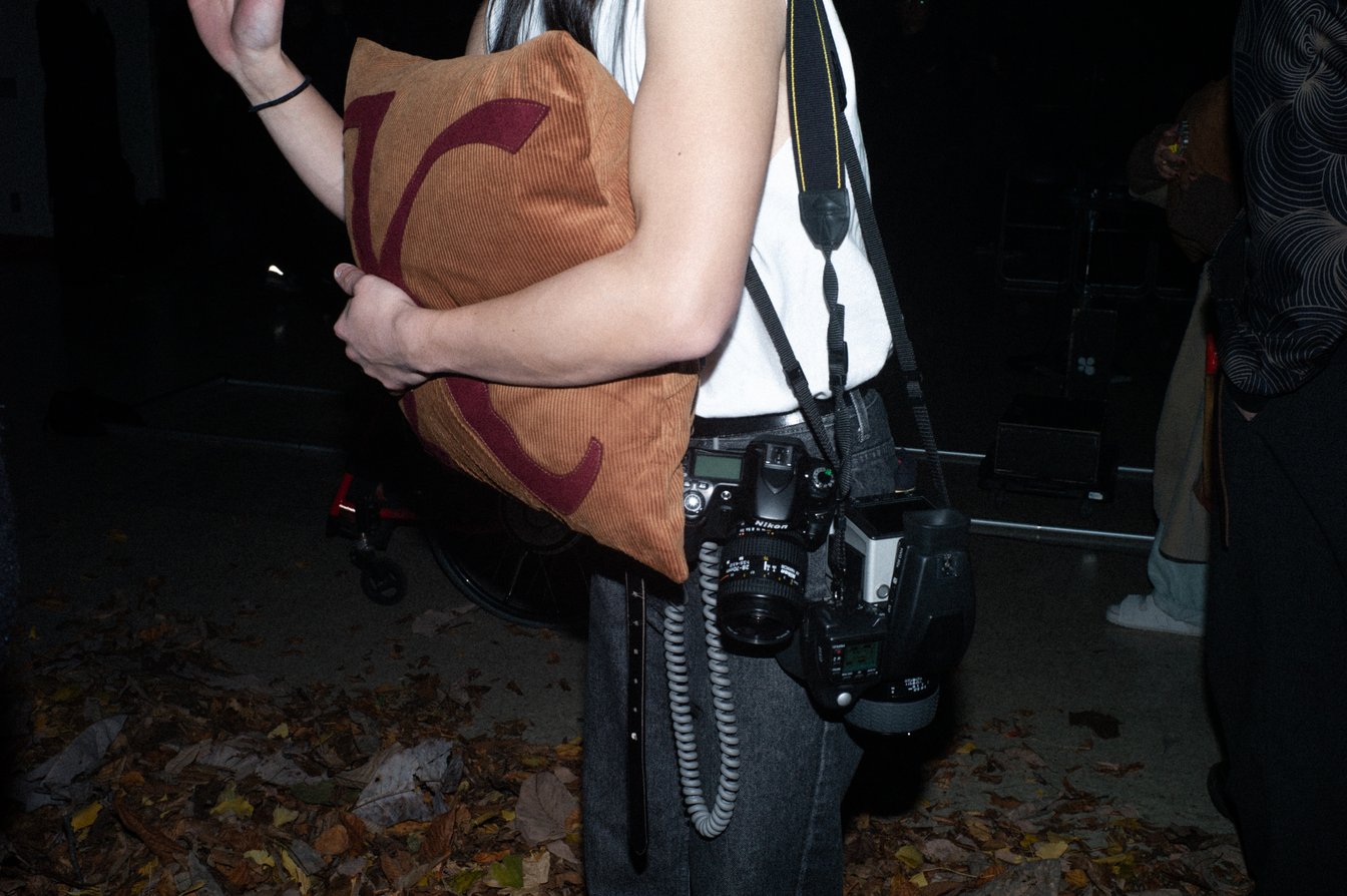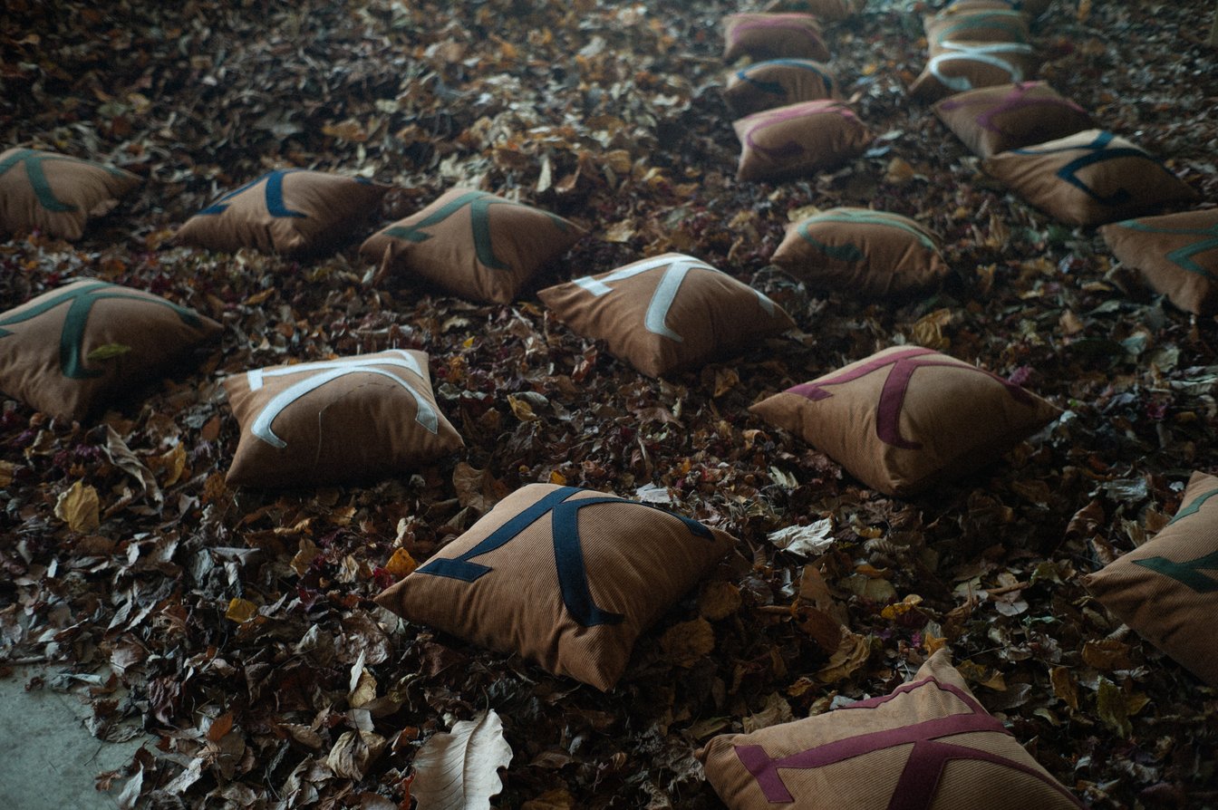 概ね敷き詰め終わった枯葉の上に、客席であるクッションが配置されていく。ランウェイの幅は異例の40cm。クッションは、ブラウンのコーデュロイにコッキの「K」の文字が施されている。ランウェイに立ってみると、客席から眺めている以上に狭く、客席は脚が触れそうなほど近い。しかしこの観客とモデルの距離の近さはKokiきっての希望だ。鑑賞者と被鑑賞者としての関係ではなく、空間全体が「コミュニティに見える」ようにしたい、という思いがそこにはあった。
