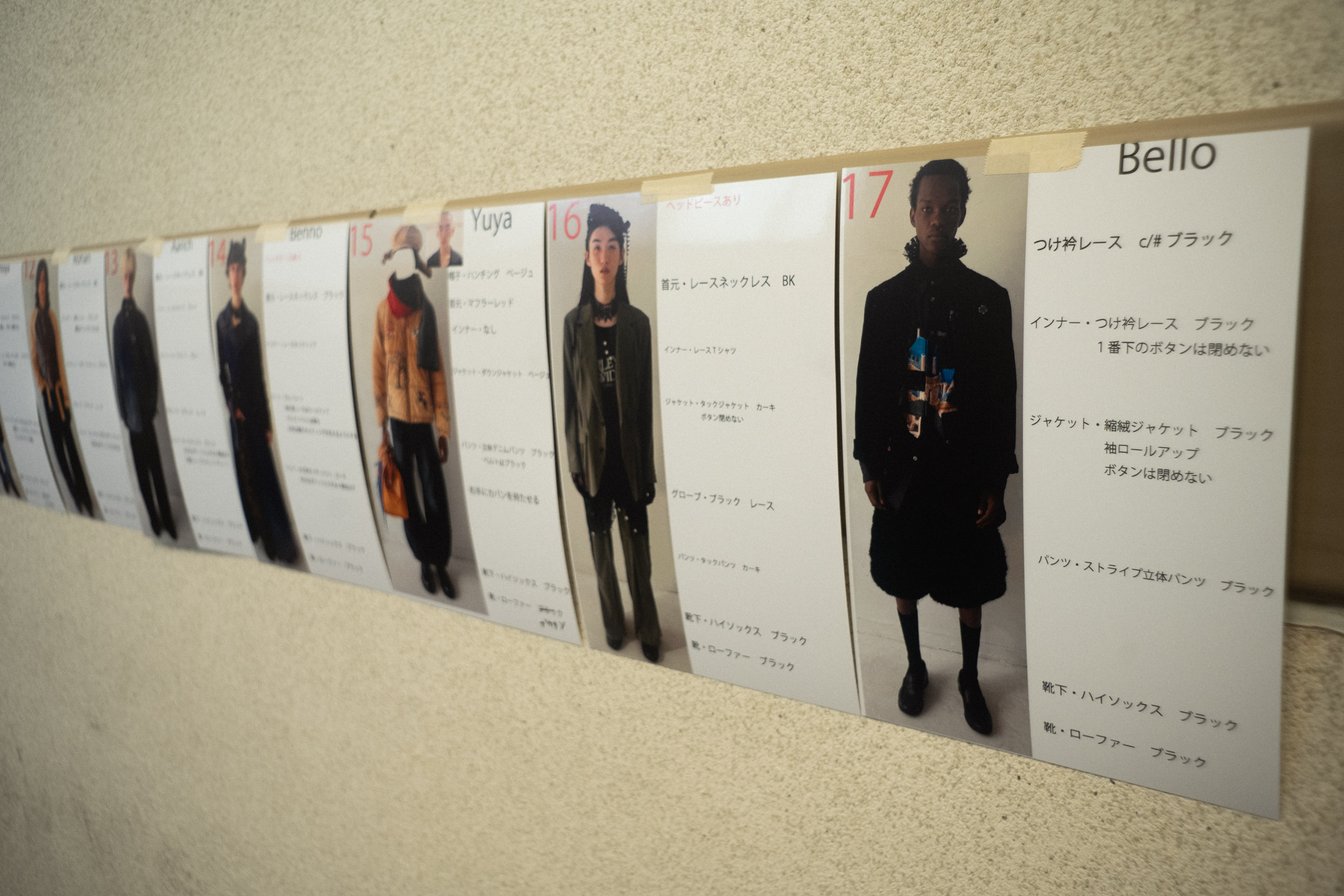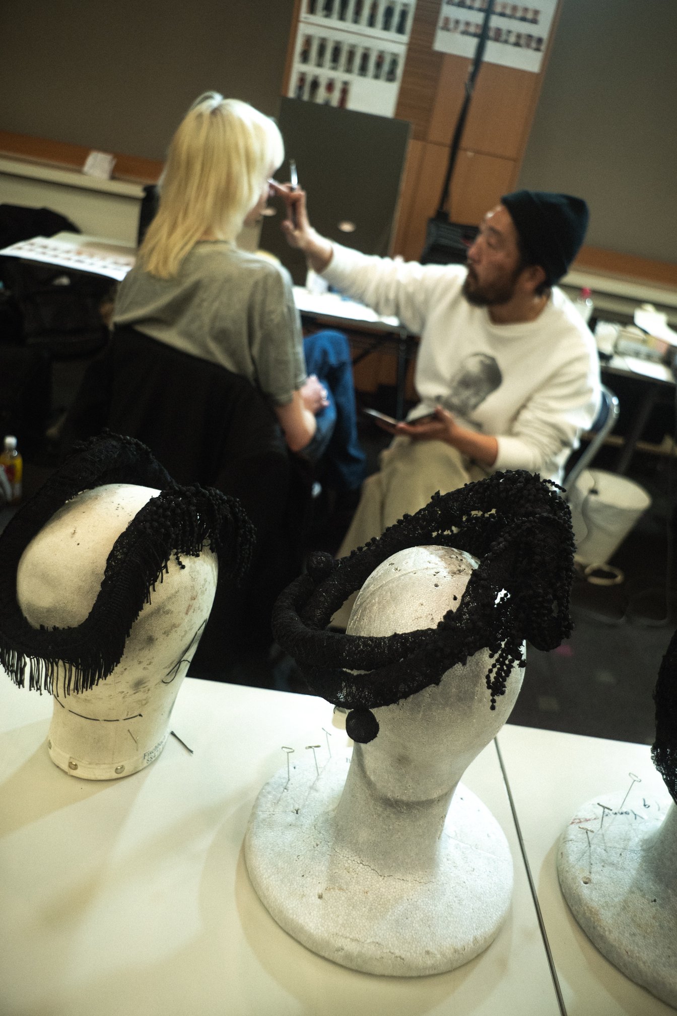 バックステージではスタイリングの仕上げに入る。コッキチームは前日からアドレナリンが出て眠れずに当日を迎えたという。ファーストルックのモデルは今回が初来日。やや緊張の面持ちだ。ヘッドピースの調整では、パーツをカットしたり、取り外したりと大胆な変更も続く。