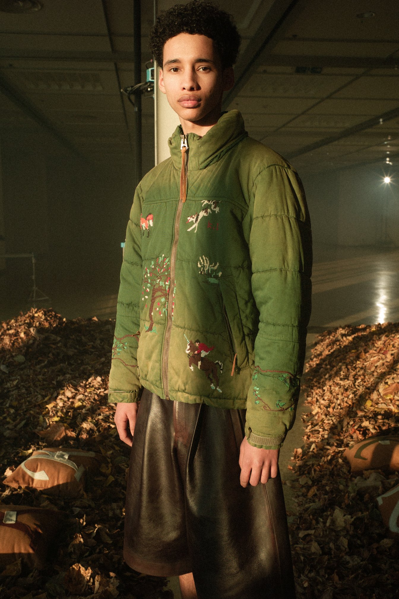 微調整が重ねられた枯葉の山はより自然な稜線を描きリアリティを増していた。ランウェイから周辺一体に広がる森の風景を見渡すと、「ノスタルジック」の一言で片付けてしまうのはあまりにも惜しいほどの言い得ないに感情が押し寄せる。童心に返って枯葉の山に飛び込みたくなるようなふとした郷愁や心細さ、自然に対する恐怖と恍惚、そういったものに限りなく近い純粋な服。子どものような好奇心や、ファッションへのただひたむきな情熱で服を作り続けてきたコッキの、ピュアで生々しい衝動衝動がストイックな姿勢の下で形になる。コッキが追求する美しい景色に、そうしたものを重ねた。