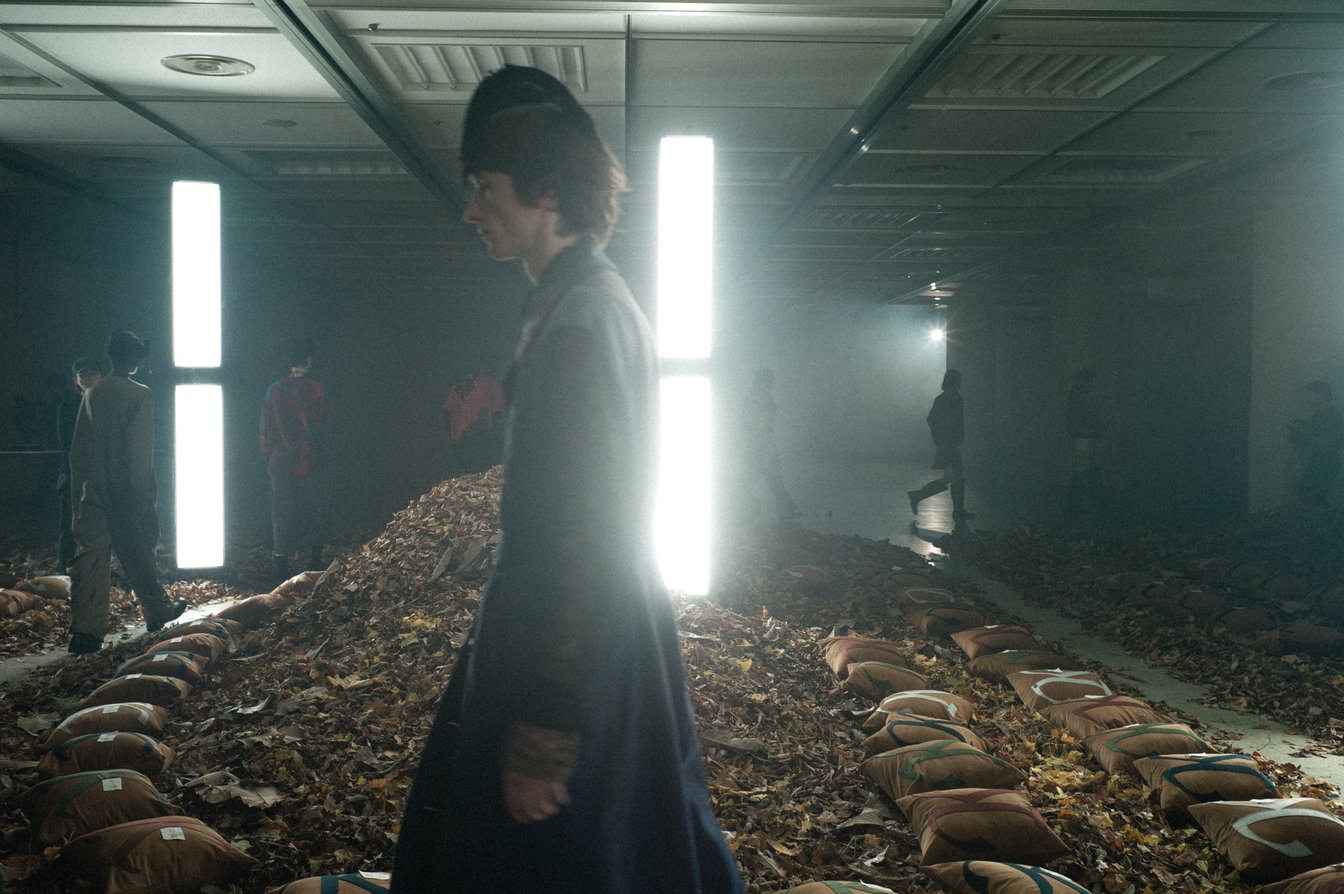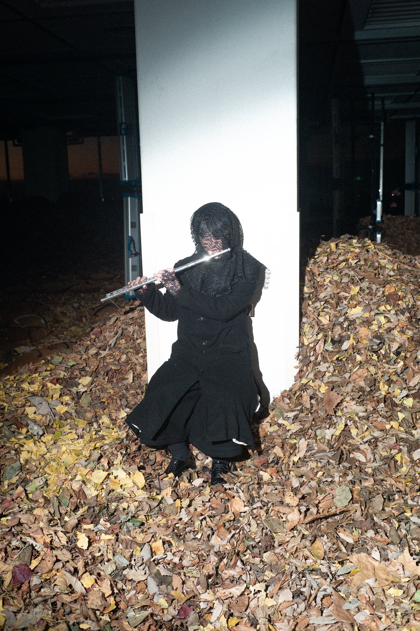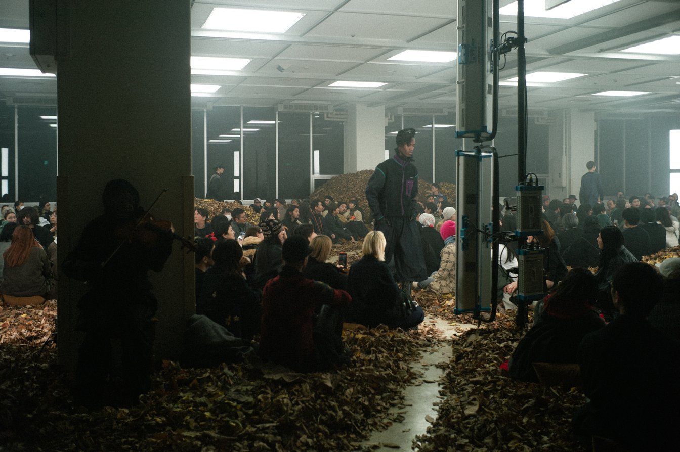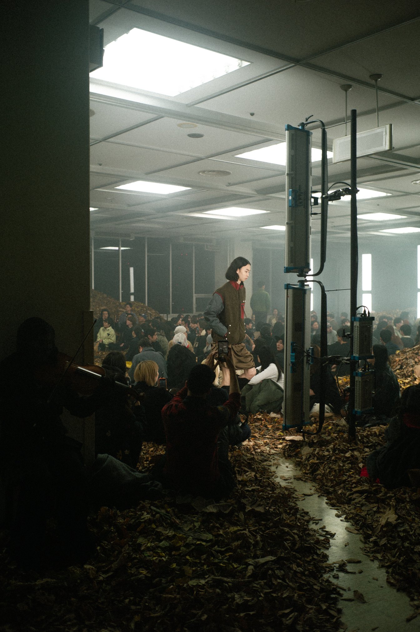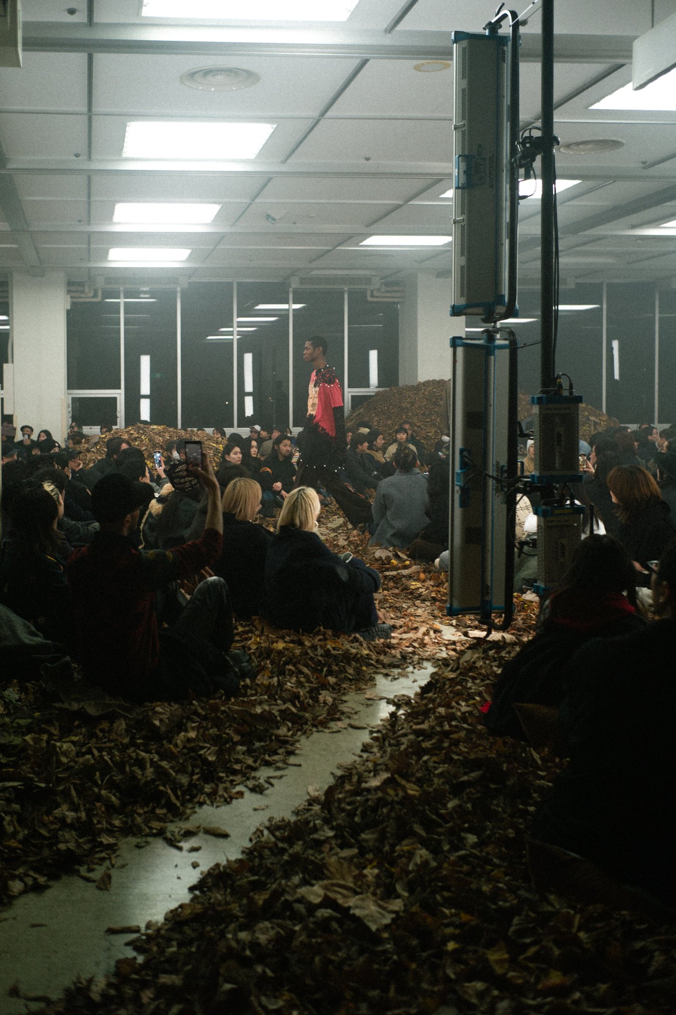 600箱の枯葉の搬入が終わり、次々とダンボールが開封されていく。封を開けるとたちまち、会場は森の中と錯覚するような深い緑の香りに包まれた。枯葉は床に積み上げられ、少しずつ客席を作っていく。音響テストを始めるチーム、照明を組み立て続けるチーム、大量の枯葉を地面に敷き詰めていくチーム、大勢が駆け回りながら準備を進める。無機質でがらんどうだった空間は活気を帯び、枯葉の山は、次第に”小さな森”に近づいていく。刹那的に終わっていくファッションショーができるまでに、どれだけの人の手とこだわりが詰まっているのだろうか、思いを馳せずにはいられない。