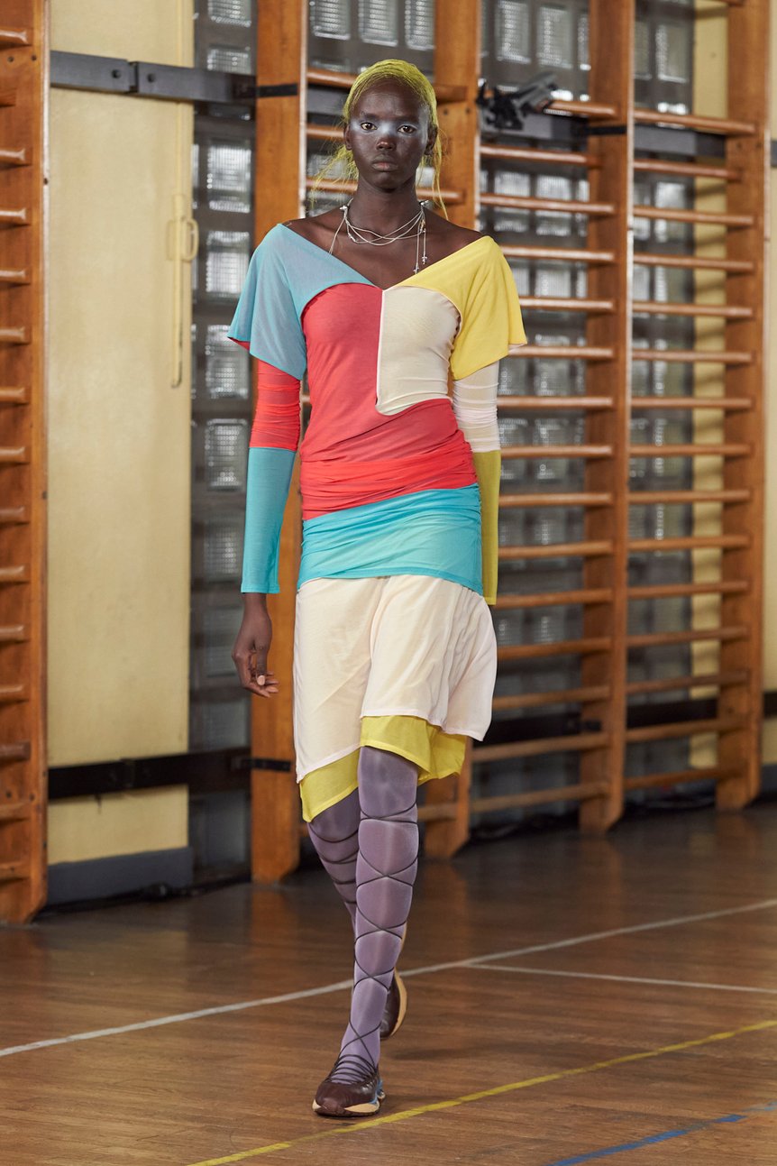 コスタディノフが世界的に注目されるきっかけとなったのは、ロンドンの名門セントラル・セント・マーチンズ(以下、セントマ)在学中に取り組んだ、ストリートウェアのパイオニア「ステューシー(STÜSSY)」とのカプセルコレクションだった。アーティストのリチャード・セラ(Richard Serra)からインスパイアされた、円形の切り替えを取り入れたトップスは、今見てもシンプルなテクニックで存在感を発揮させたデザインが見事である。