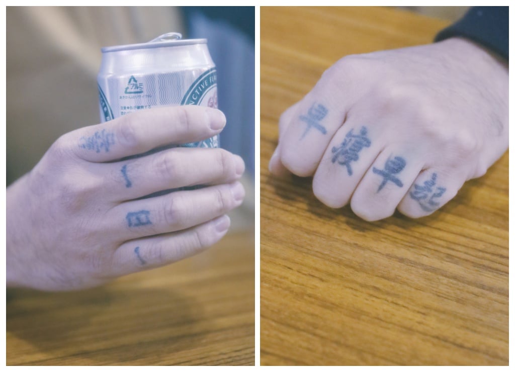 松本さんの関節に彫られたタトゥー。「ナックルタトゥーって、みんな汚い言葉を彫りがちだから、俺はあえて優しくていい言葉を彫ろうと思って(笑)」