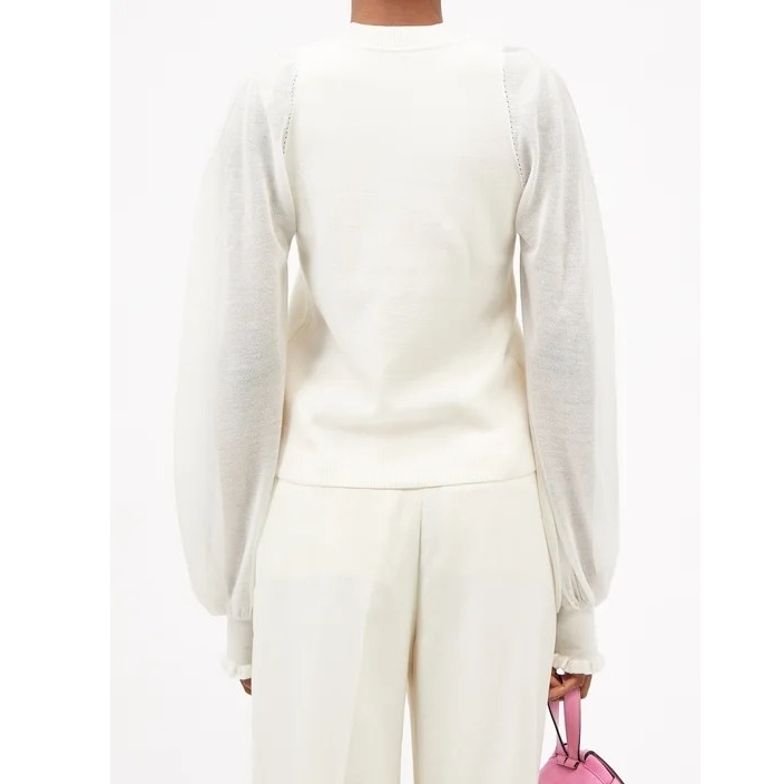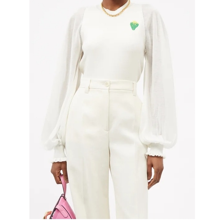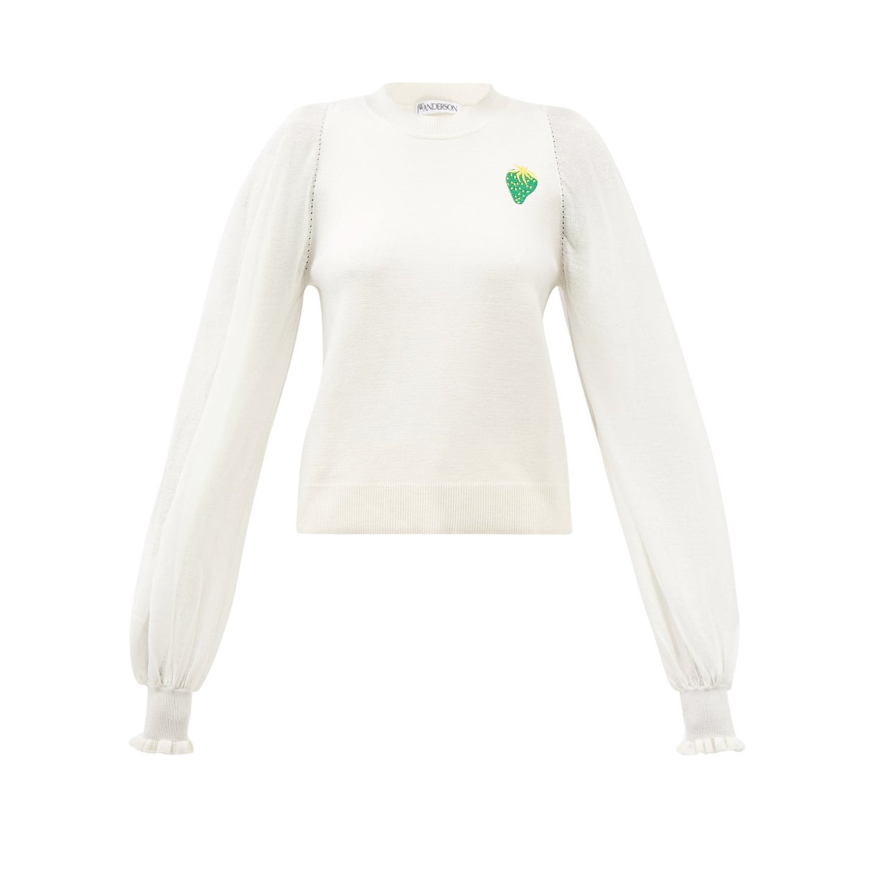 中厚手のボディとセミシアーの袖を組み合わせた「J.W. アンダーソン(J.W. ANDERSON)」のフェミニンなニット。肌触りが良く、保温性の高いメリノウールで編み上げ、胸元の苺でポップさを添えたキュートなデザインが乙女心をくすぐる一着。
