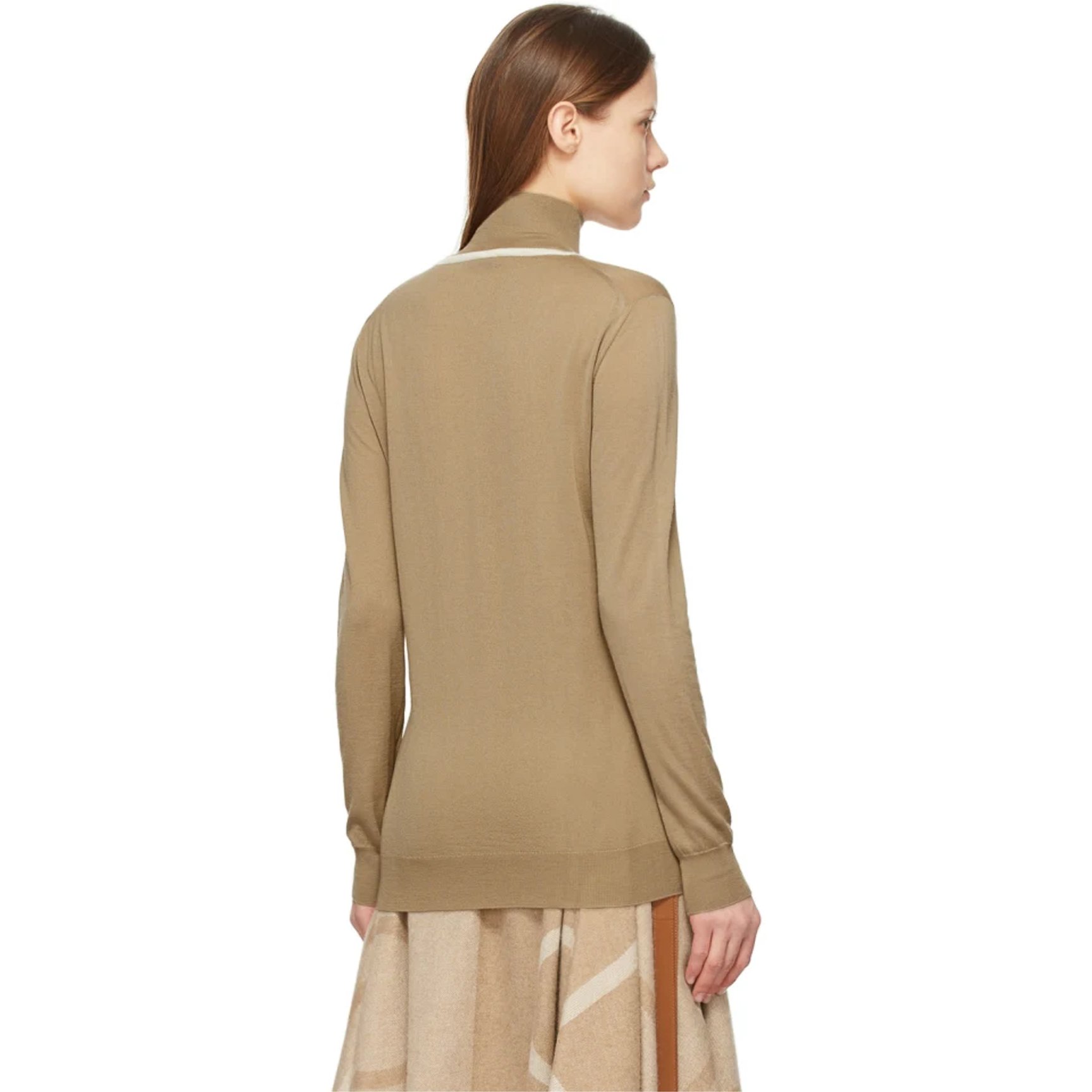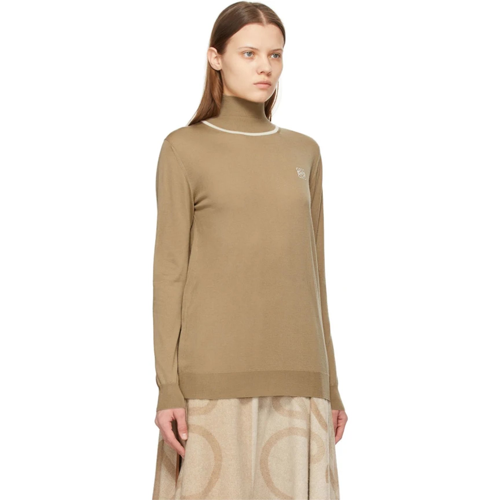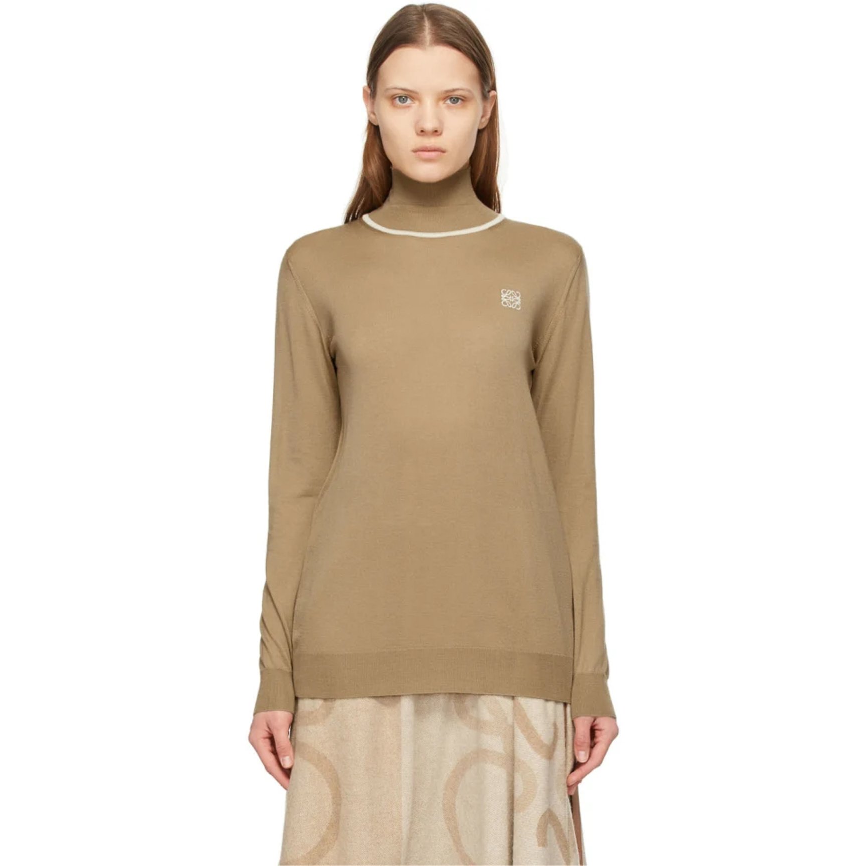 カシミアの滑らかな肌触りが心地よい「ロエベ(LOEWE)」のタートルネックニット。体に寄り添うスリムフィットシルエットで、胸元にはさりげなくアナグラムの刺繍をON。落ち着いたキャメルカラーと差し色のホワイトで上品な印象に。