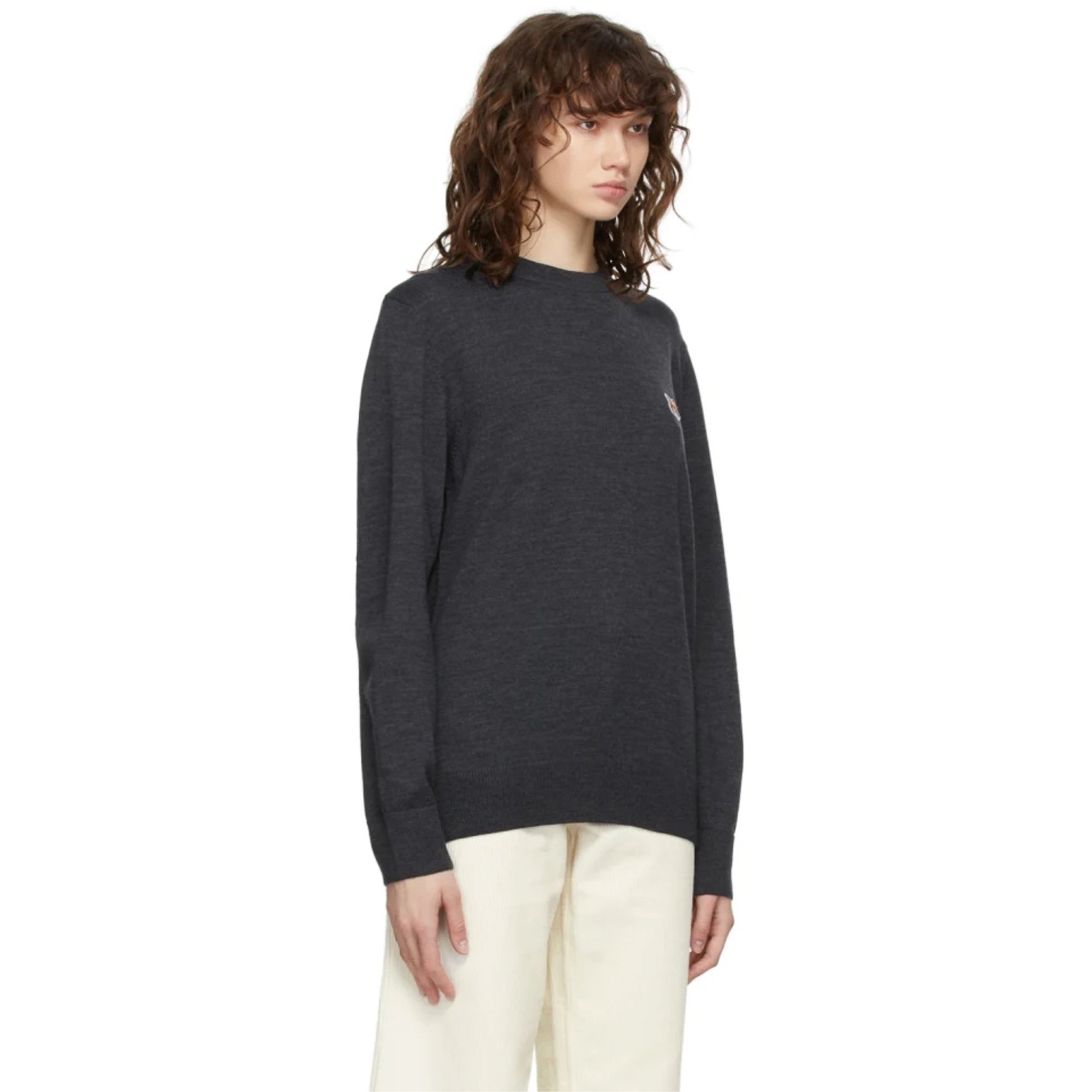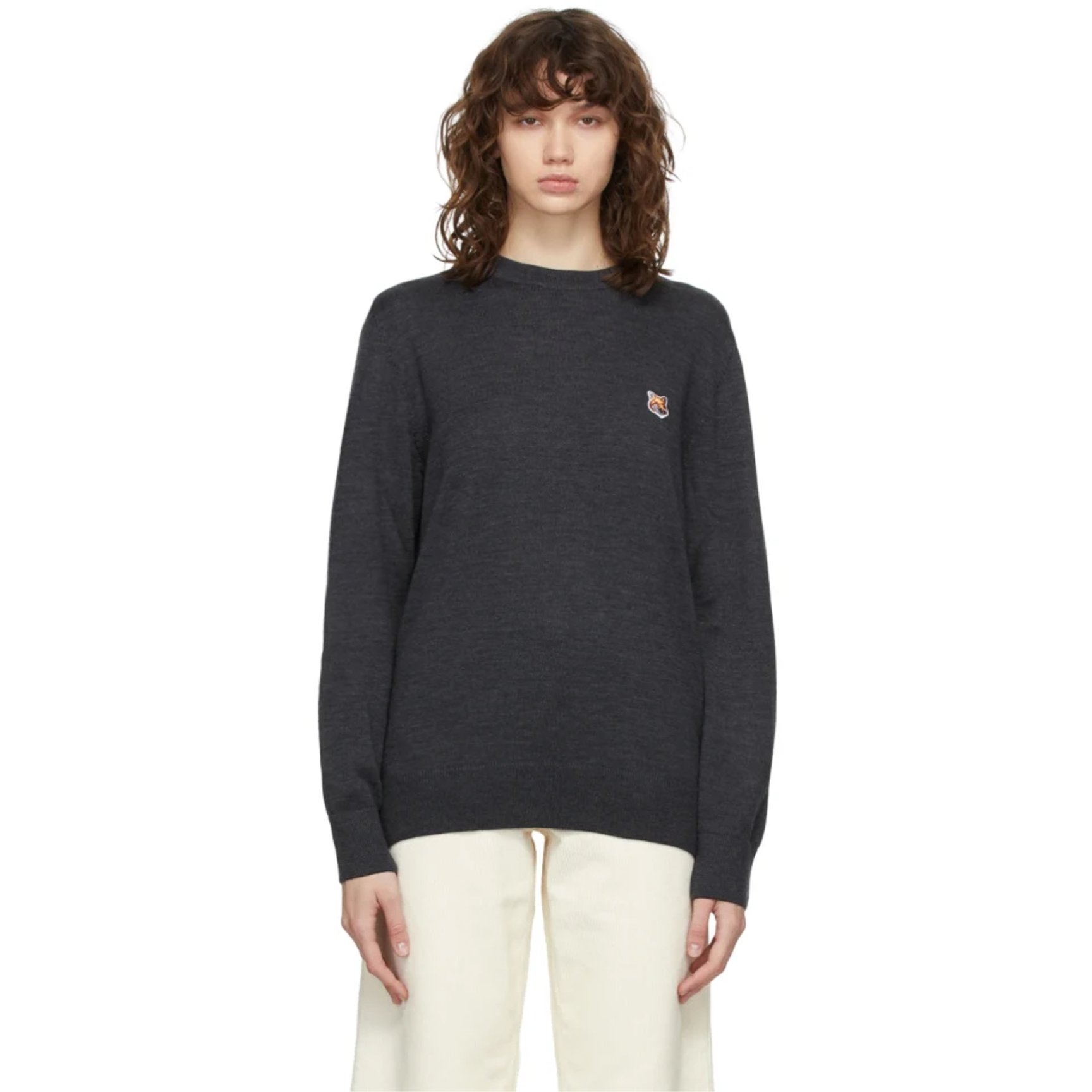 ブランドを象徴するフォックスヘッドの刺繍を胸元にあしらった「メゾン キツネ(MAISON KITSUNÉ) 」のシンプルなグレーのニット。タイムレスで楽しめる、フレンチブランドらしいエスプリの効いたデザインはデイリー使いにぴったり。