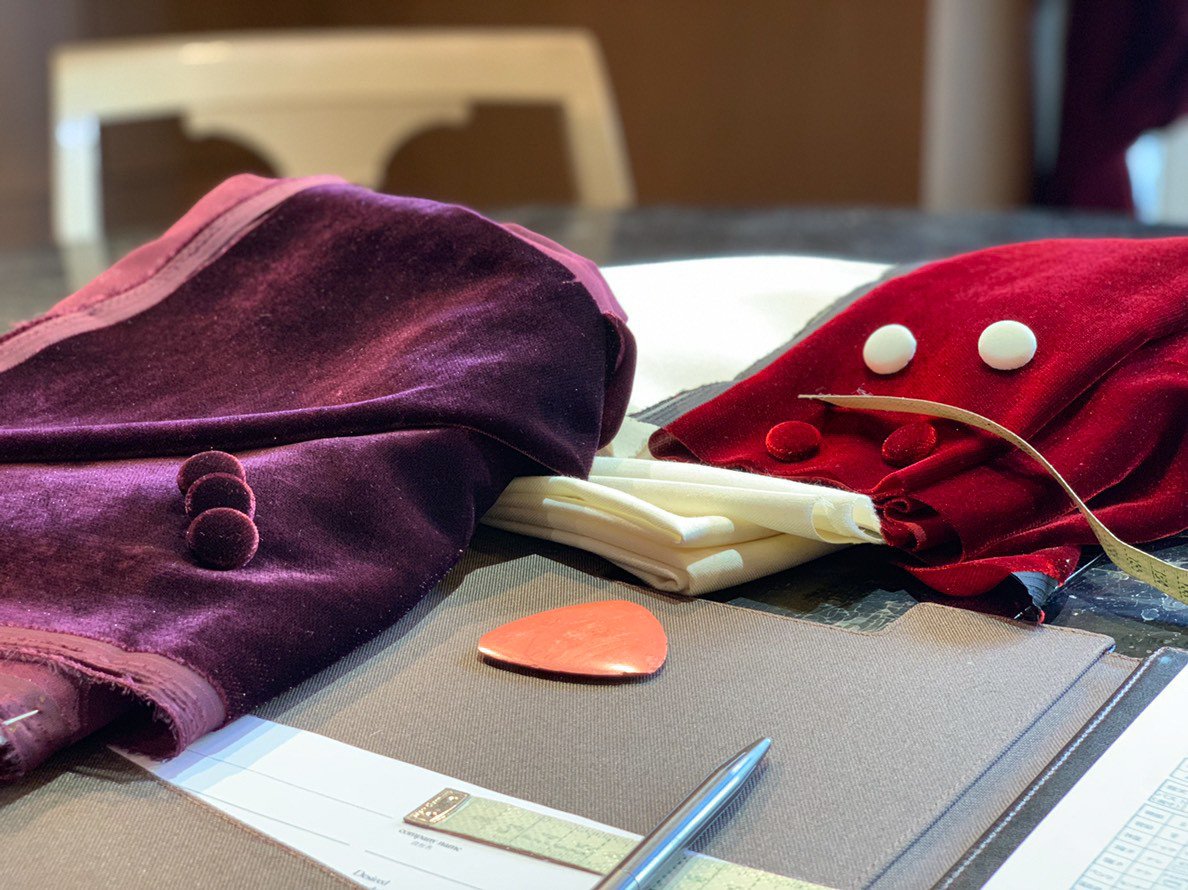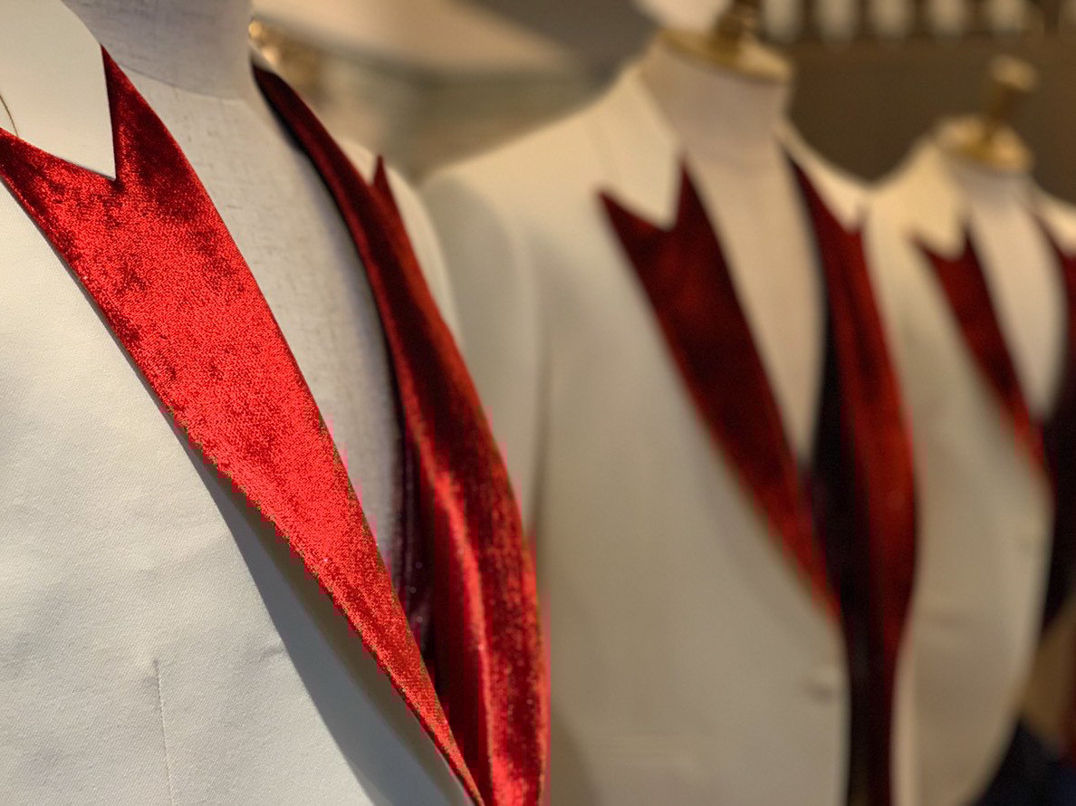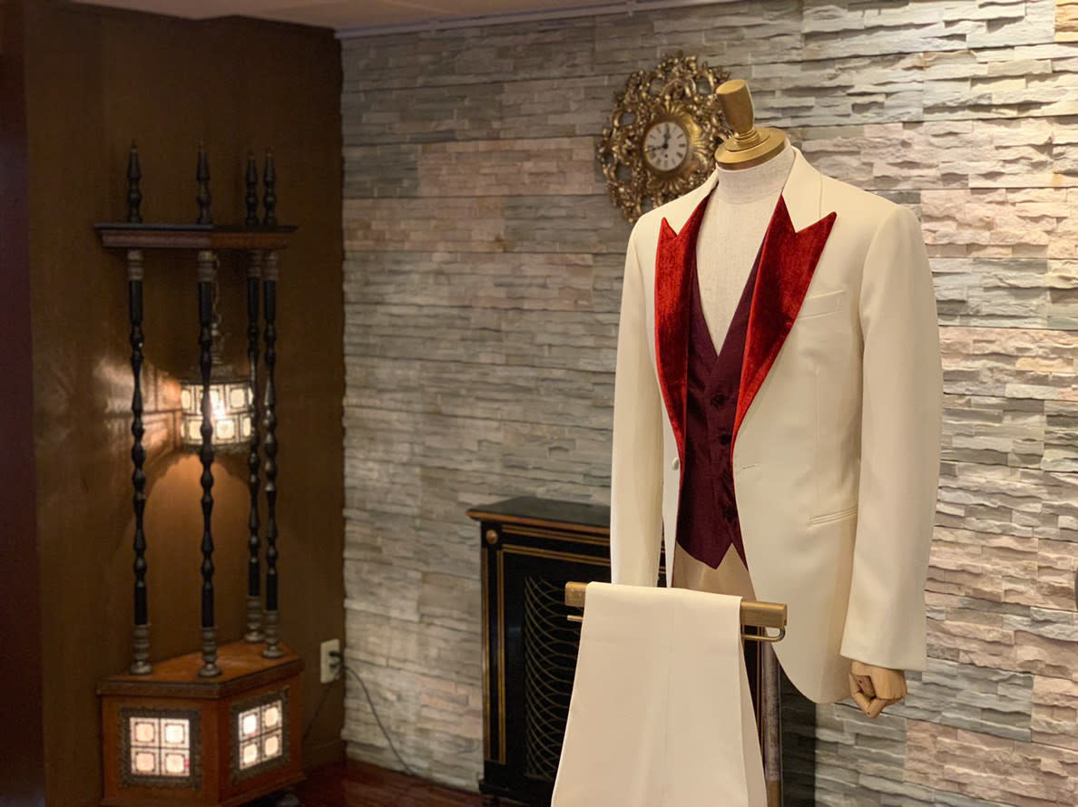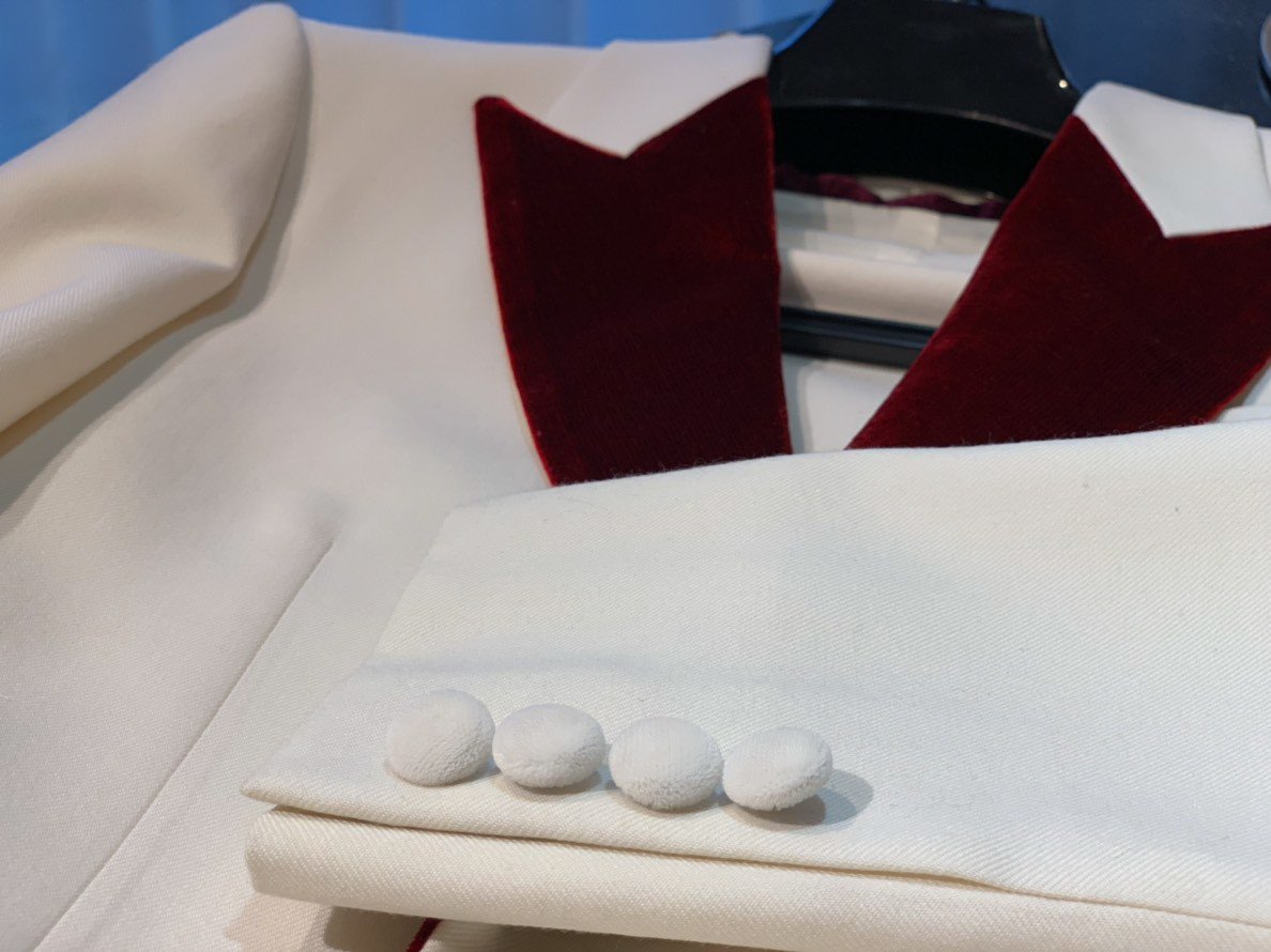 そして白組のトリとなったステージでは、紅白スペシャルメドレーを5人で披露しました。着用した3ピースのタキシードを仕立てたのは、南青山にあるオーダースーツ専門の「ドット・テーラー(DOT・TAILOR)」。純白のウール地をベースに、ジャケットのラペルは鮮やかな赤でベルベットのラメ入り。ベストはパープルのベルベット地。クライマックスにふさわしいクラシックな装いです。スタイリストは丸本達彦さんが担当しました。